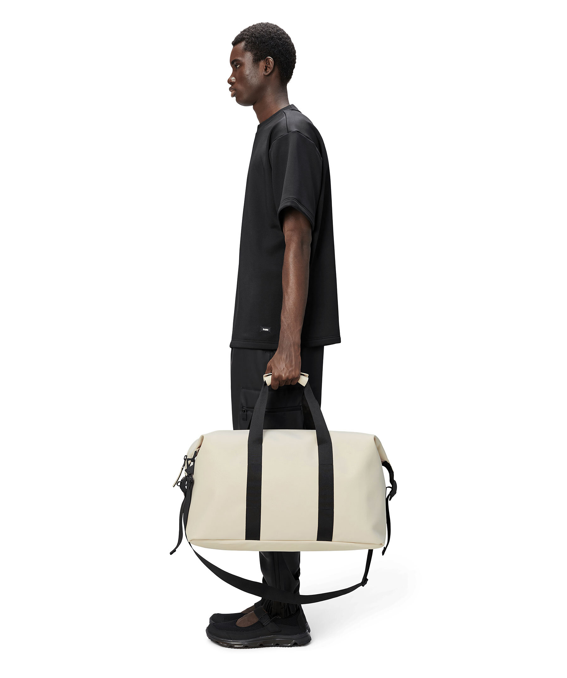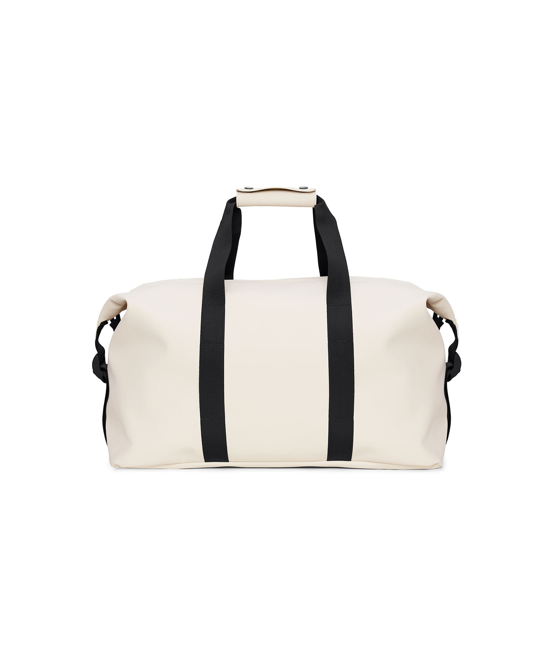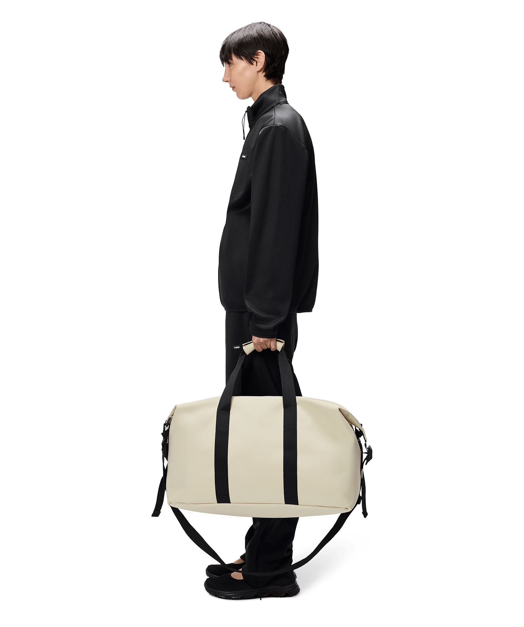 Ljus sandfärgad weekendbag från Rains i vattentättyg. Väskans huvudfack stängs med dragkedja. Vävt bärhandtag, justerbart axelband och kompressionsremmar. Subtil logotyp på utsidan. Väskans mått: H 27cm x B 52cm x D 26 cm. Rymmer 36L.