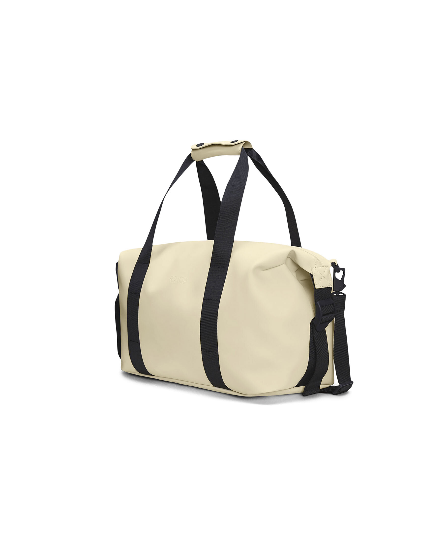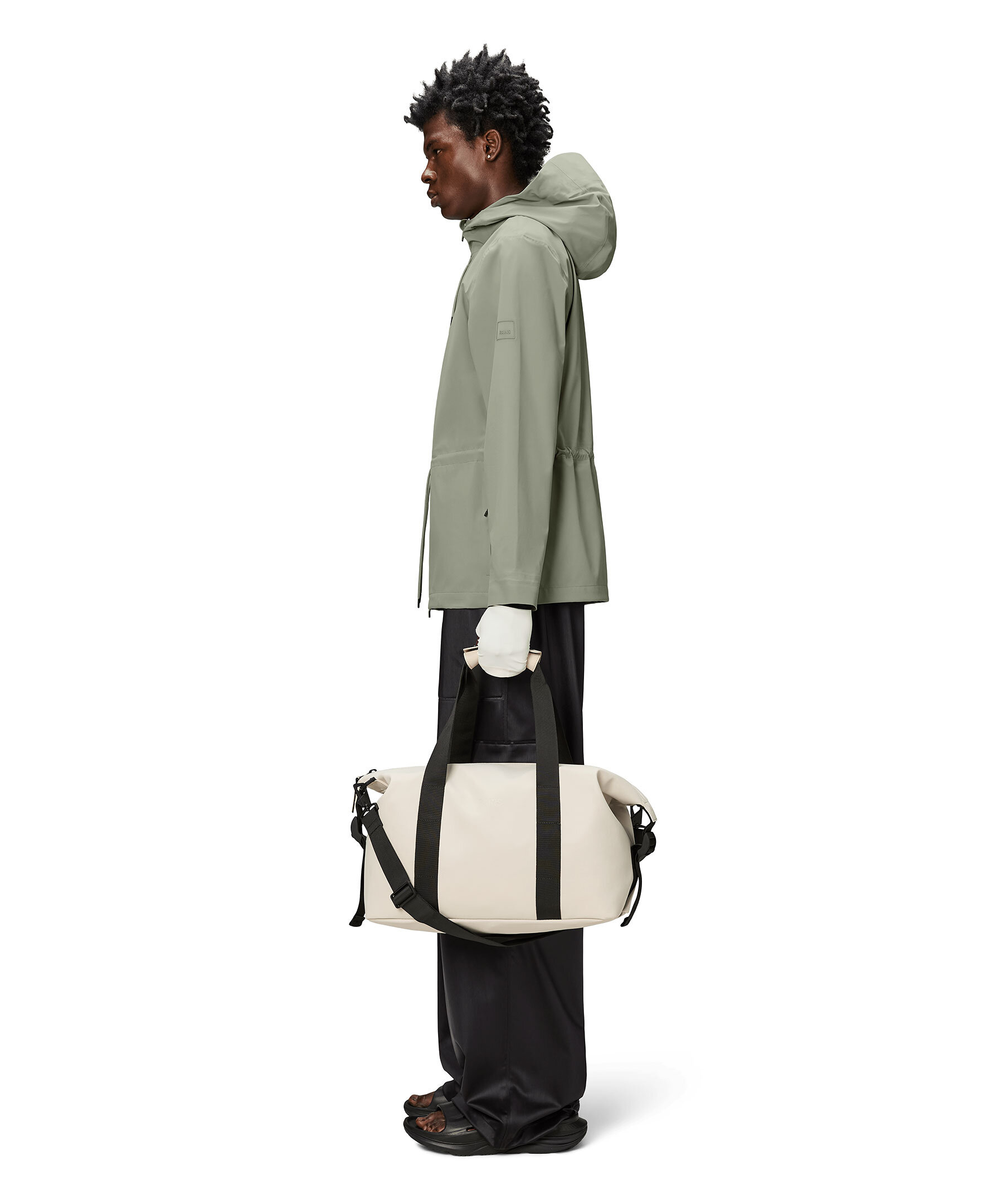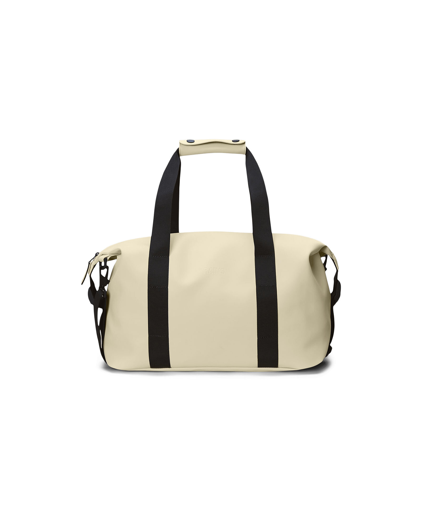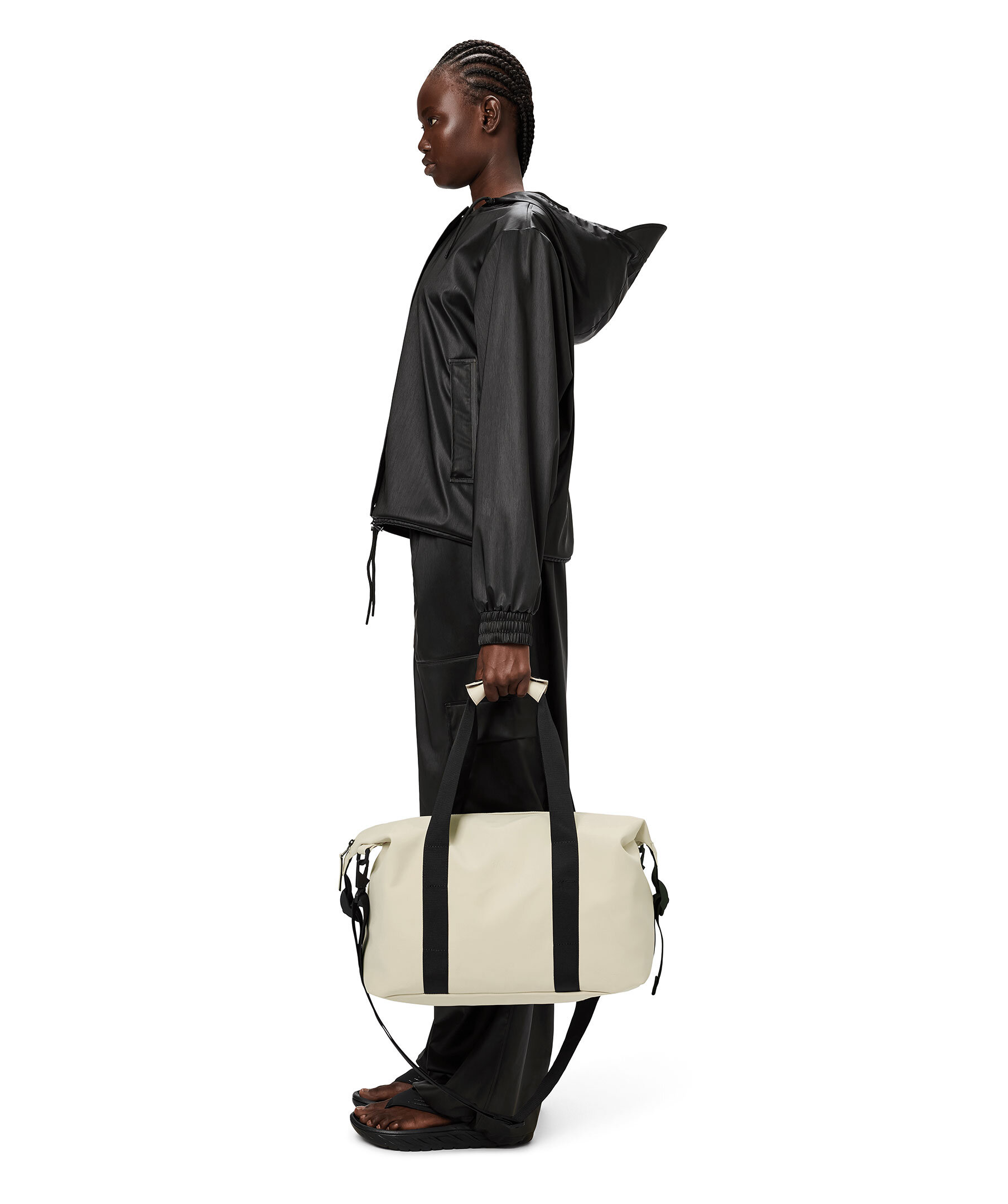 Ljus sandfärgad väska från Rains. Väskan stängs med en gummerad dragkedja som leder till ett rymligt huvudfack med plats för kläder, teknik och mer. När du har packat kan du säkra dina tillhörigheter med väskans sidmonterade kompressionsremmar. Den har ett vävt bärhandtag med komfortrem och fästringar för en medföljande avtagbar axelrem. Tillverkad i Rains vattentäta PU-signaturtyg. Mått: H23 x D20 x B40 cm. Rymmer 18L.