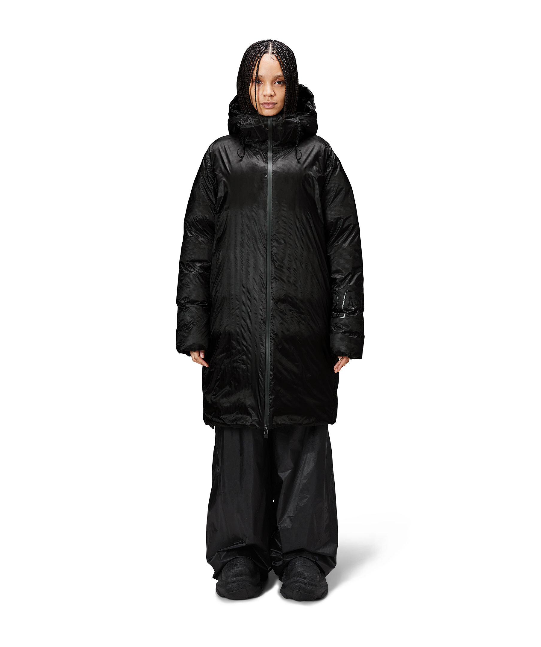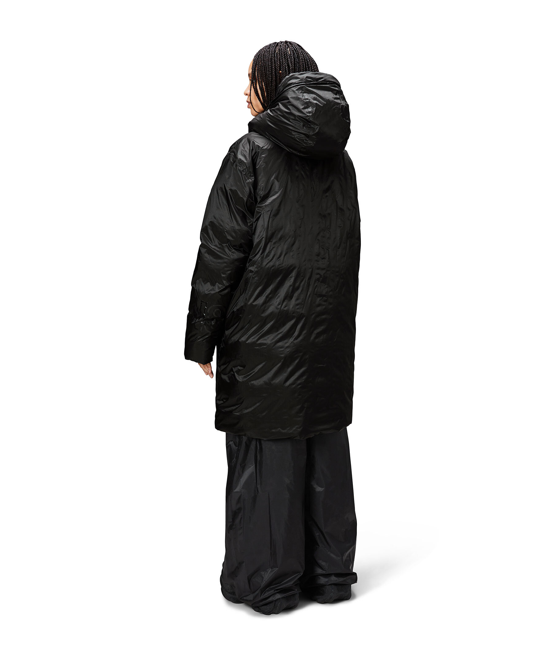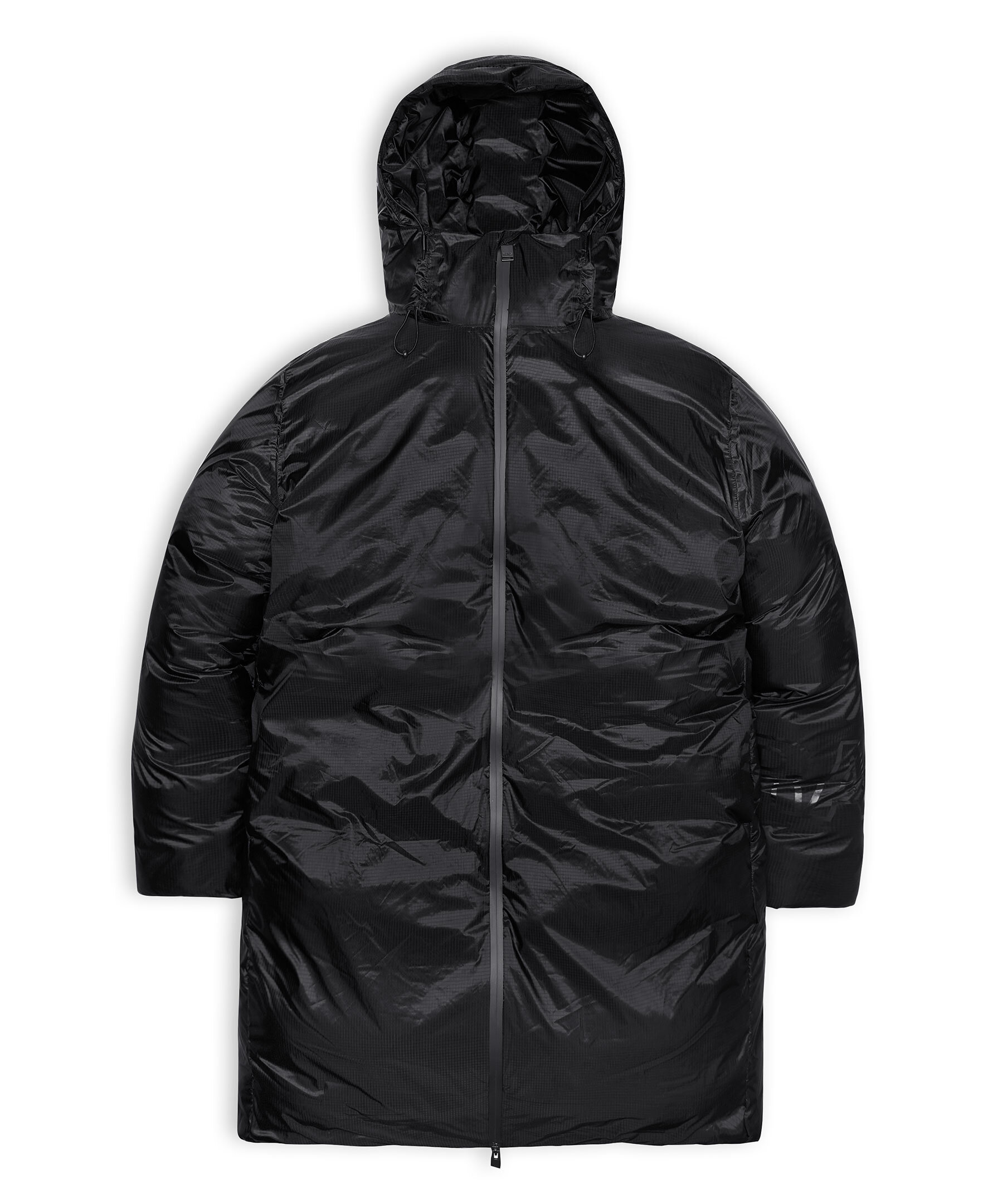 Svart lång puffer jacka från Rains. En vattentät vinterjacka med en lyxigt sportig estetik. För Kevo-serien svänger Rains på den klassiska Puffer-looken. På utsidan hittar du halvgenomskinlig vattentät nylon med beläggning på baksidan. Öppna jackan för att avslöja fjäderlösa pufferkamrar på insidan. Plagget är vattentätt och andas, vilket håller dig varm och bekväm i de kallaste vädren. Jackan har gummerat tvåvägsblixtlås, tejpade sömmar, dolda sidsömsfickor och dolda stormmanschetter i jersey. Silhuetten fulländas av en isolerad huva med ett flertal elastiska dragskor.