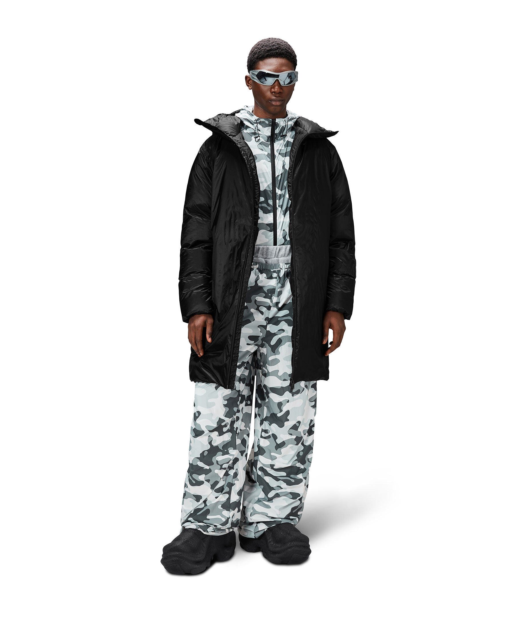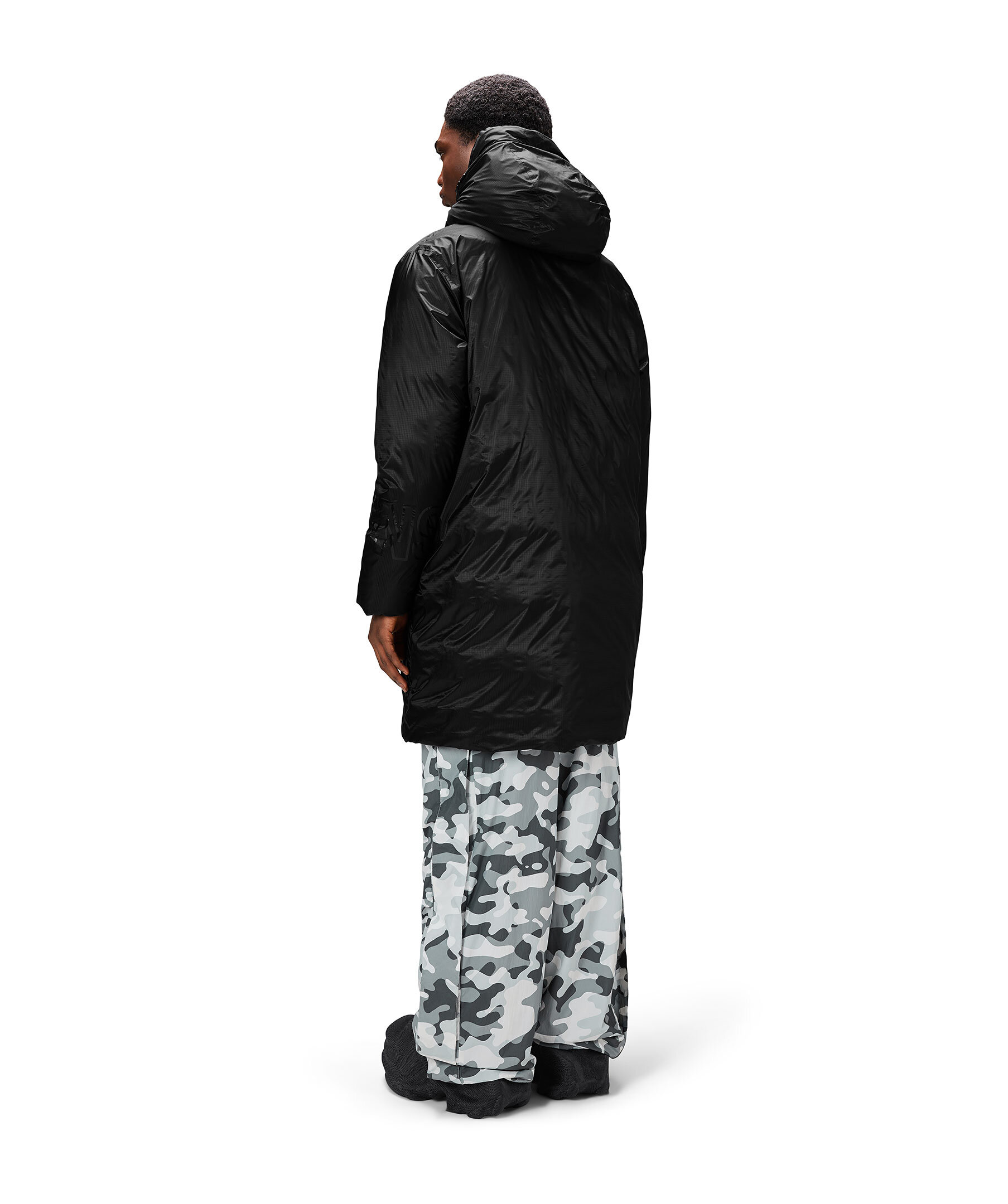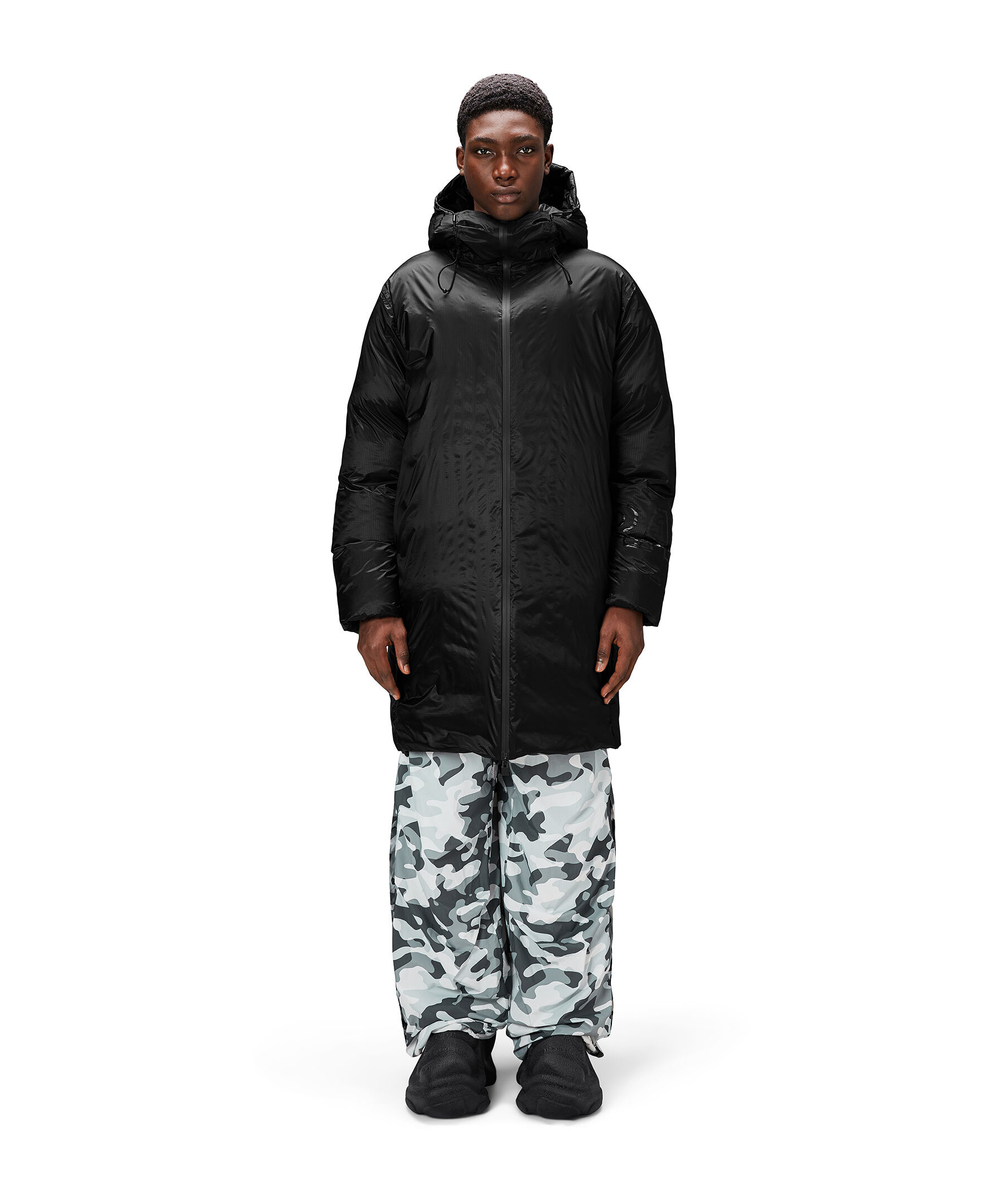 Svart lång puffer jacka från Rains. En vattentät vinterjacka med en lyxigt sportig estetik. För Kevo-serien svänger Rains på den klassiska Puffer-looken. På utsidan hittar du halvgenomskinlig vattentät nylon med beläggning på baksidan. Öppna jackan för att avslöja fjäderlösa pufferkamrar på insidan. Plagget är vattentätt och andas, vilket håller dig varm och bekväm i de kallaste vädren. Jackan har gummerat tvåvägsblixtlås, tejpade sömmar, dolda sidsömsfickor och dolda stormmanschetter i jersey. Silhuetten fulländas av en isolerad huva med ett flertal elastiska dragskor.