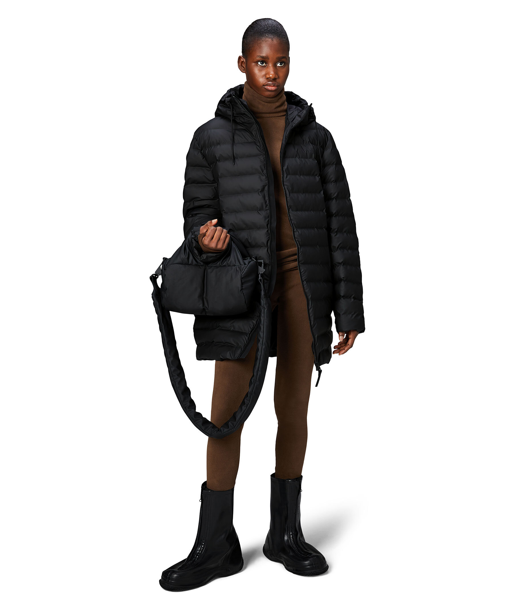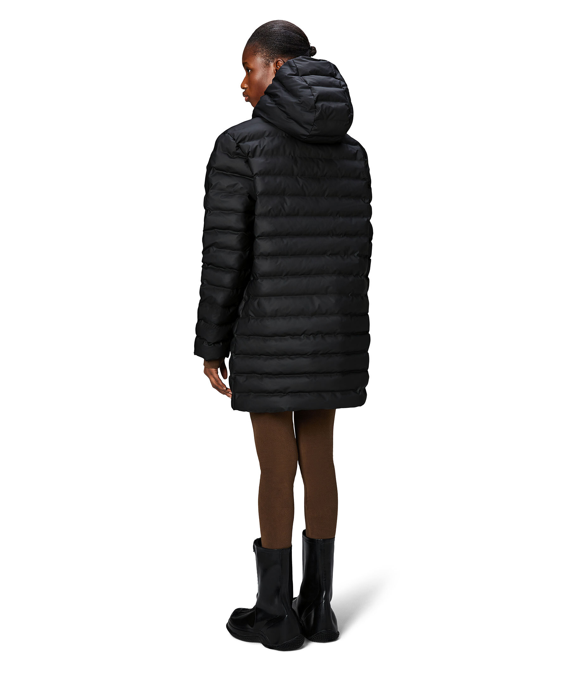 Svart lång Puffer jacka från Rains. Jackan har ett vattentätt skydd mot lätt regn. Lohja serien är de perfekta jackorna vid årstidväxlingar, en enkel jacka med lätt vaddering. Den här lyxiga puffern i vattentätt signaturtyg som andas bygger på fjäderlös kammarteknologi. Jackan har gummerat tvåvägsblixtlås, dubbelsvetsade sömmar, dolda fleecefodrade sidfickor, tekniska stormmanschetter och inre bröstficka. Silhuetten har fodrad huva med dragskojustering.