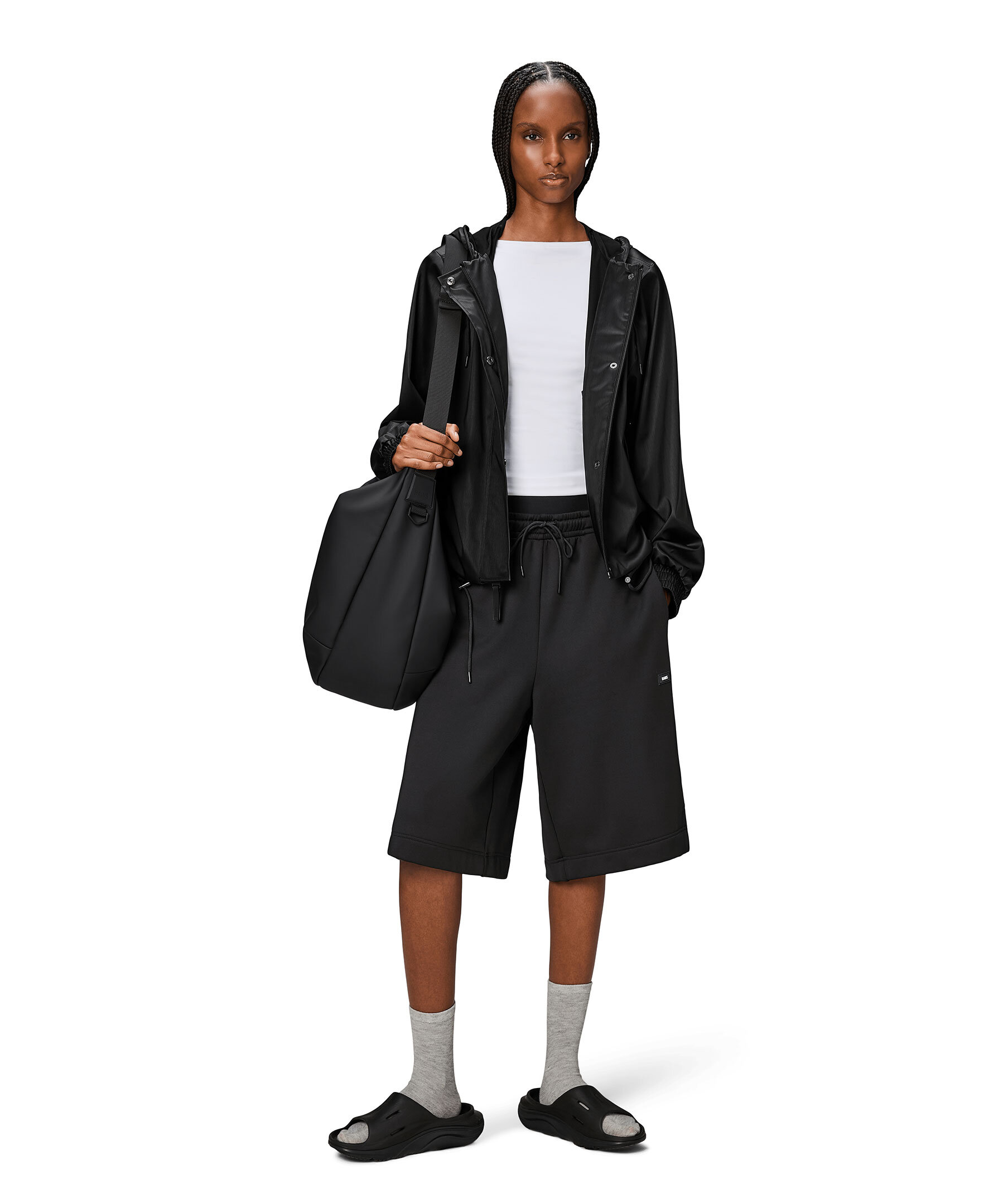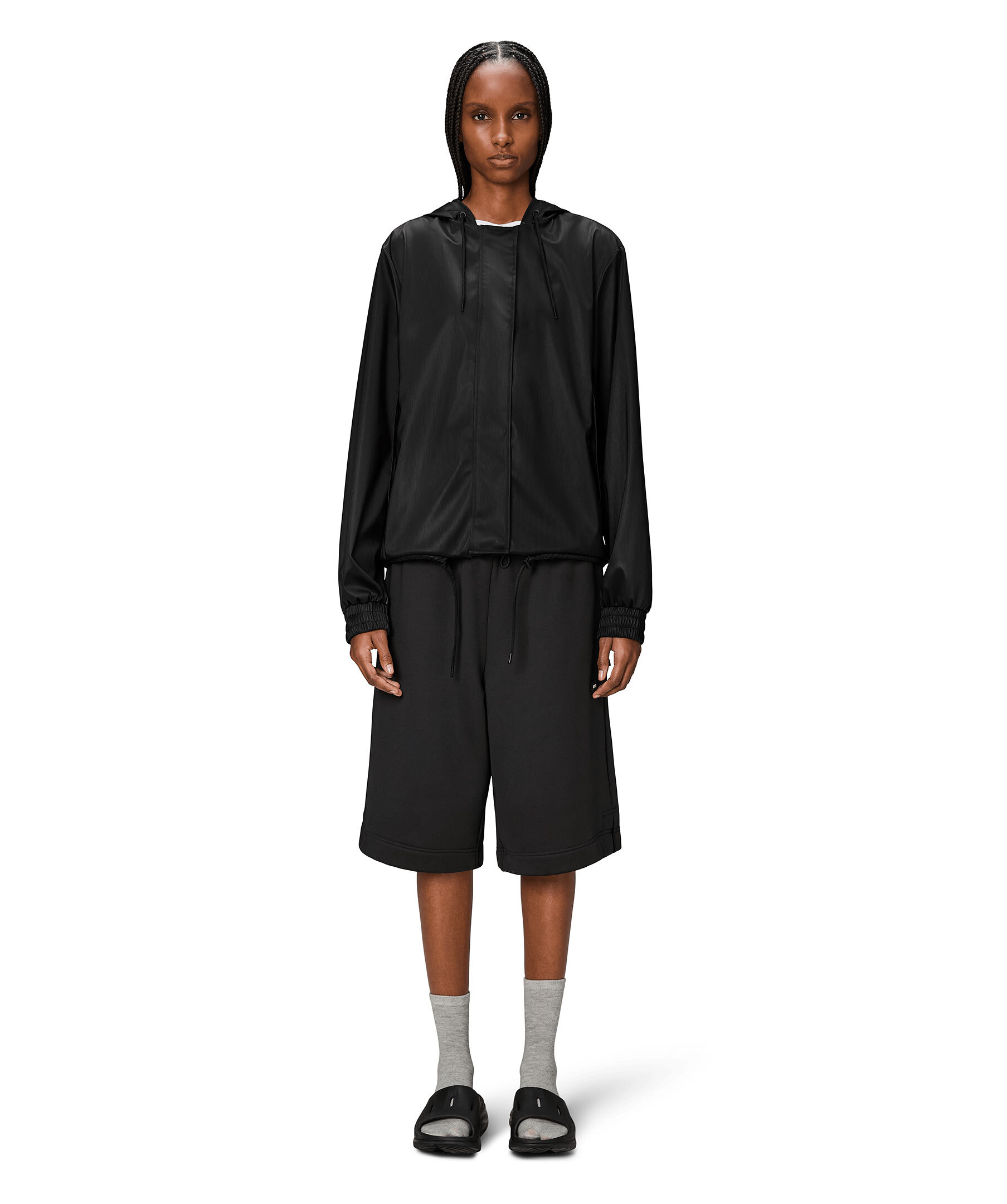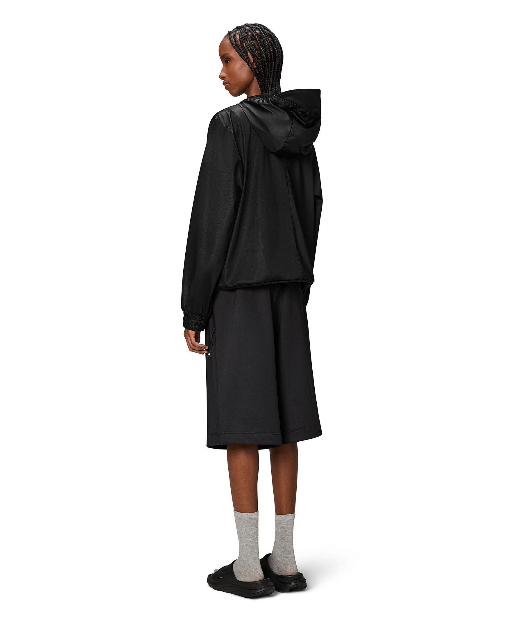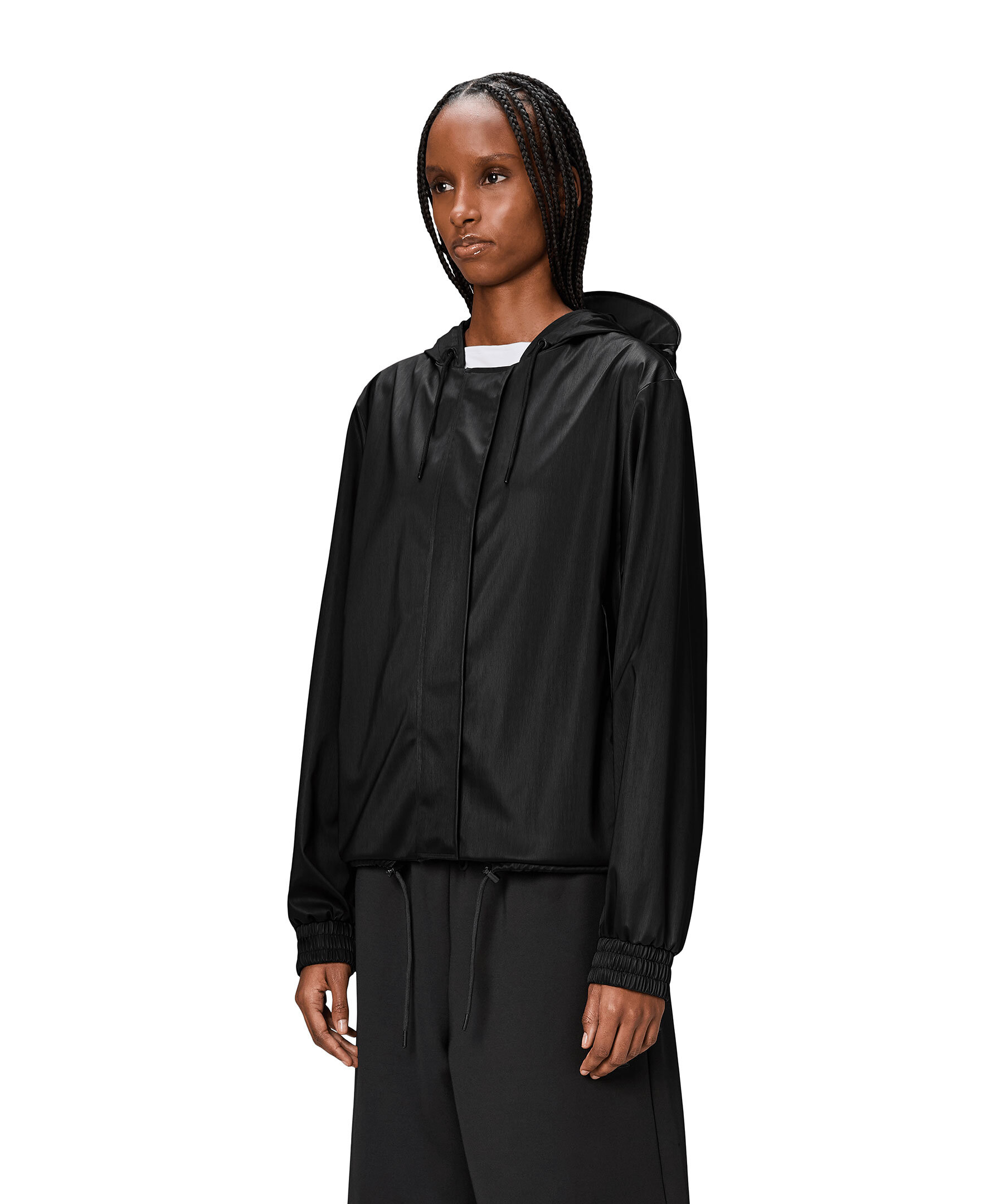 Svart jacka med subtil struktur från Rains. String W Jacket är en beskärd regnplaggssilhuett med lös kortare passform. Plagget har elastiska manschetter, diagonala framfickor och armhålsöljetter för ventilation. Silhuetten kan ändras med hjälp av dragskofållen, medan en knappslå med tryckknappar och en signaturhuva med kepsbrätte fulländar looken. Den här vattentäta jackan tillverkas i Rains PU-signaturtyg med ultraljudsförseglade sömmar. Den har en lättviktsfinish med mjuk yta och snyggt fall.