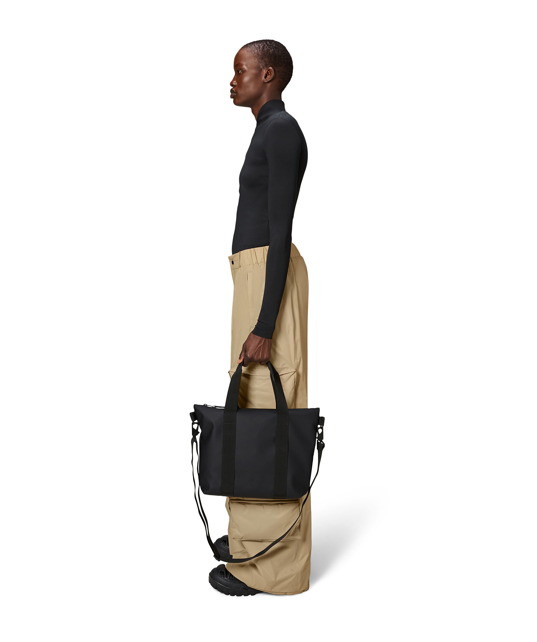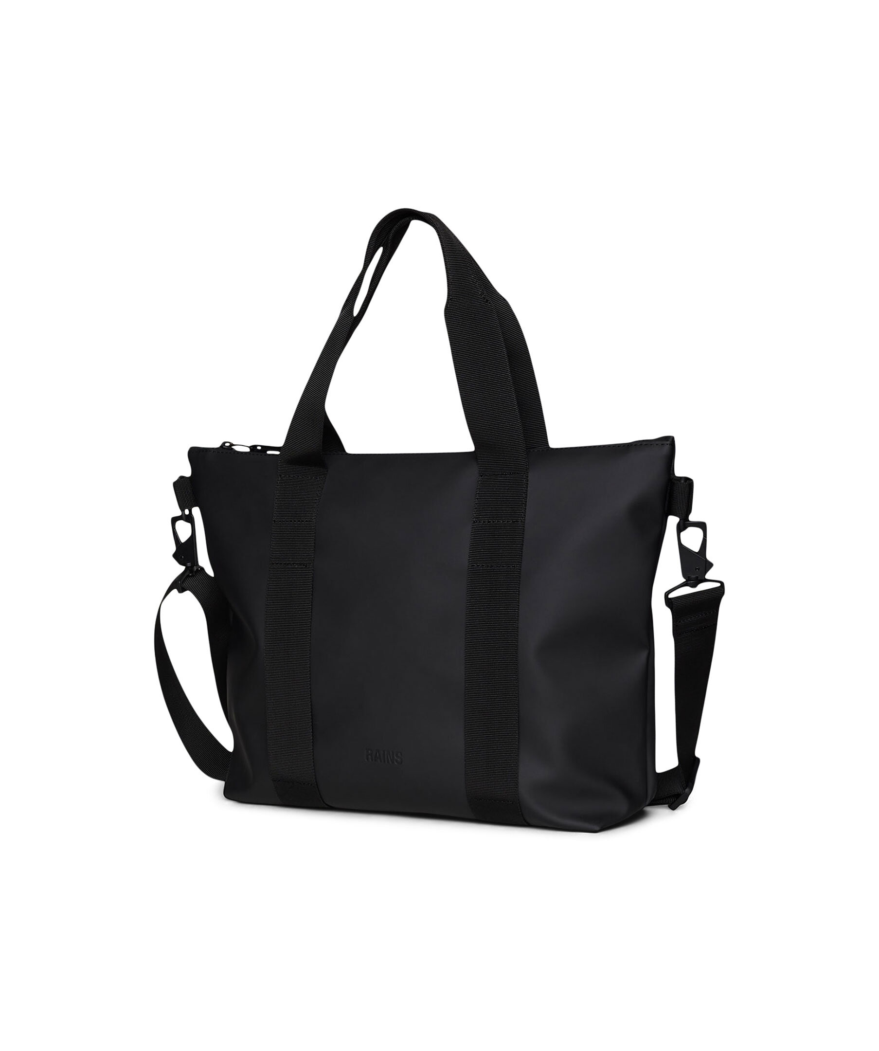 Svart liten totebag i vattentätt tyg från Rains. Väskans huvudfack stängs med dragkedja. Vävda bärhandtag, avtag- och justerbar axelrem. Väskans mått: H 28 x B 36 x D 8 cm. Väskan rymmer 8,1L.