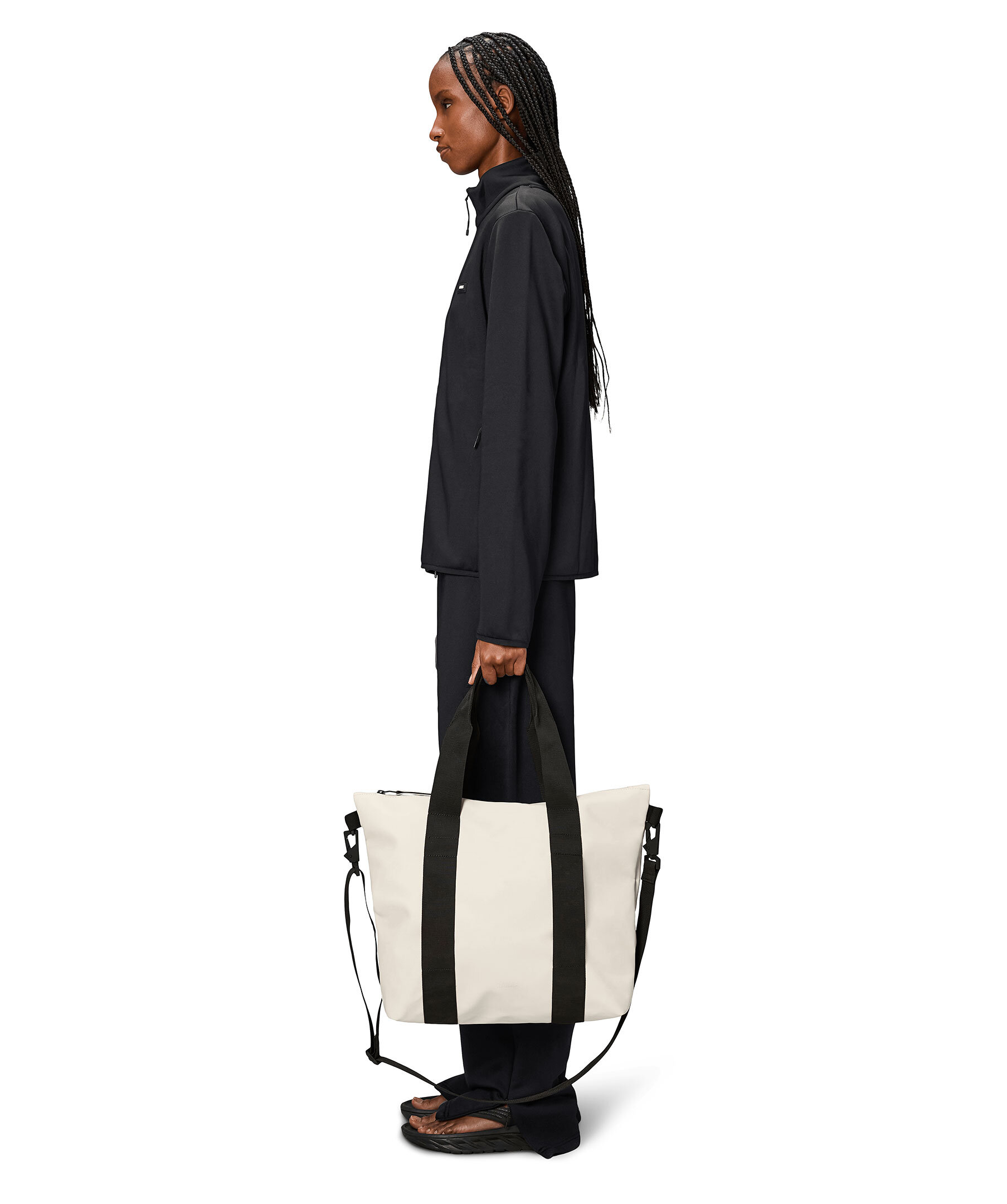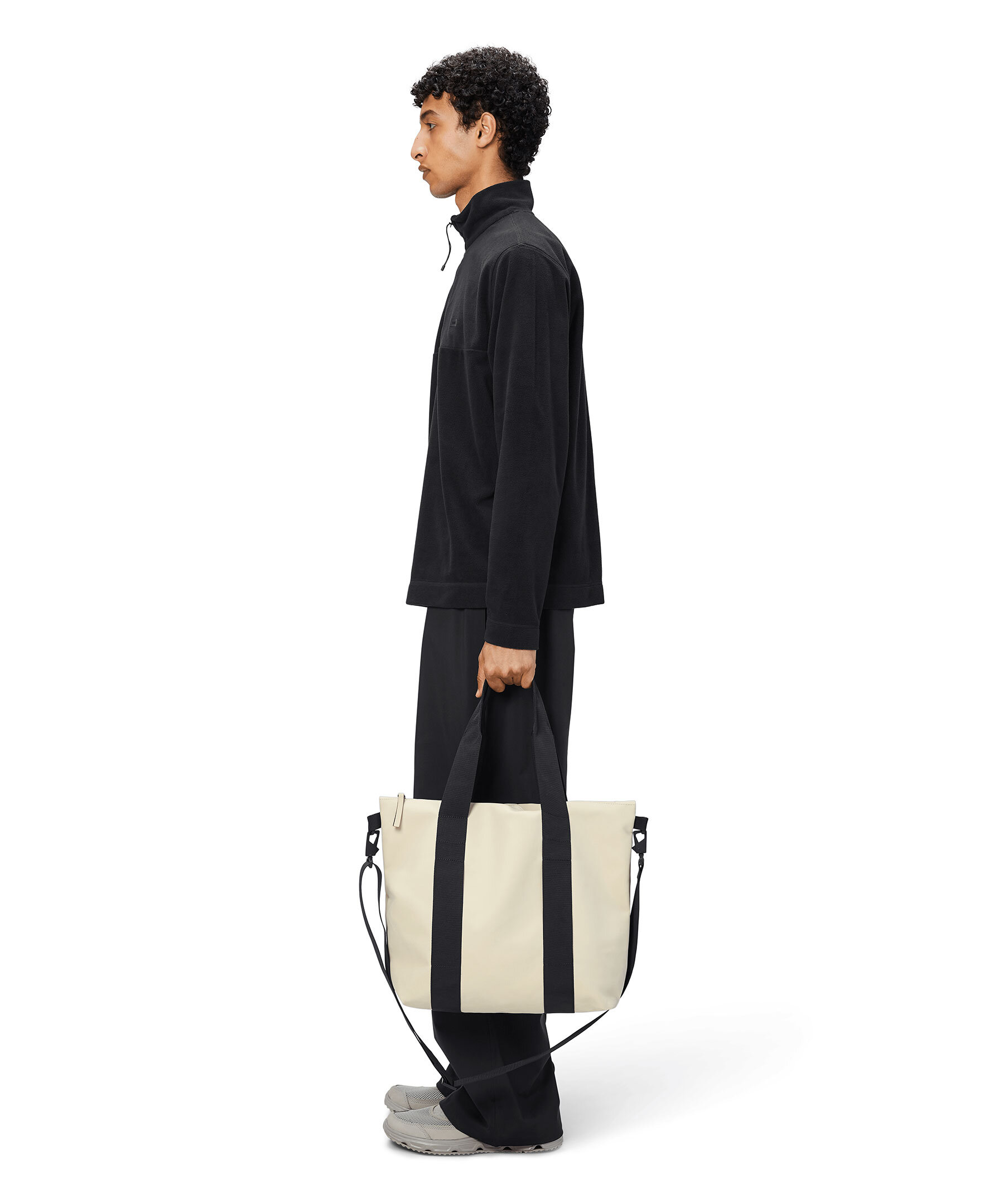 Ljus sandfärgad, liten totebag i vattentätt tyg från Rains. Väskans huvudfack stängs med dragkedja. Innerfack som stängs med dragkedja. Vävda bärhandtag, avtag- och justerbar axelrem. Väskans mått: H 36 cm x B 35 x D 13cm. Rymmer 16L.