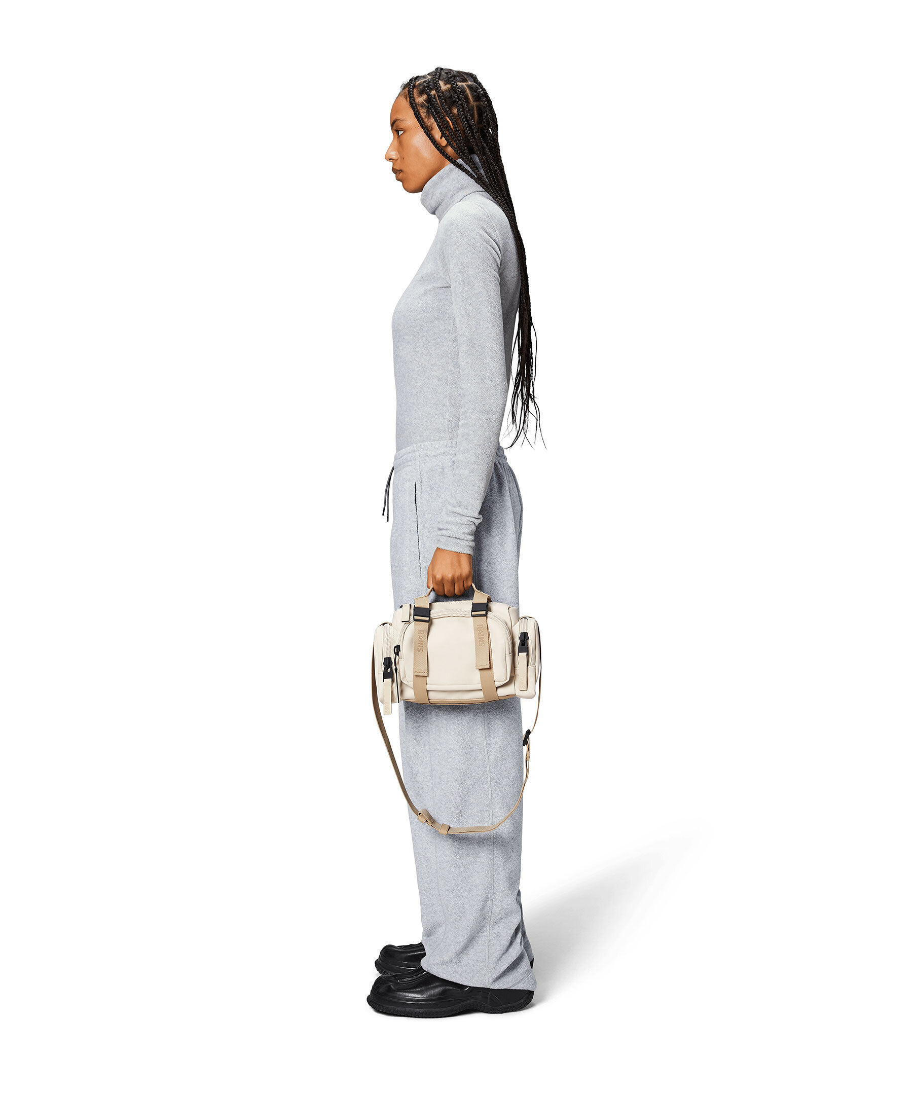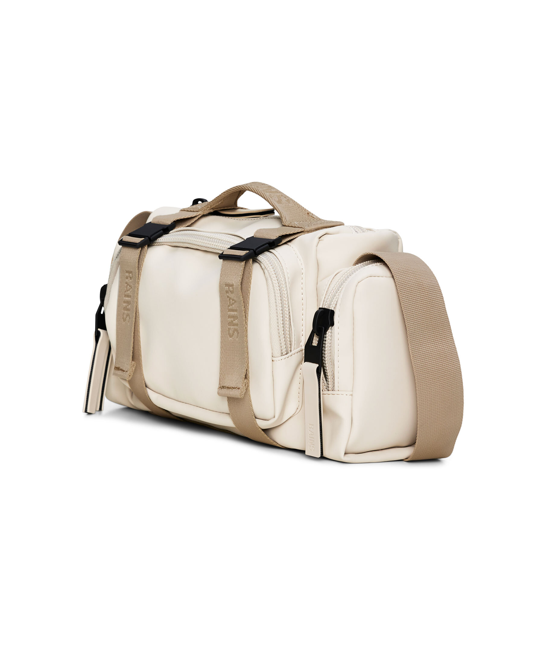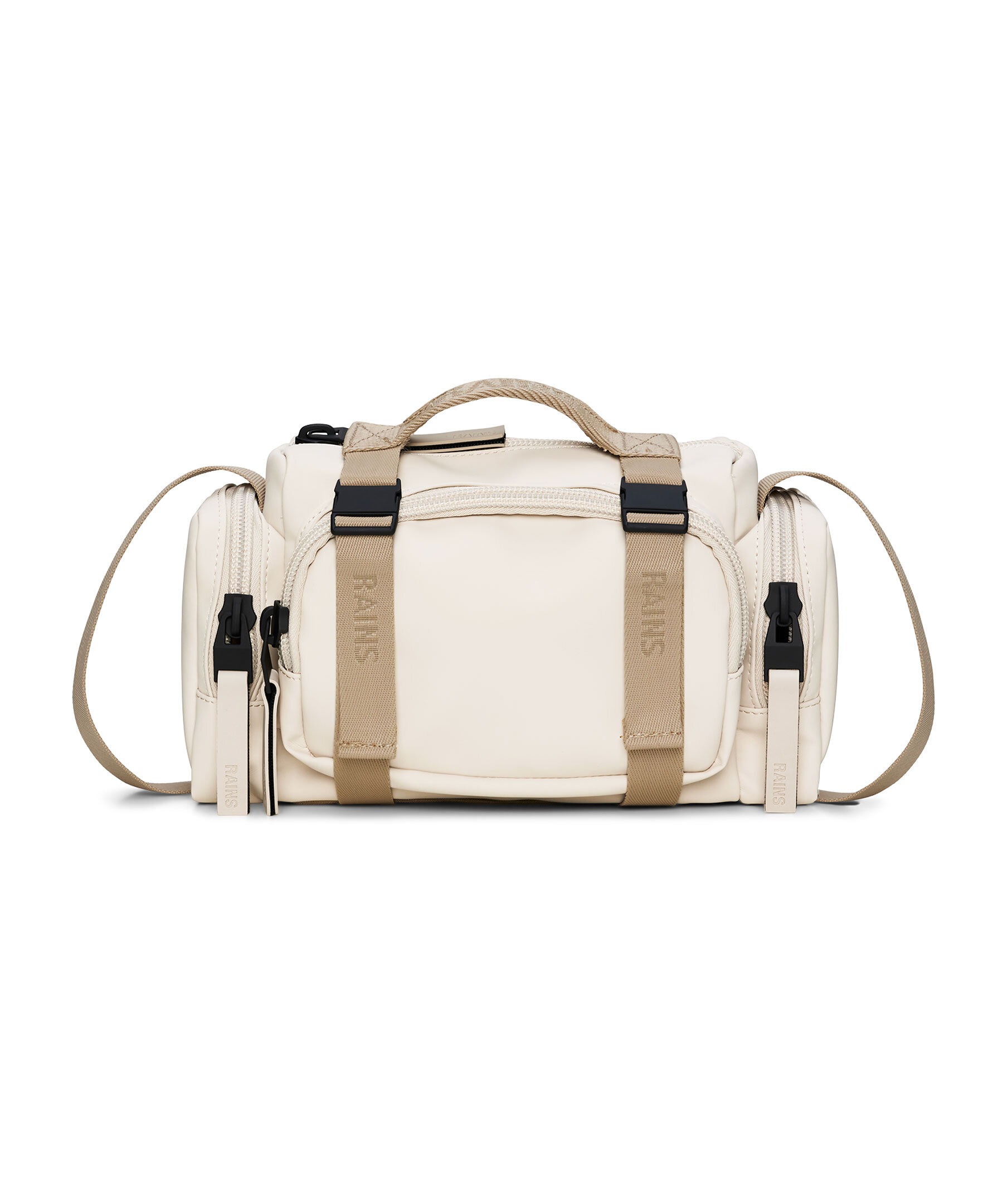 Benvit och beige, liten väska från Rains i en crossbodymodell. Väskan har spännen och vävda remmar med logotyp. Denna vattentäta väska har flera olika fack med åtkomst via gummerade blixtlås: ett fack fram, två på sidorna och ett huvudfack. Kan antingen bäras med crossbodyremmen eller i det övre handtaget. Tillverkad i polyester. Mått: H 16 x B 30 x D 8 cm