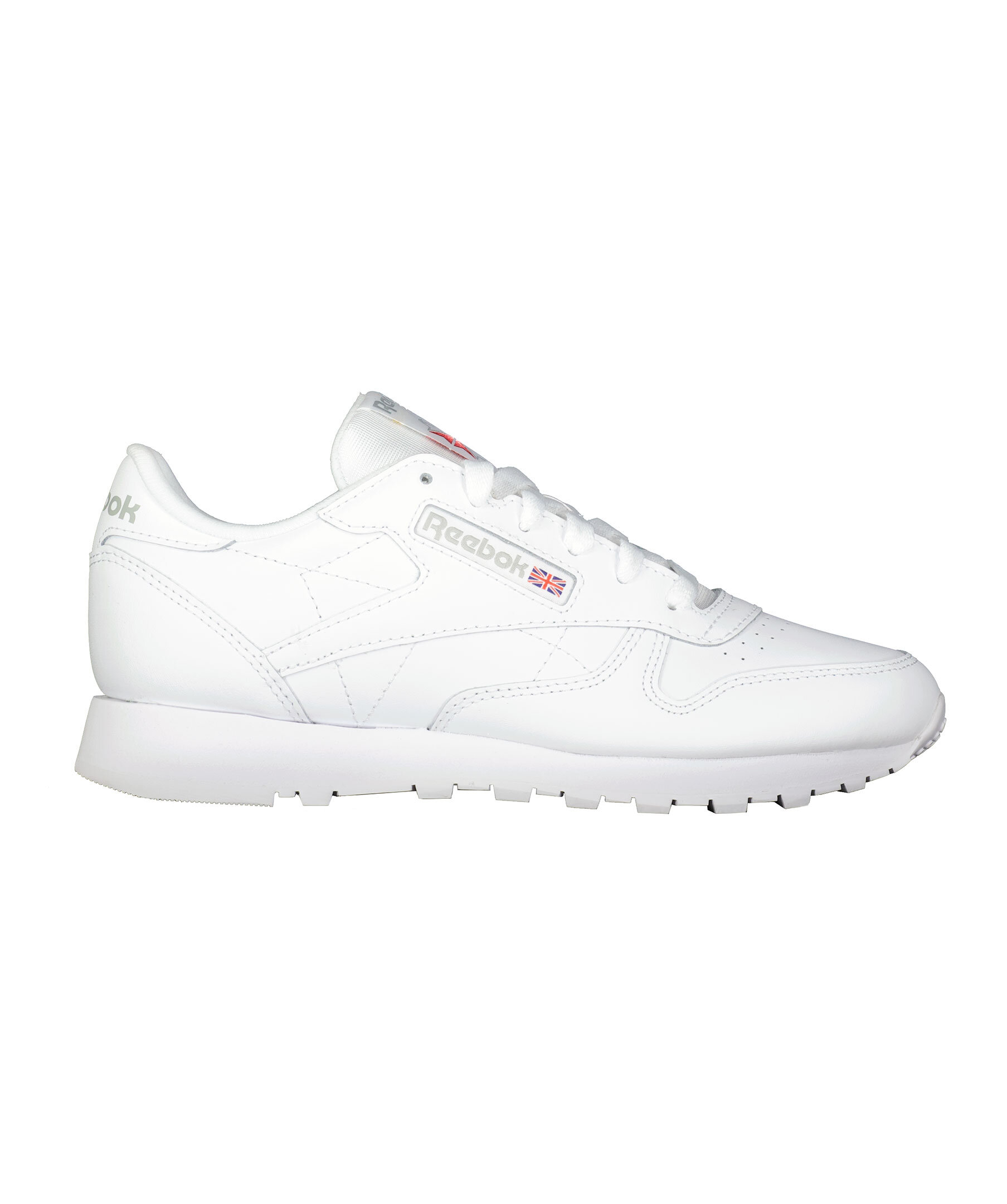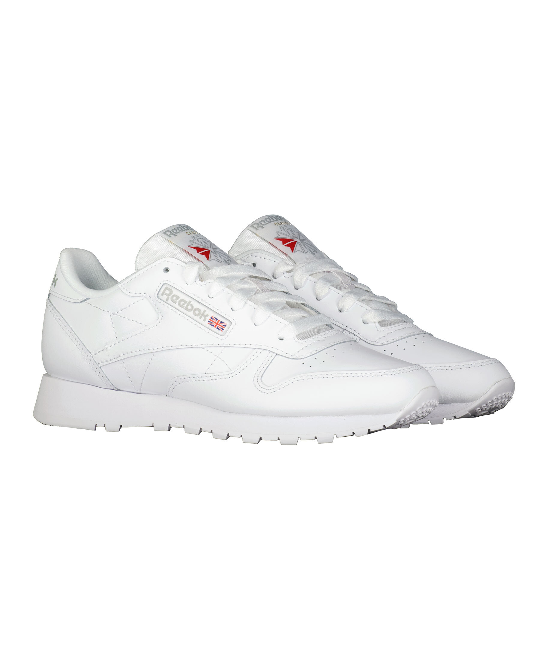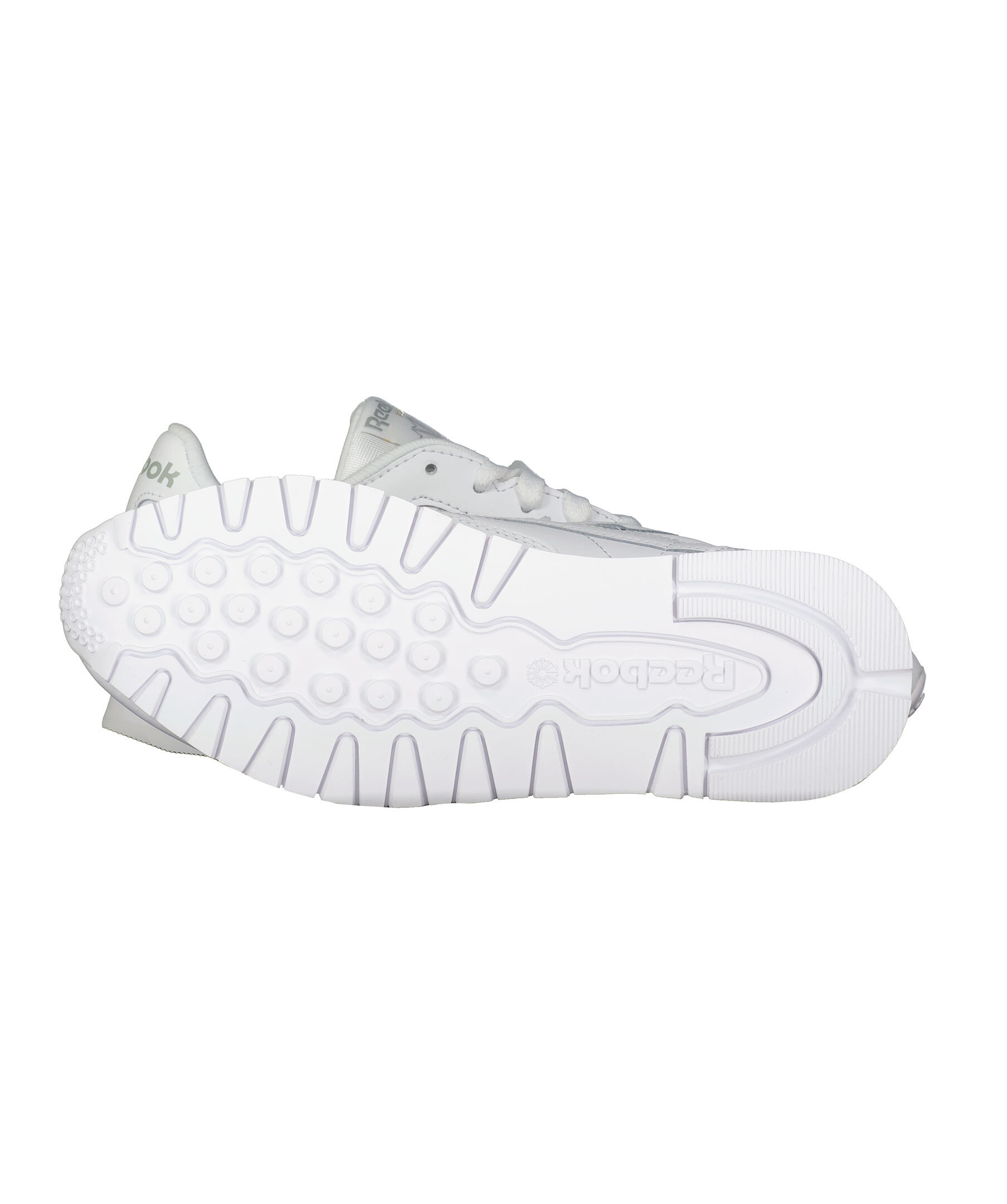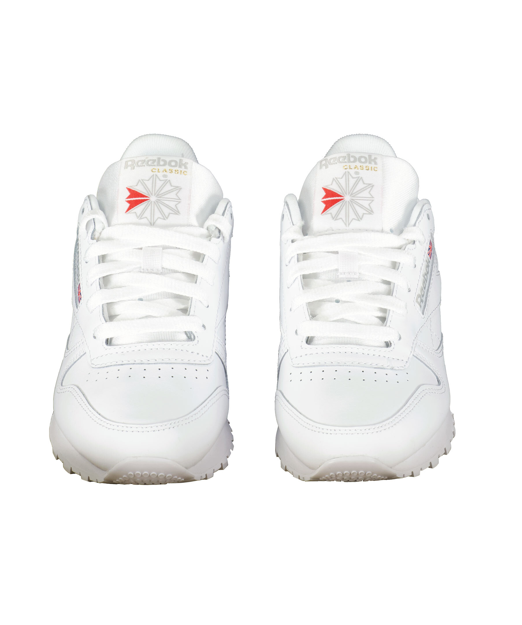 Vita sneakers i läder från Reebok. Platta skosnören. Patch på plösen med logotyp. Vävd logotyp på skons yttersida. Tryckt logotyp på hälen. Sula i gummi.