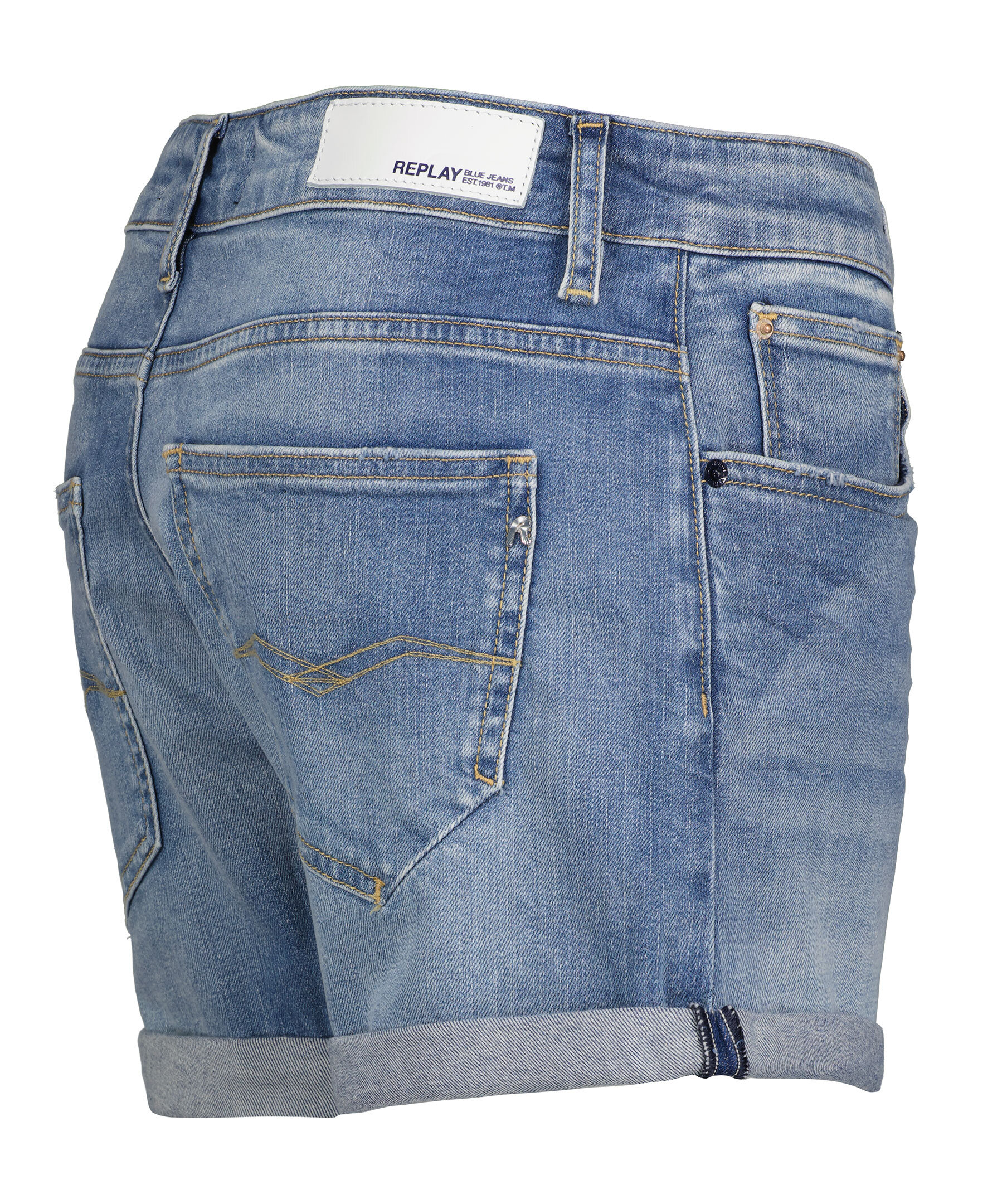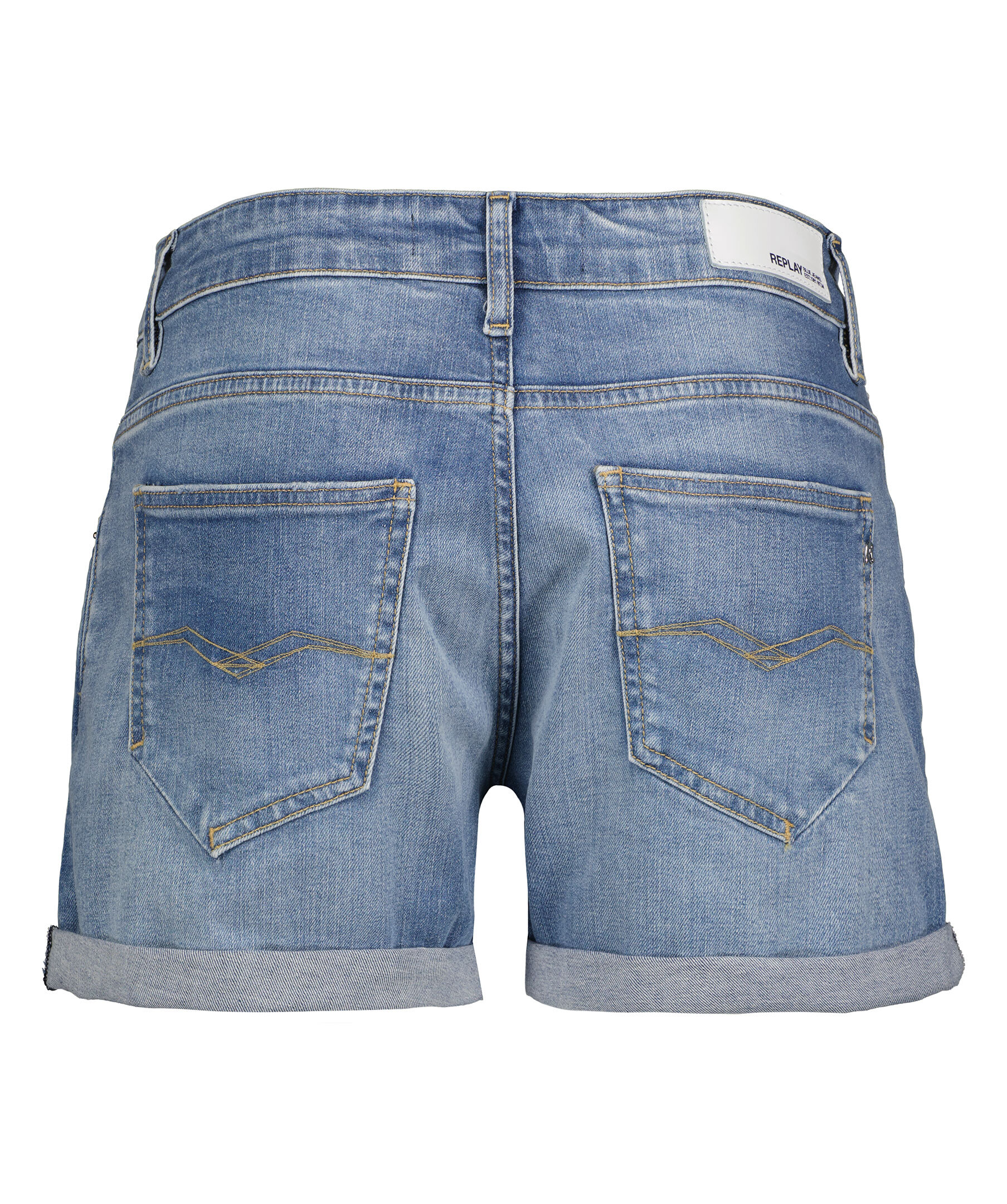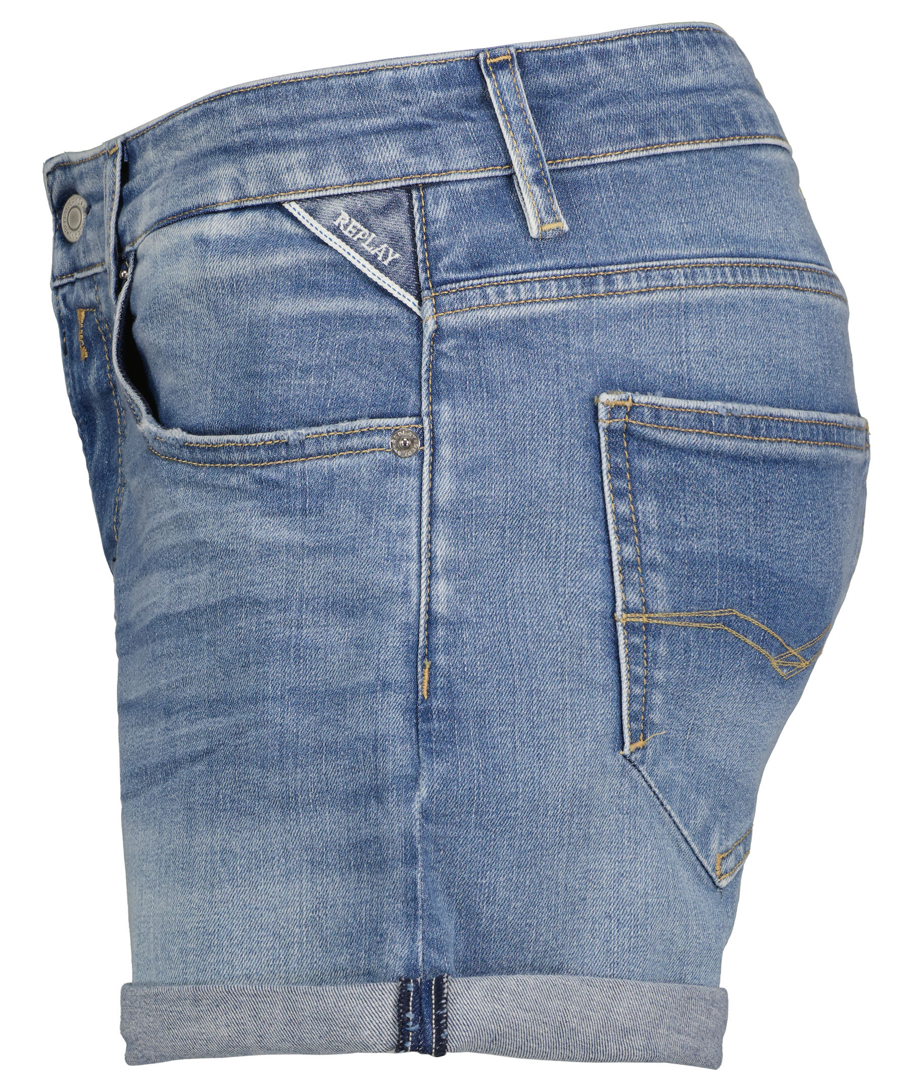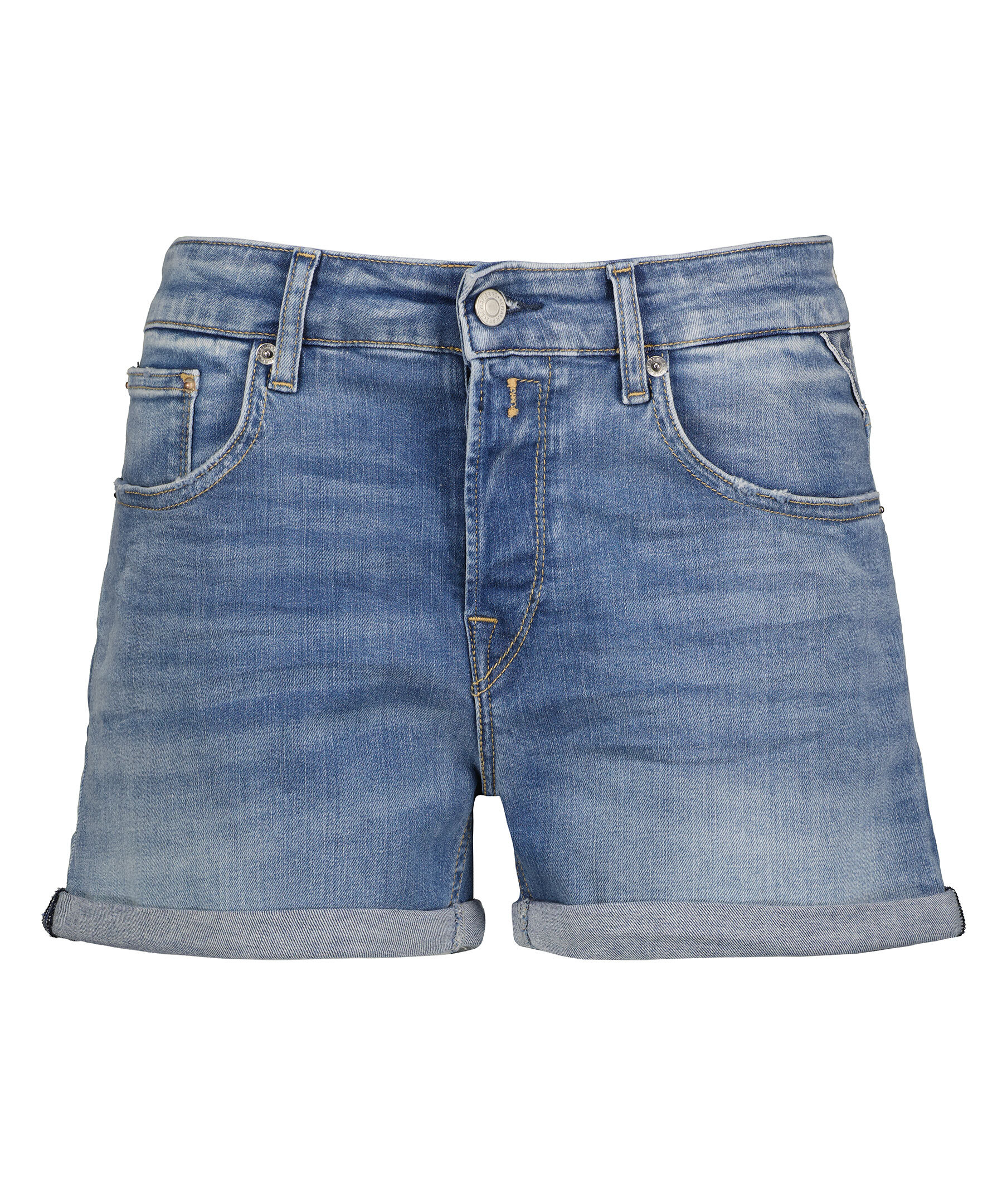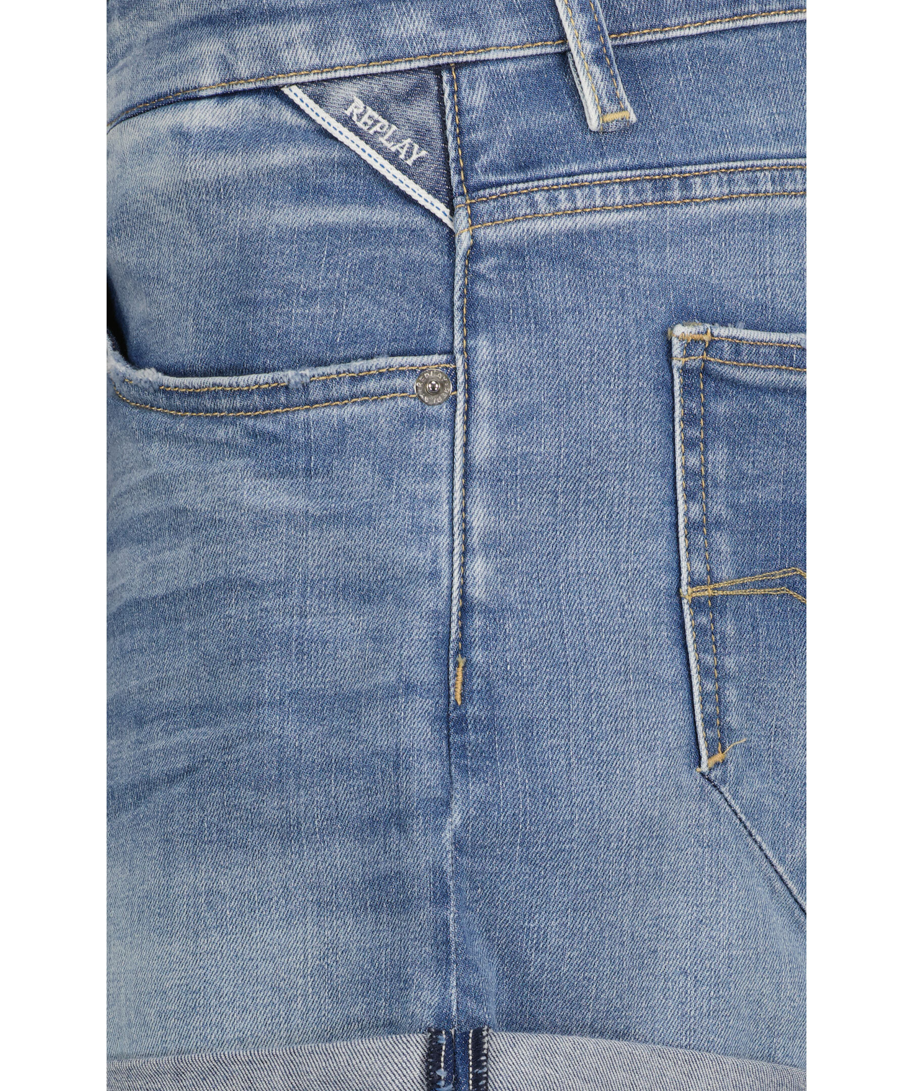 Ljusblåa jeansshorts från Replay. Tillverkade i ett stretchigt bomullsmaterial. Femficksmodellen. Dold gylf, upprullade ben. Liten broderad logotyp vid vänstra framfickan.