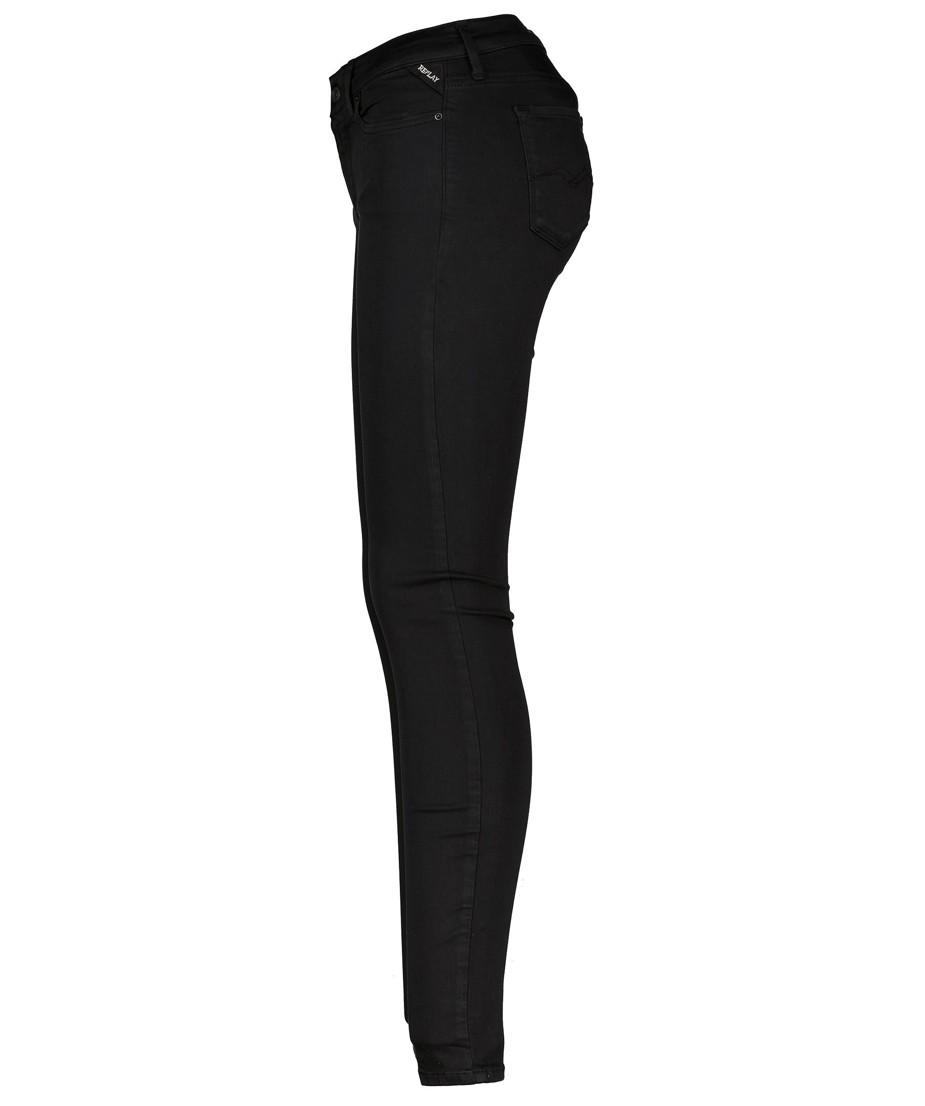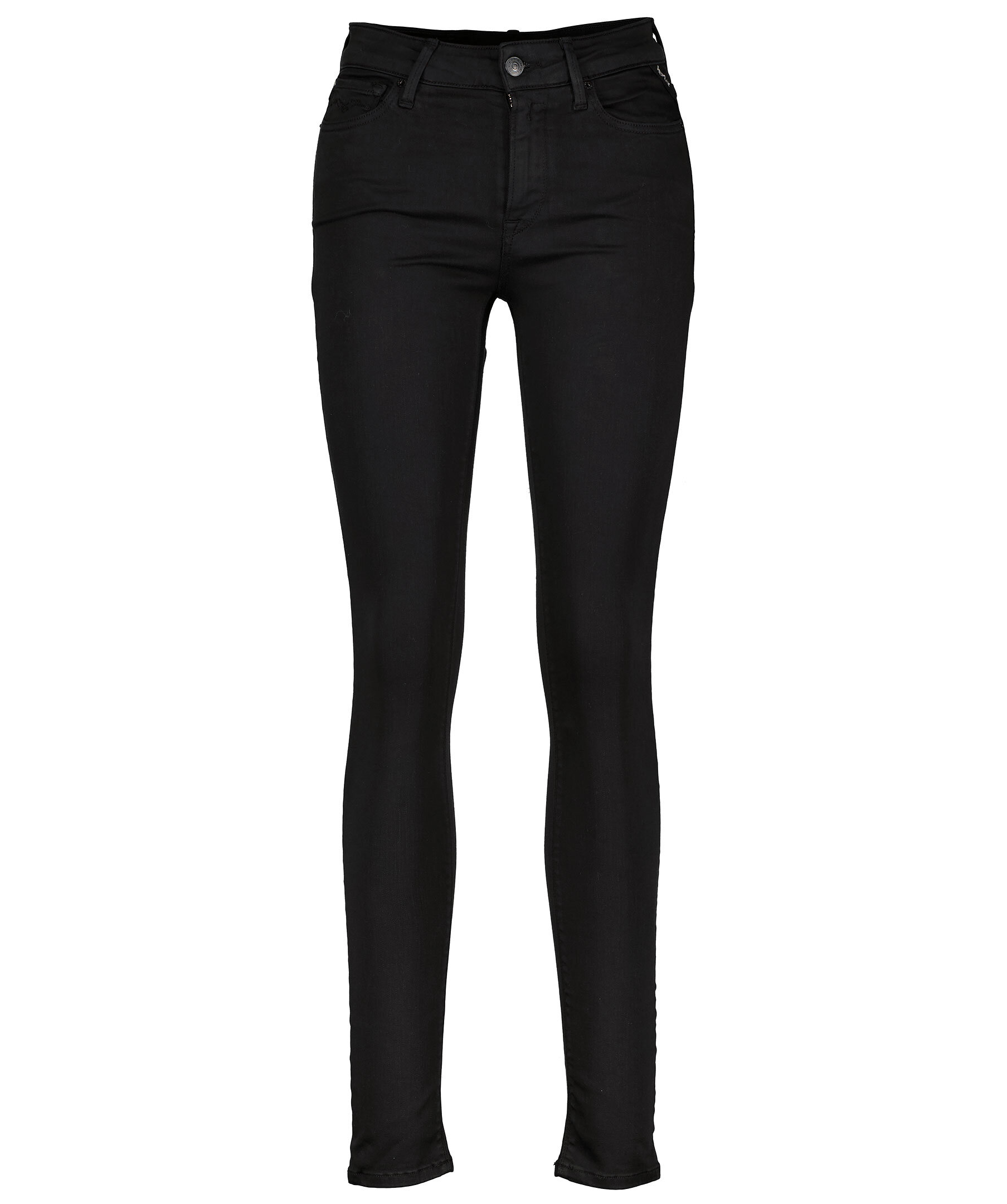 Svarta jeans med smal passform från Replay. Powerstretch-denim med 4 vägsstretch, hög midja och smala ben. Fem fickor, triangelformad REPLAY-etikett på vänster framficka, myntficka och bakfickor med ikoniska Replay-sömmar. R-formad metallbricka på höger bakficka, hällor för bälte i midjan, etikett bak på linningen samt dragkedja och knappgylf. Jeansen är lite stora i storlek, vi rekommenderar att gå ner en storlek för bäst passform.