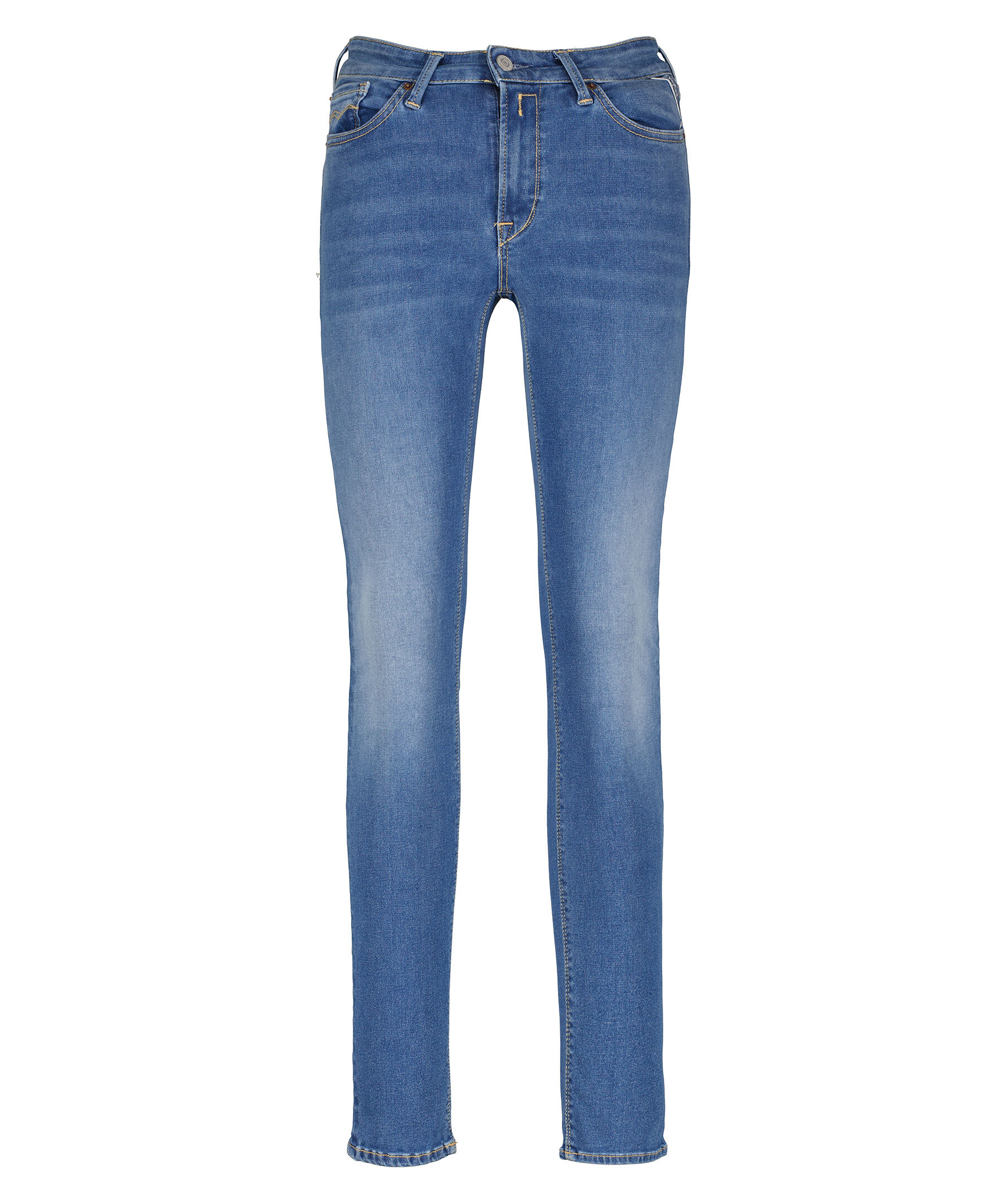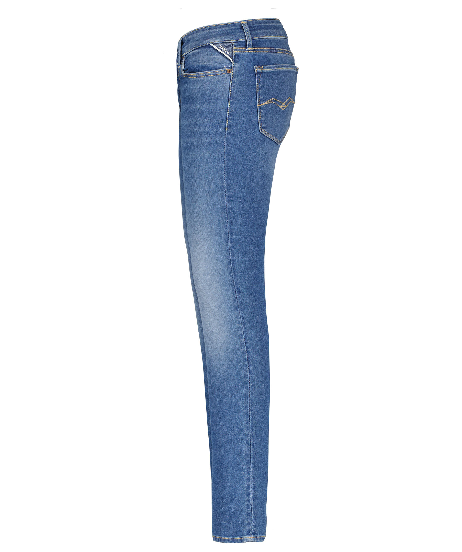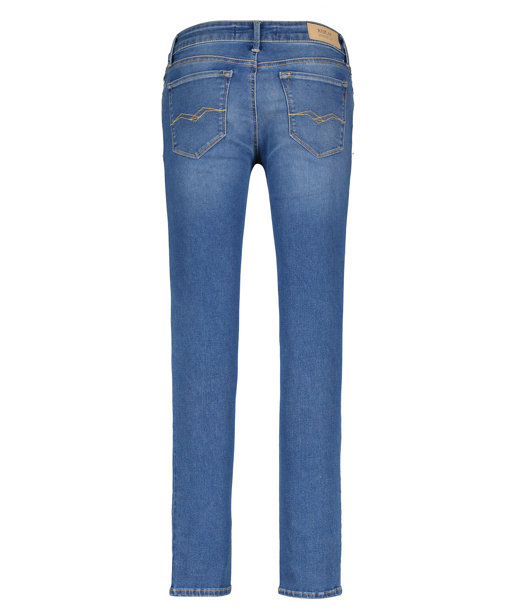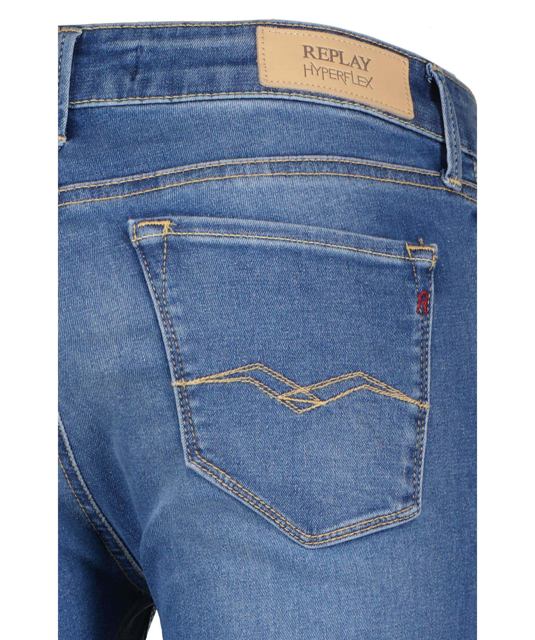 Mellanblåa jeans med smal passform från Replay. Powerstretch-denim med 4 vägsstretch, hög midja och smala ben. Fem fickor, triangelformad REPLAY-etikett på vänster framficka, myntficka och bakfickor med ikoniska Replay-sömmar. R-formad brodering på höger bakficka, hällor för bälte i midjan, vit etikett bak på linningen samt stängs fram med dold dragkedja och knappgylf.