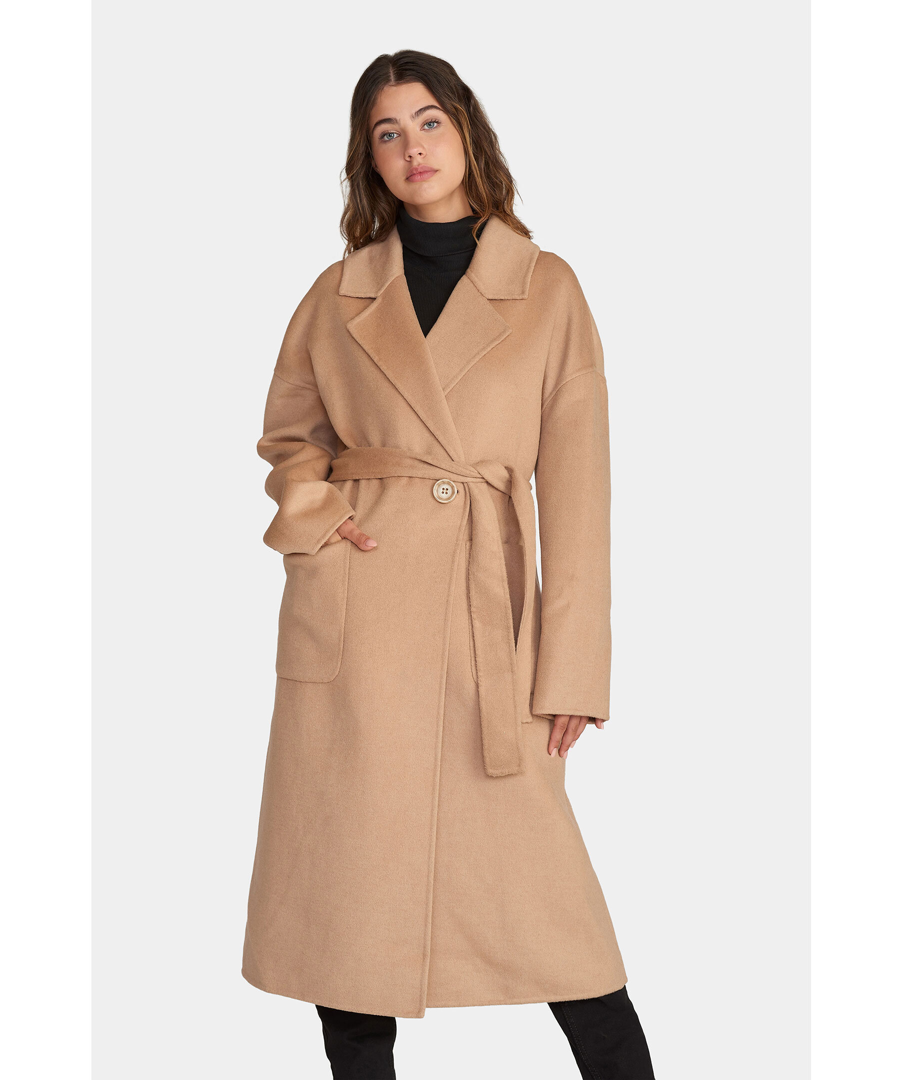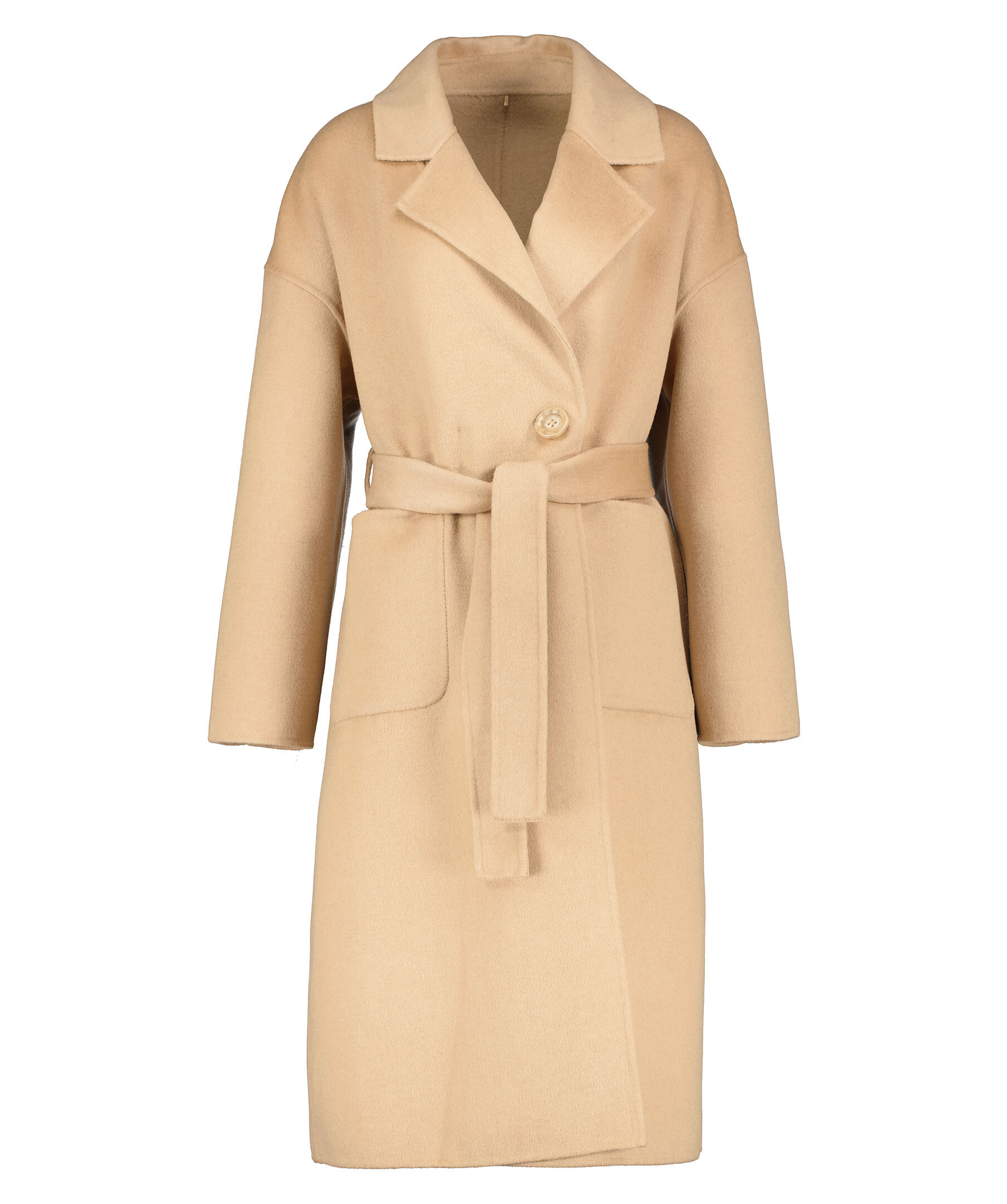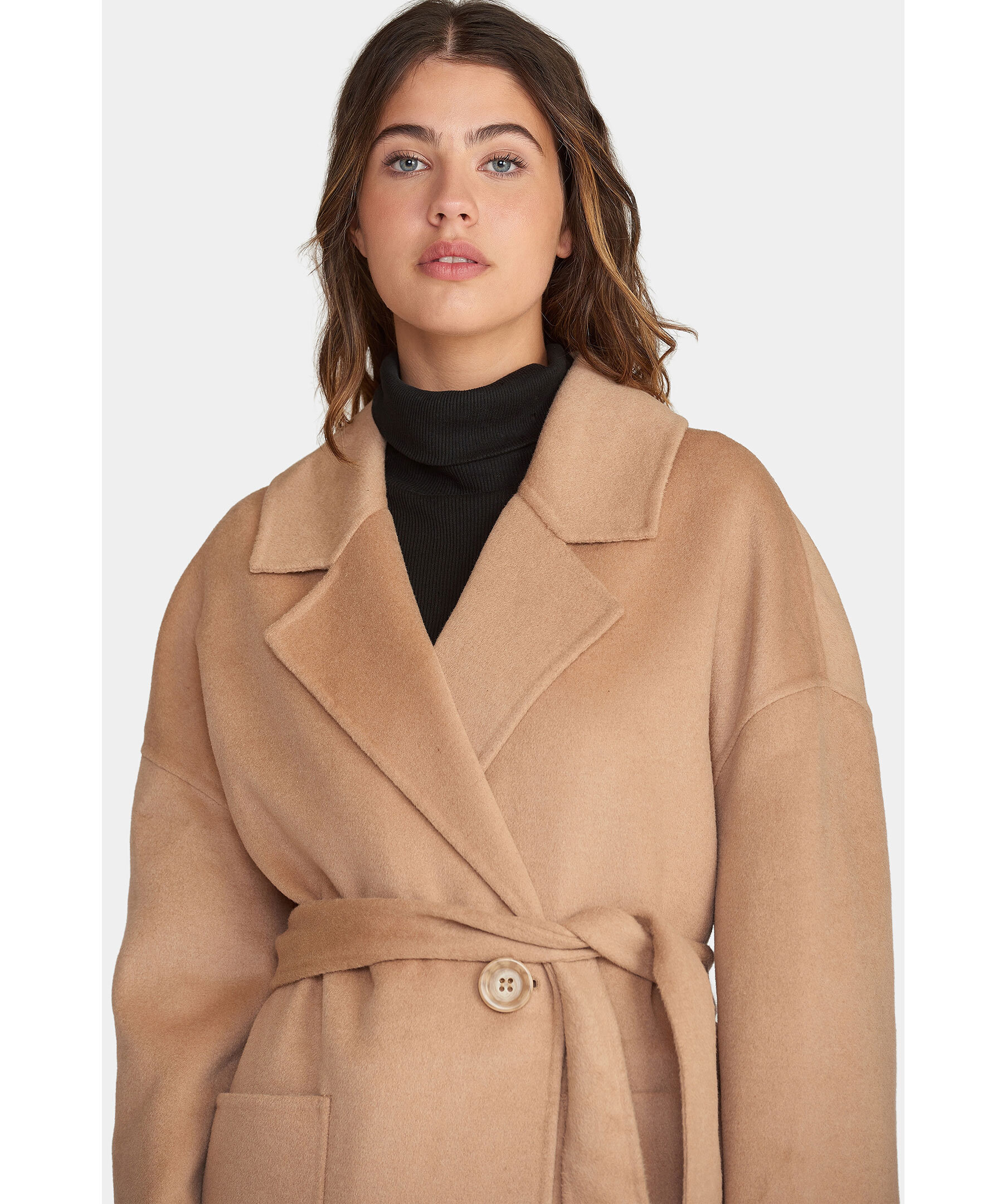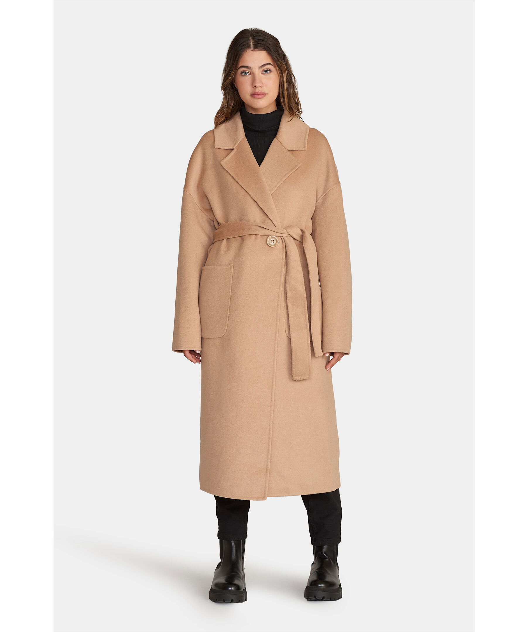 Beige dubbelknäppt kappa från Rockandblue. Avtagbart bälte. Två fickor framtill. Sprund baktill. Tillverkad i ullblandning.