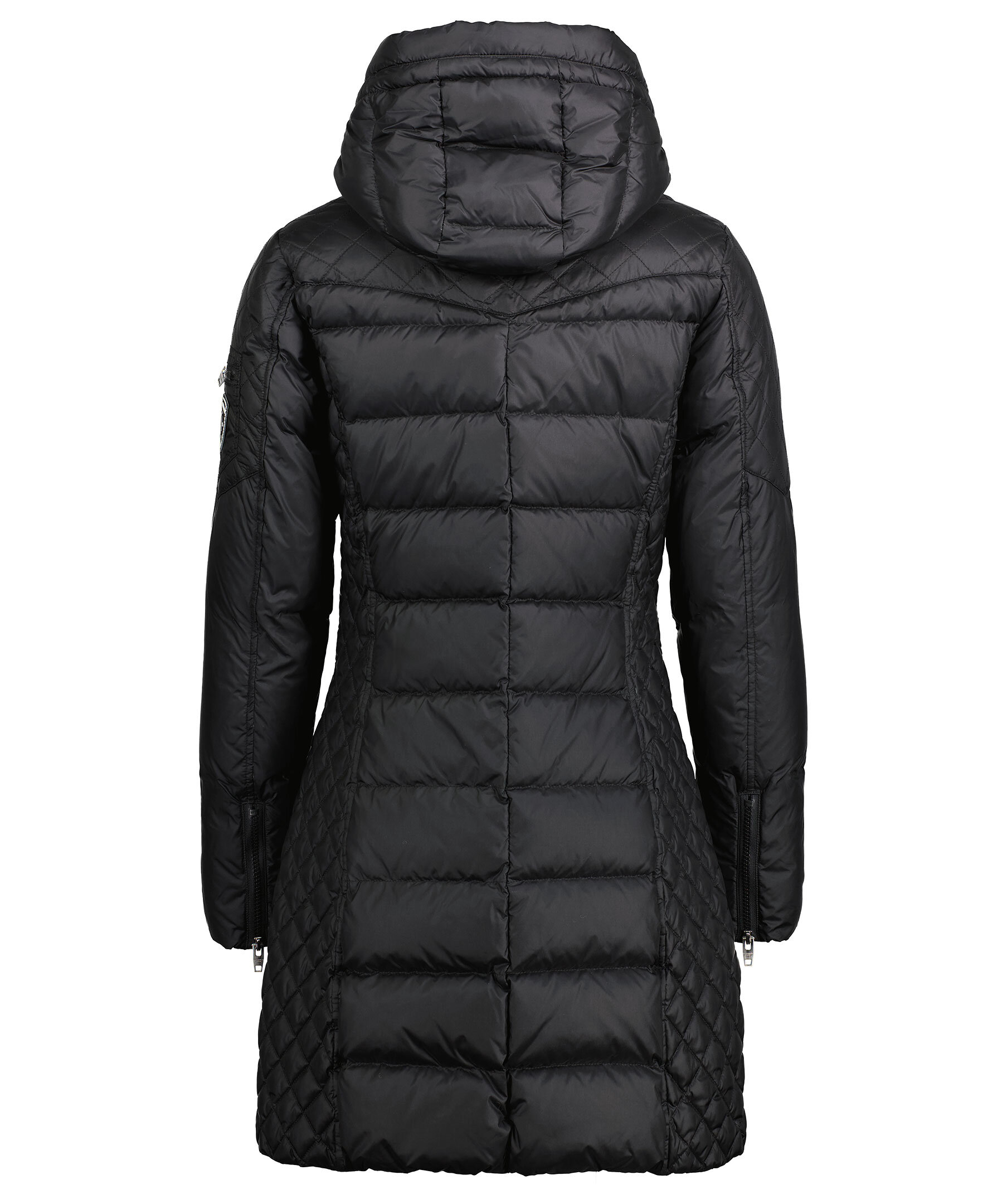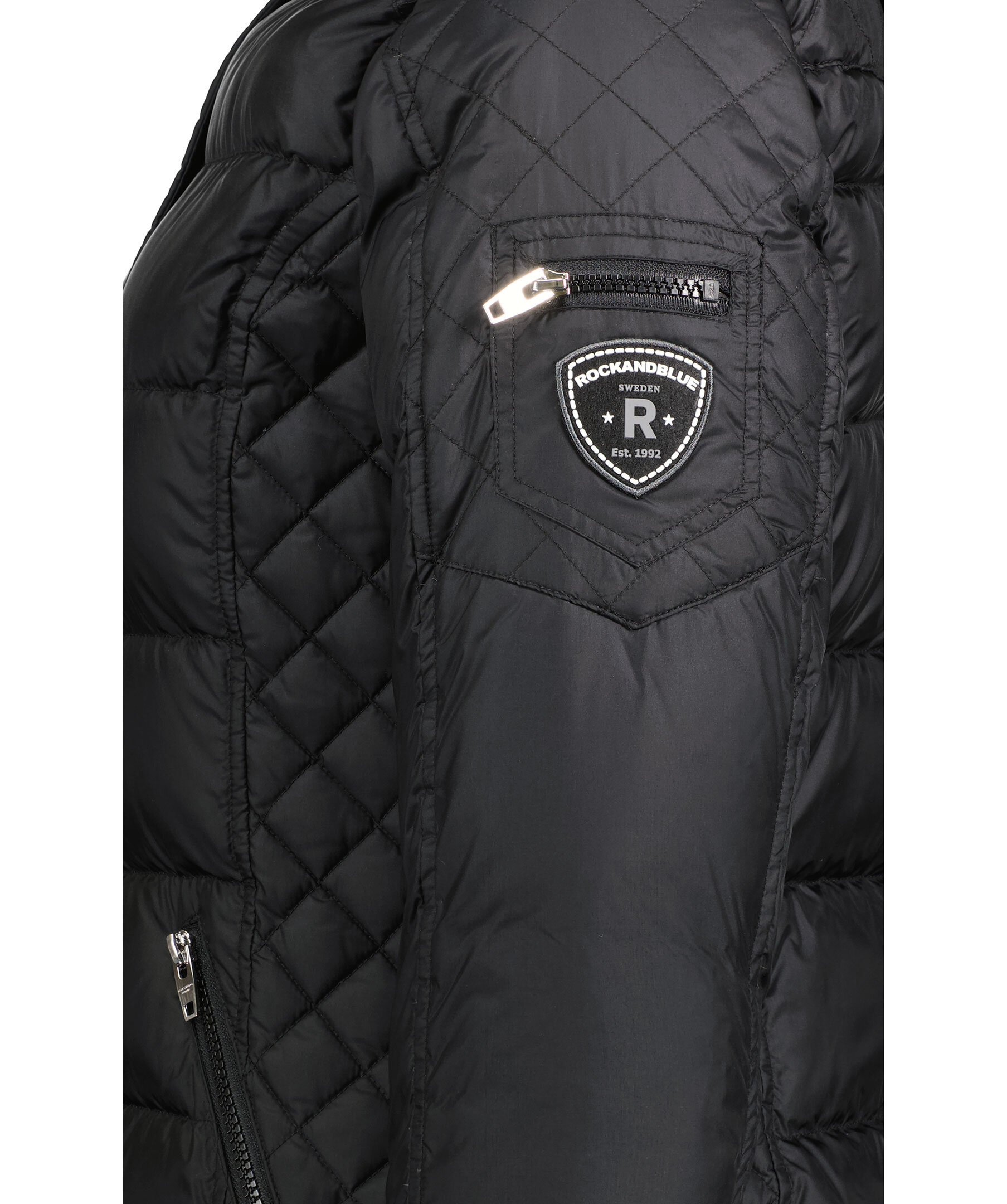 Svart dunjacka med figurnära passform från Rockandblue. Stängs framtill med tvåvägsdragkedja och tryckknappar. Avtagbar luva med dragsko. Bröstficka på höger sida, två fickor framtill, en på vänster ärm som stängs med dragkedja. Två innerfickor. Patch med logotyp på vänster ärm. Dragkedja i ärmslut.