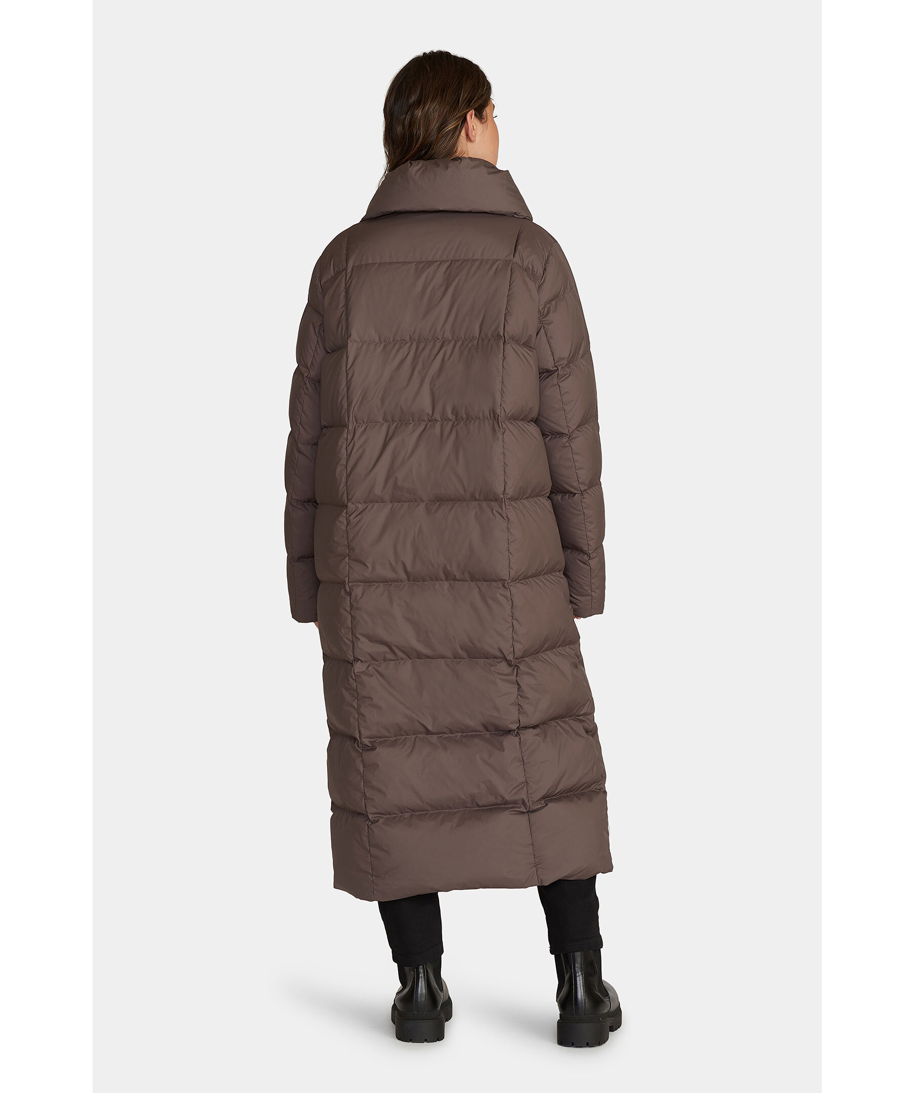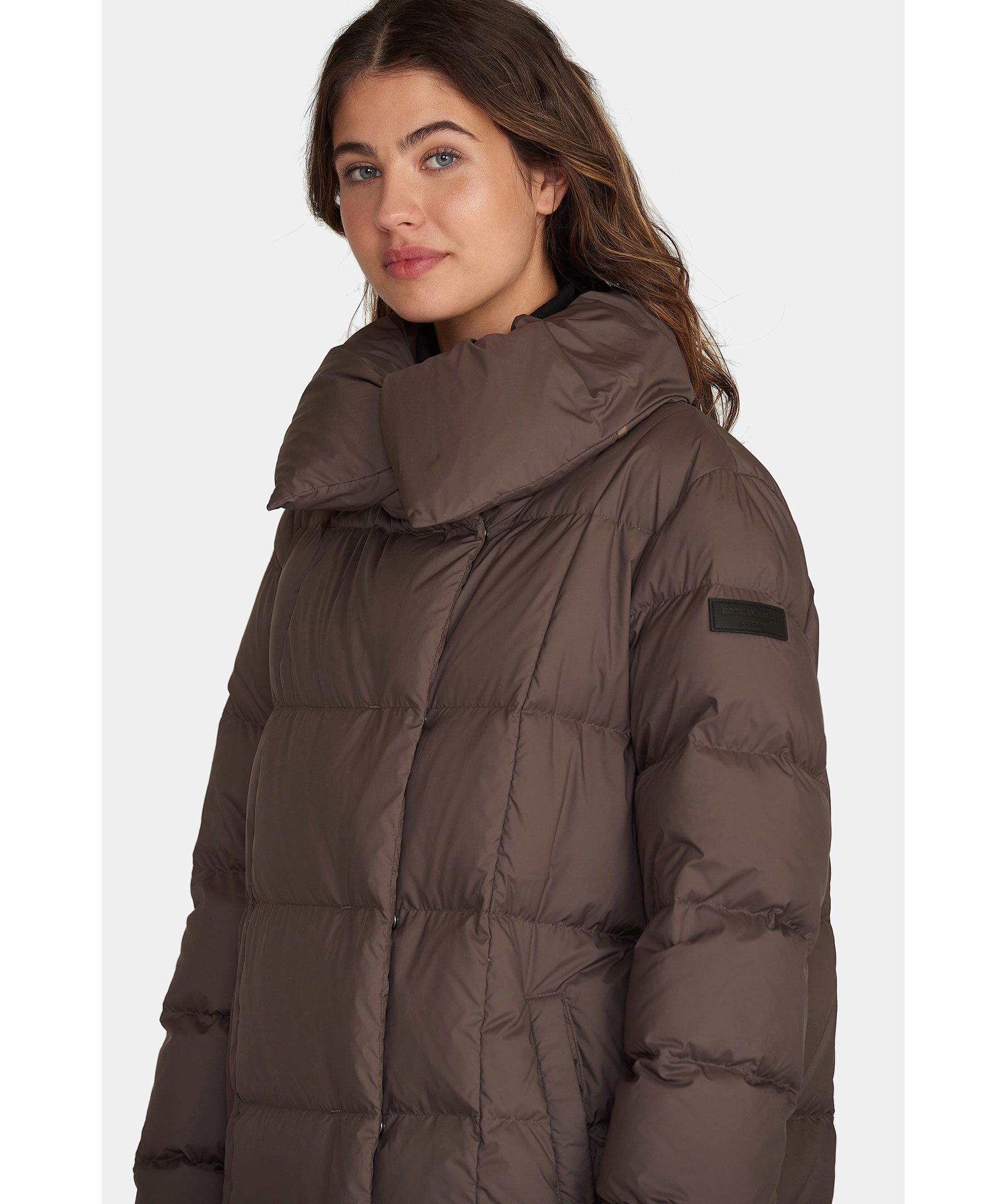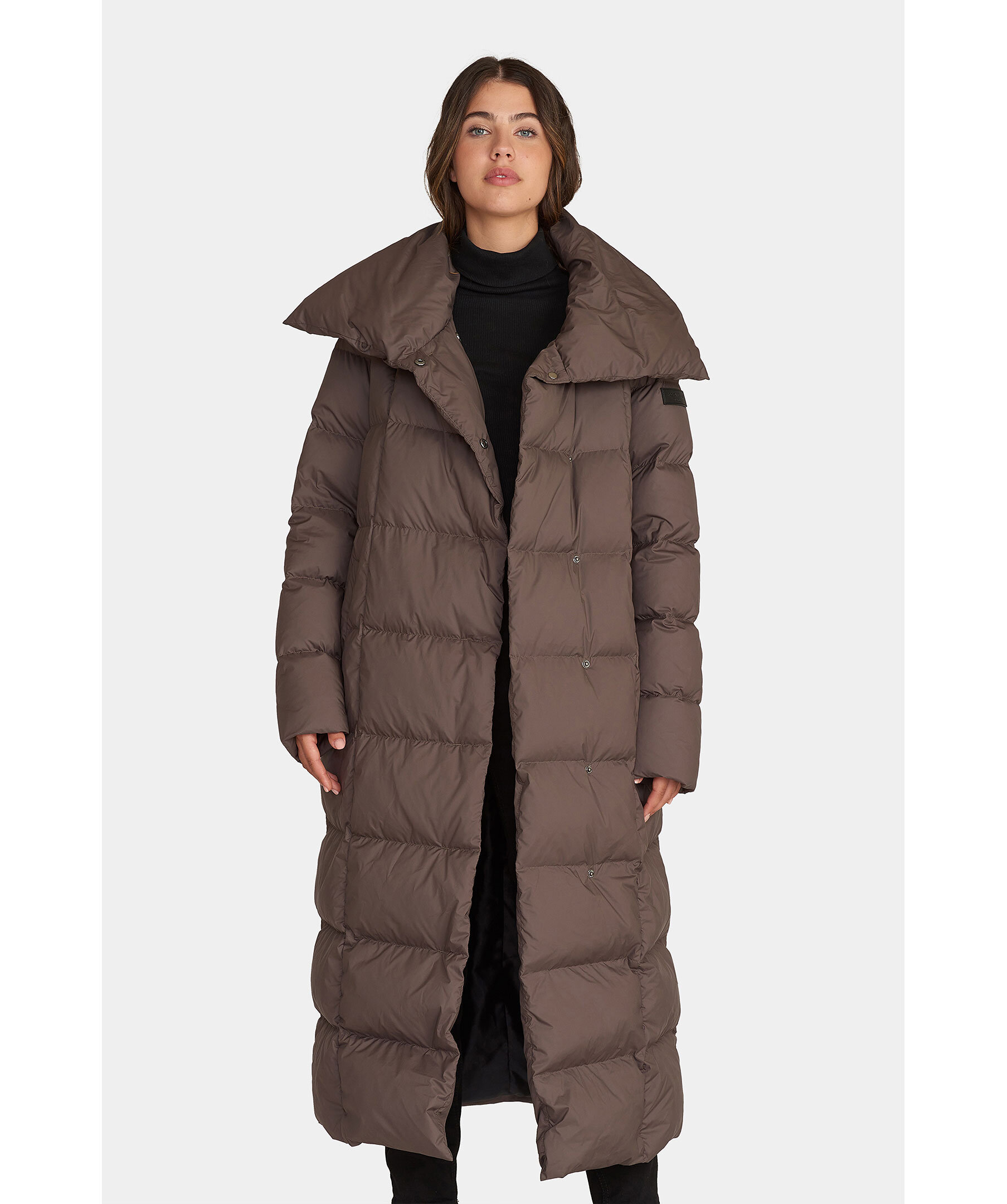 Brun quiltad dunkappa från Rockandblue. Stängs framtill med tryckknappar och bälte. Stor krage. Två fickor framtill som stängs med tryckknappar. Innerficka som stängs med dragkedja. Patch i läder med embossad logotyp på vänster ärm.