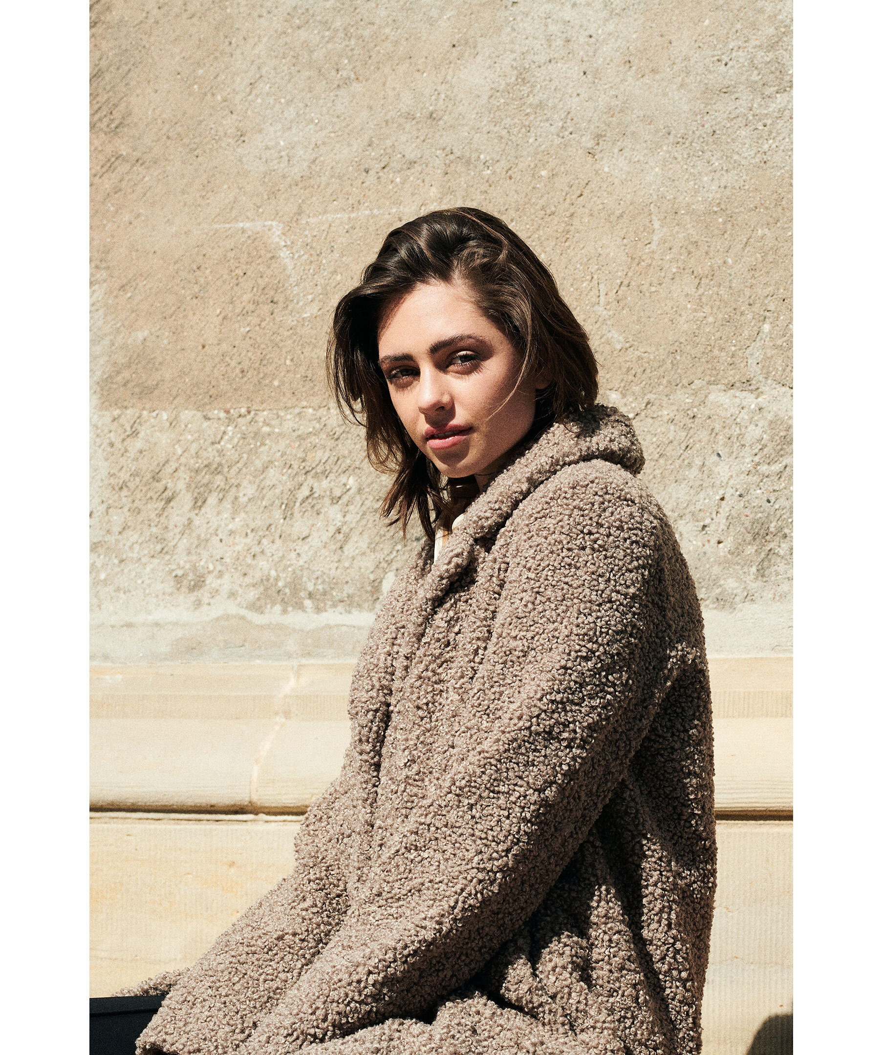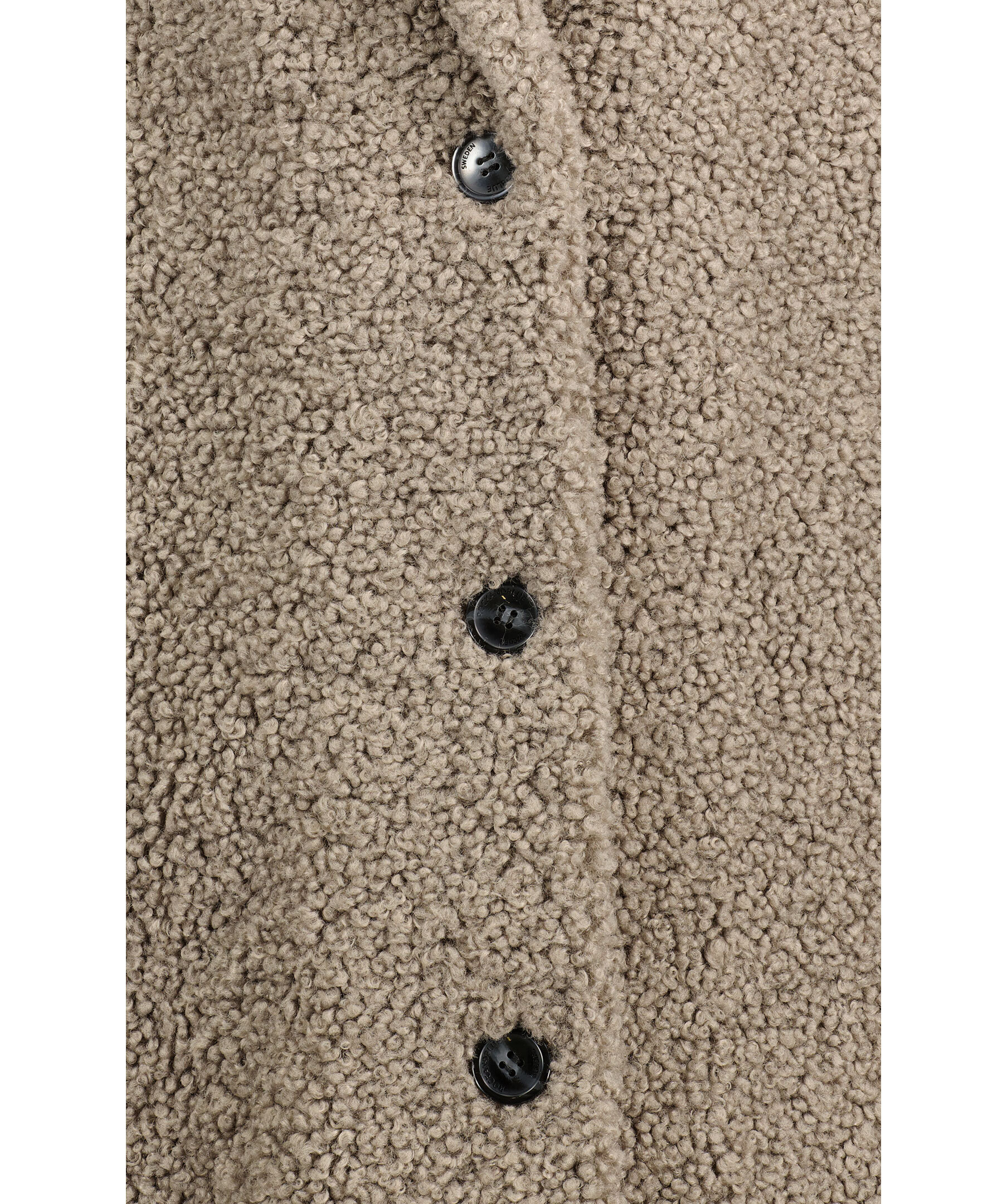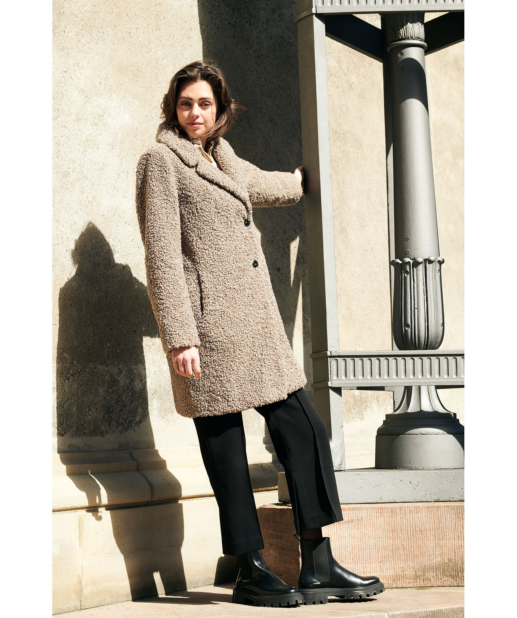 Taupefärgad kappa gjord i konstpäls från RockandBlue. Jackan har två dolda, öppna fickor, en innerficka med dragkedja. Fin krage med slag. Stängs med stora, svarta knappar och har ljusrosa foder. Tillverkad i polyester.
