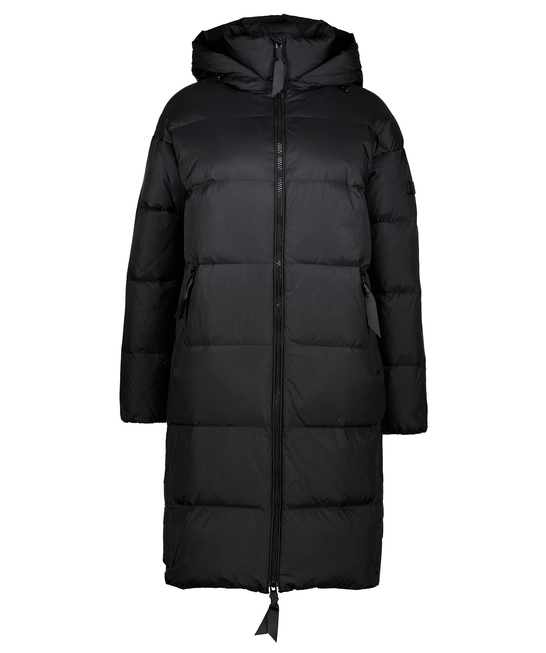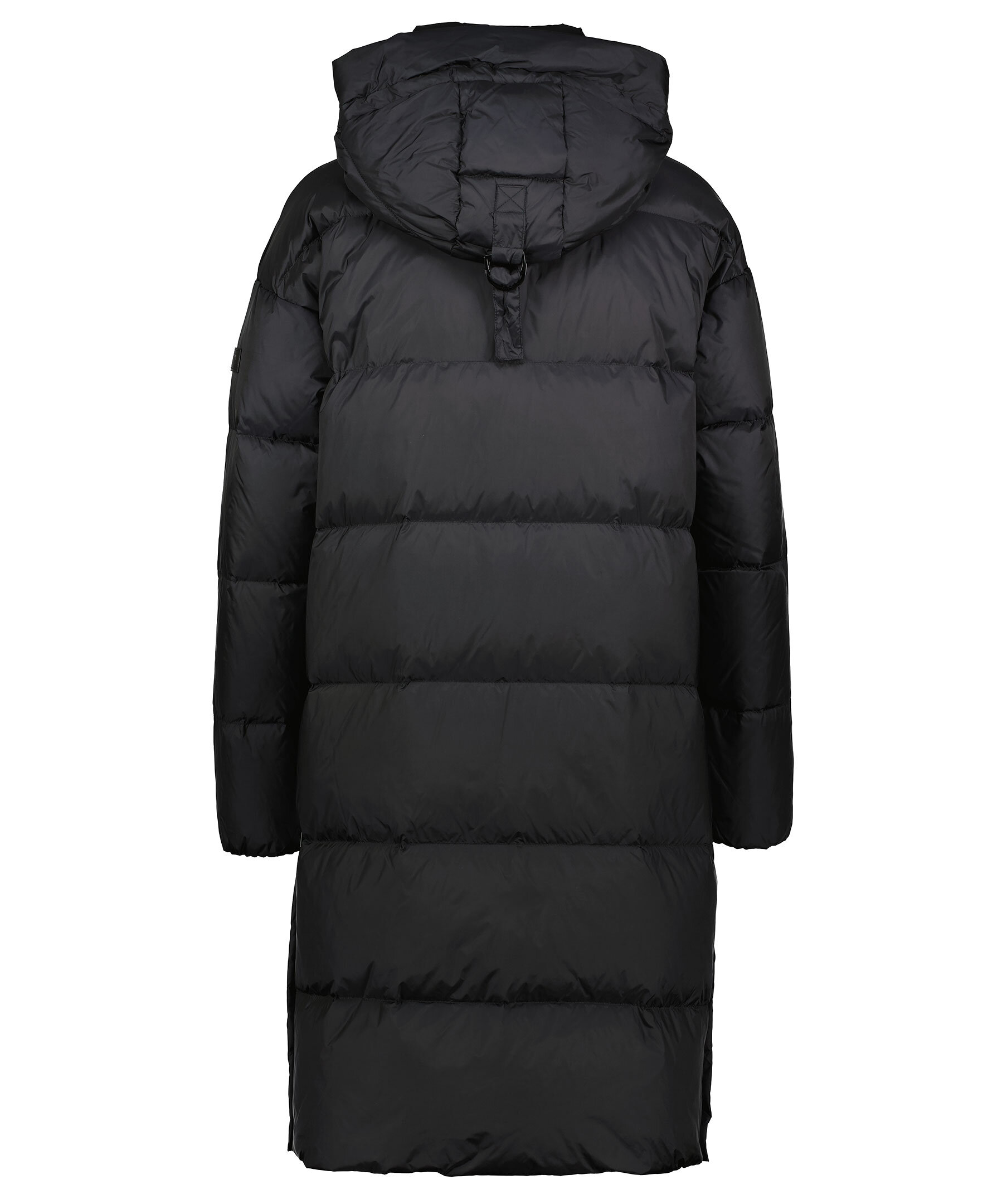 Svart dunjacka från Rockandblue i lång modell. Normal i storlek med passform som är något oversize. Två fickor fram och en innerficka. Stängs med tvåvägsdragkedja och tryckknappar. Logga i läder på vänster ärm, avtagbar luva och hög krage. Yttertyg i nylon och har ett foder i dun.