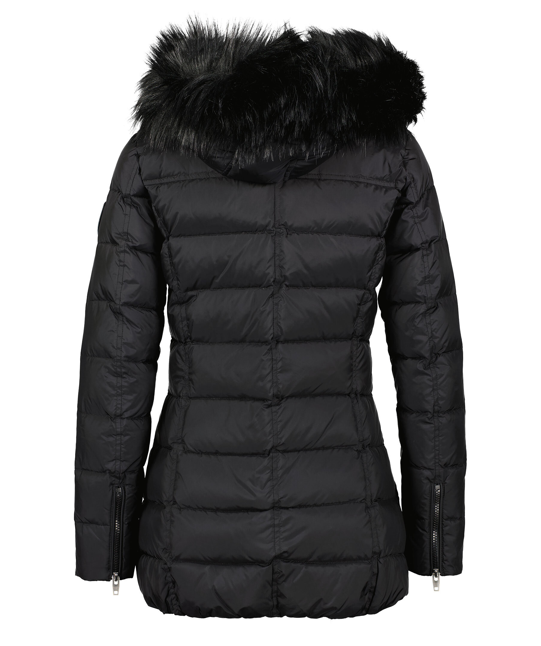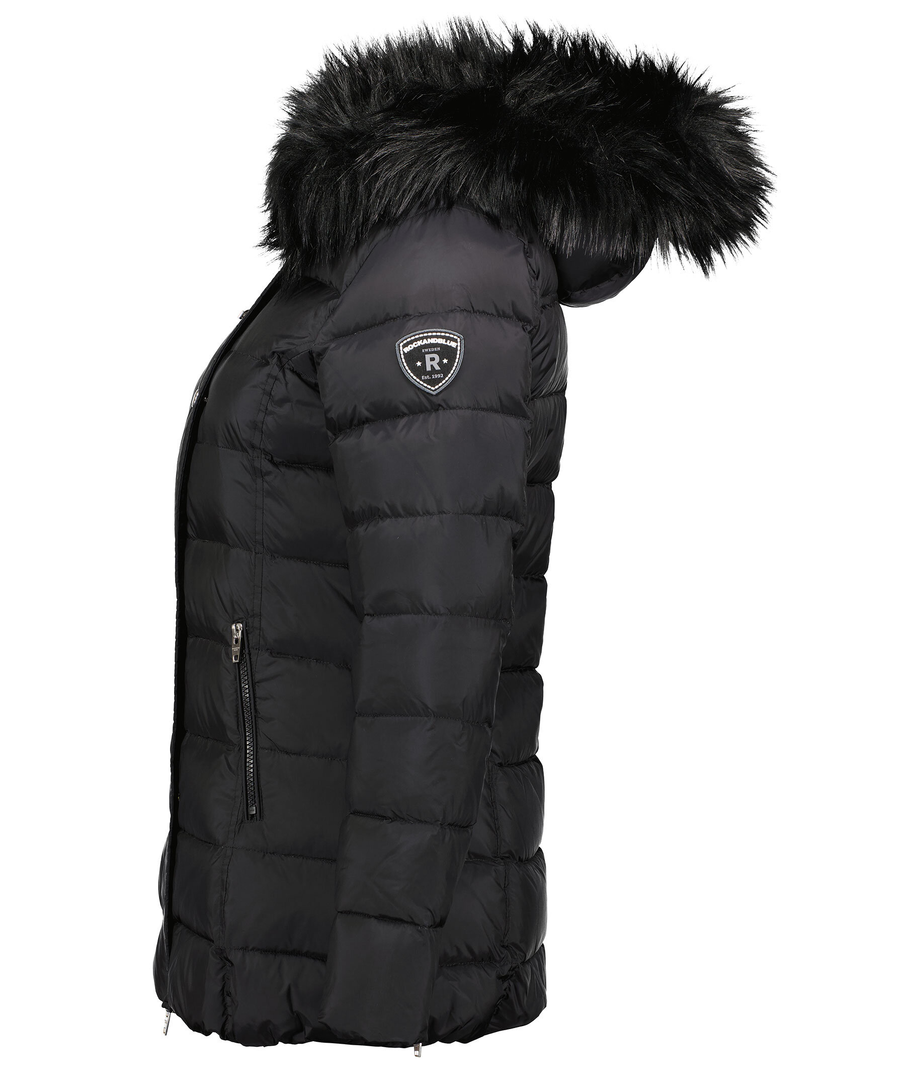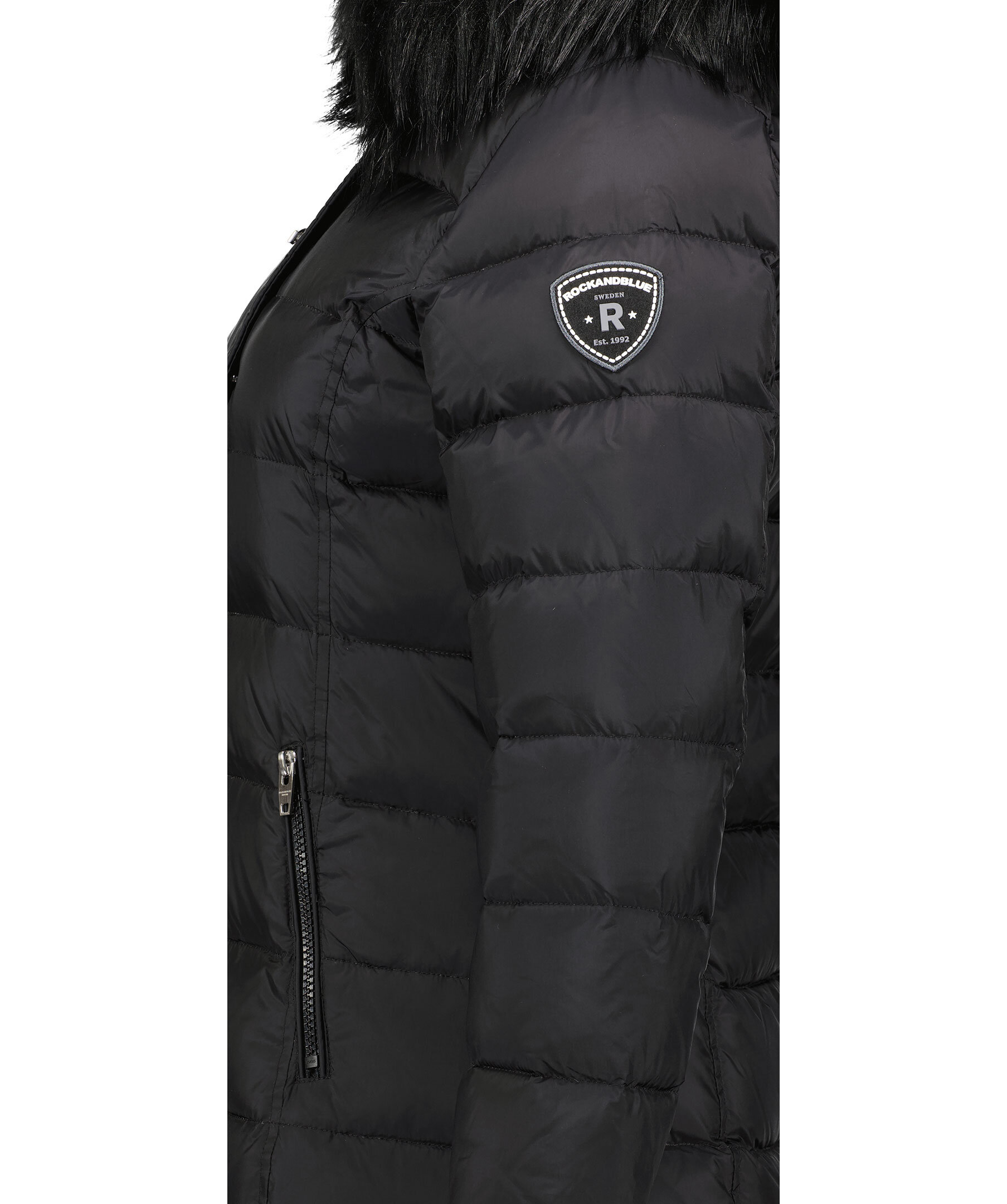 Svart quiltad dunjacka från Rockandblue. Stängs framtill med tvåvägsdragkedja och tryckknappar. Gummerad patch med logotyp på vänster ärm. Två fickor framtill som stängs med dragkedja. Bröstficka på högersida som stängs med dragkedja. Innerficka som stängs med dragkedja. Avtagbar konstpäls på luvan. Dragkedja vid ärmslut.