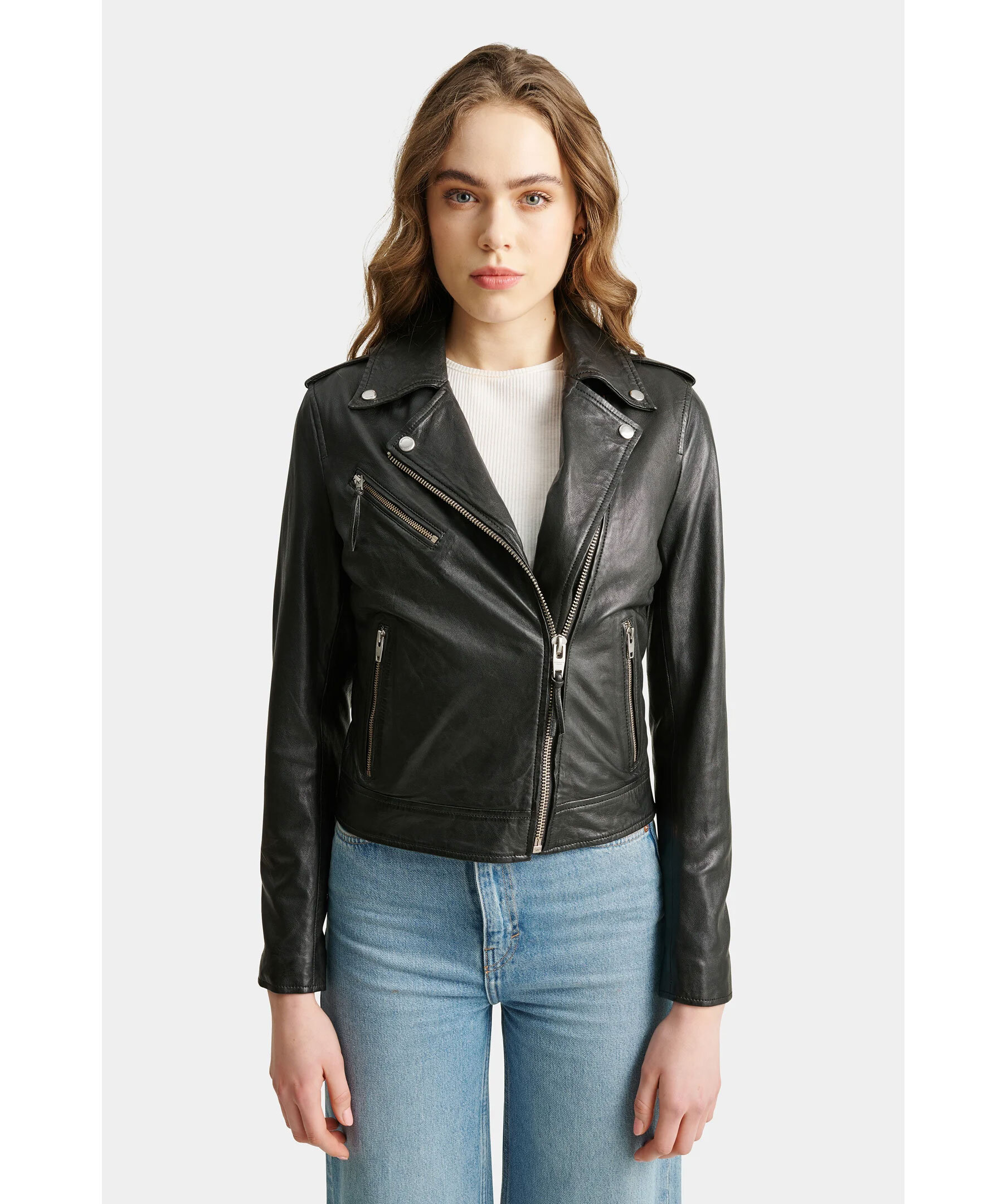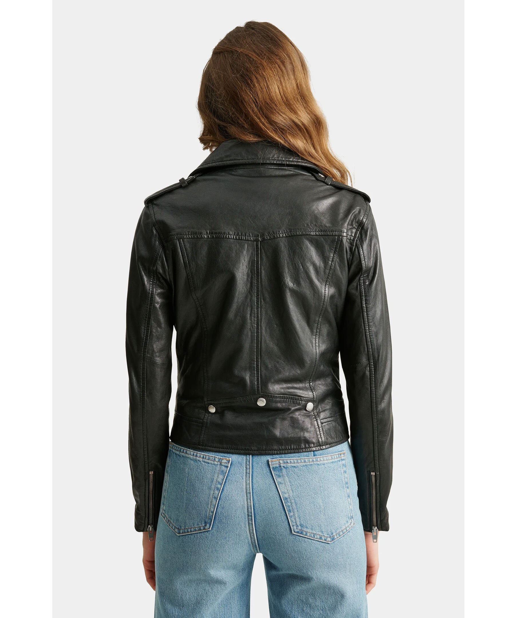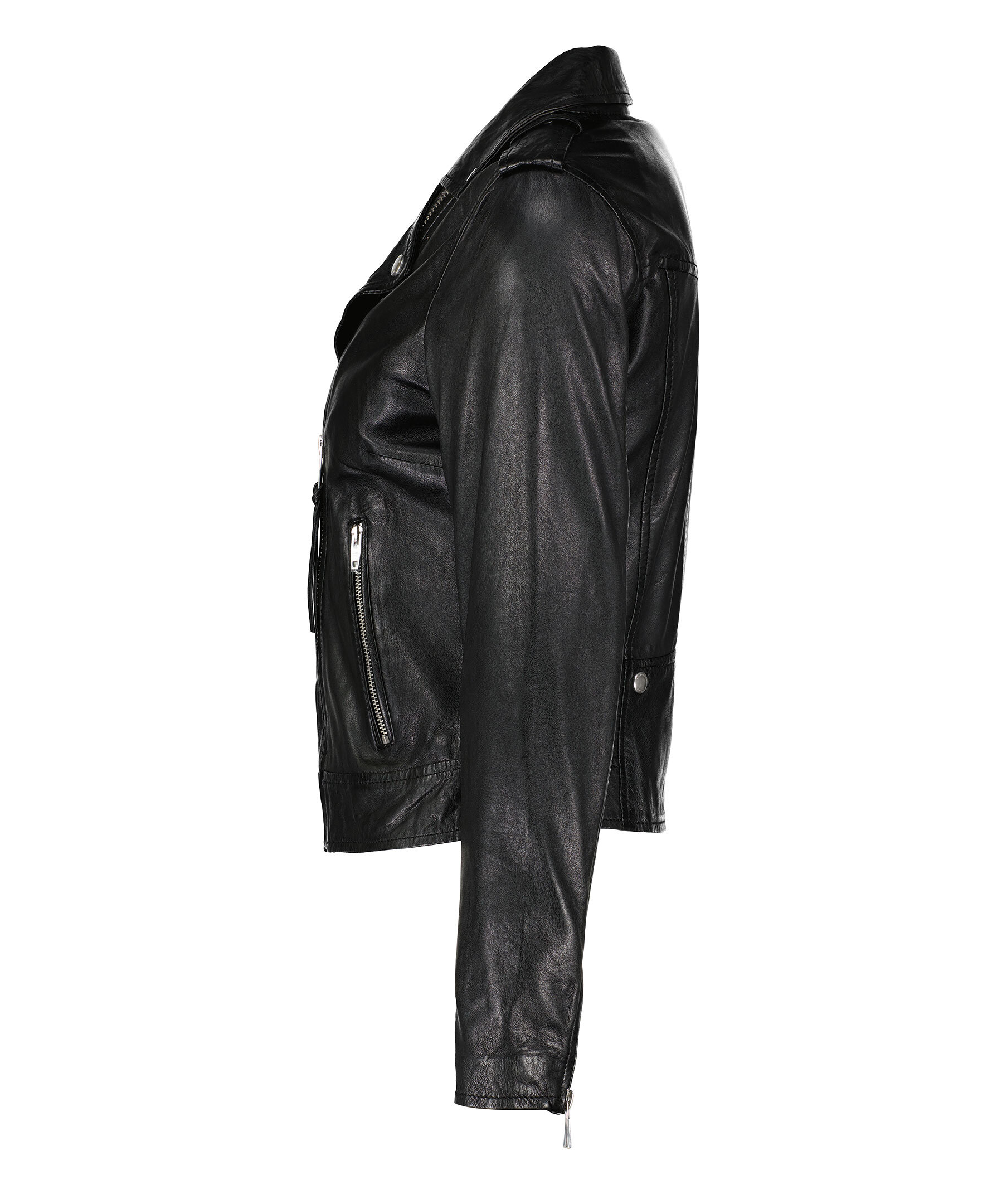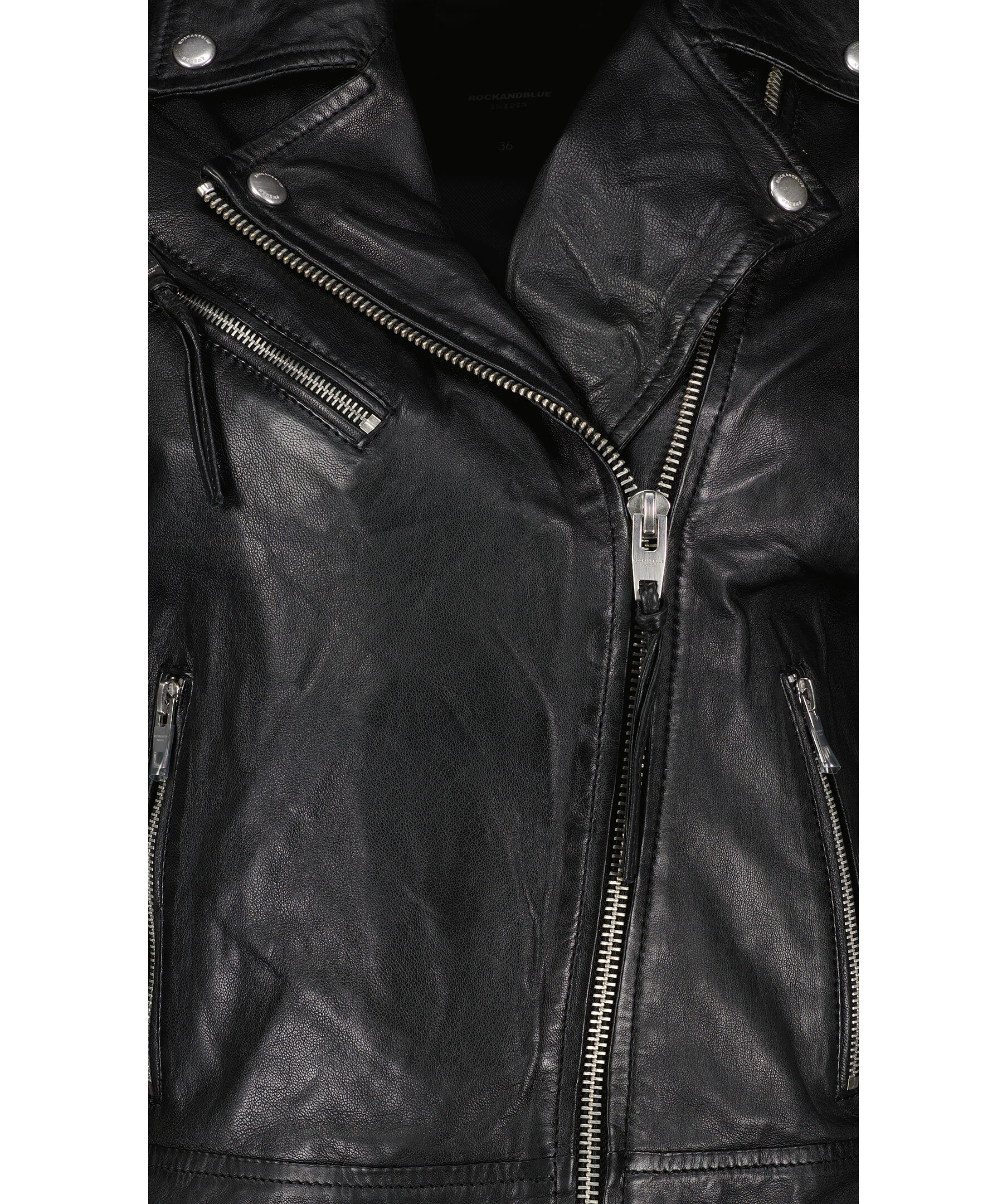 Svart jacka i läder i bikermodell från Rockandblue. Stängs framtill med dragkedja. Två fickor framtill som stängs med dragkedja. Bröstficka på höger sida som stängs med dragkedja. Axelklaffar med nitar. Ärmslut med dragkedja. Krage med nitar.