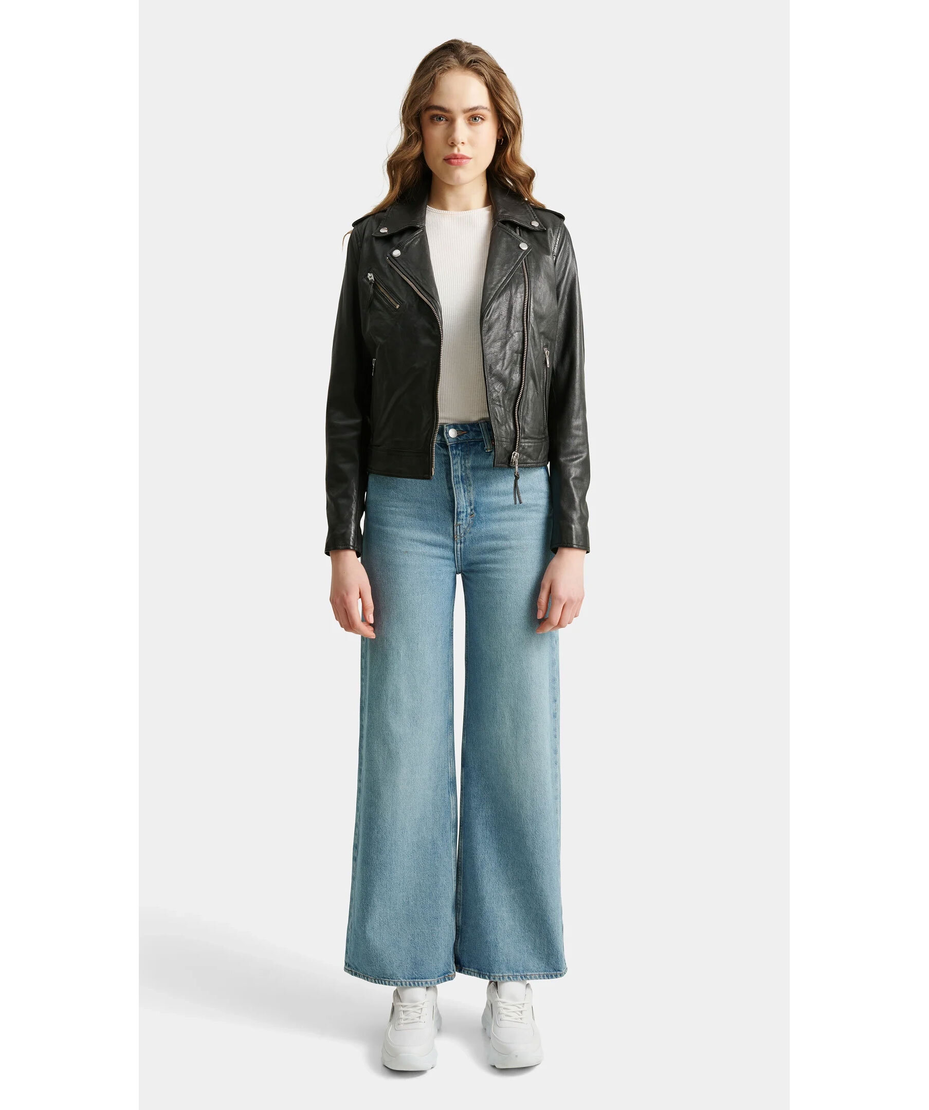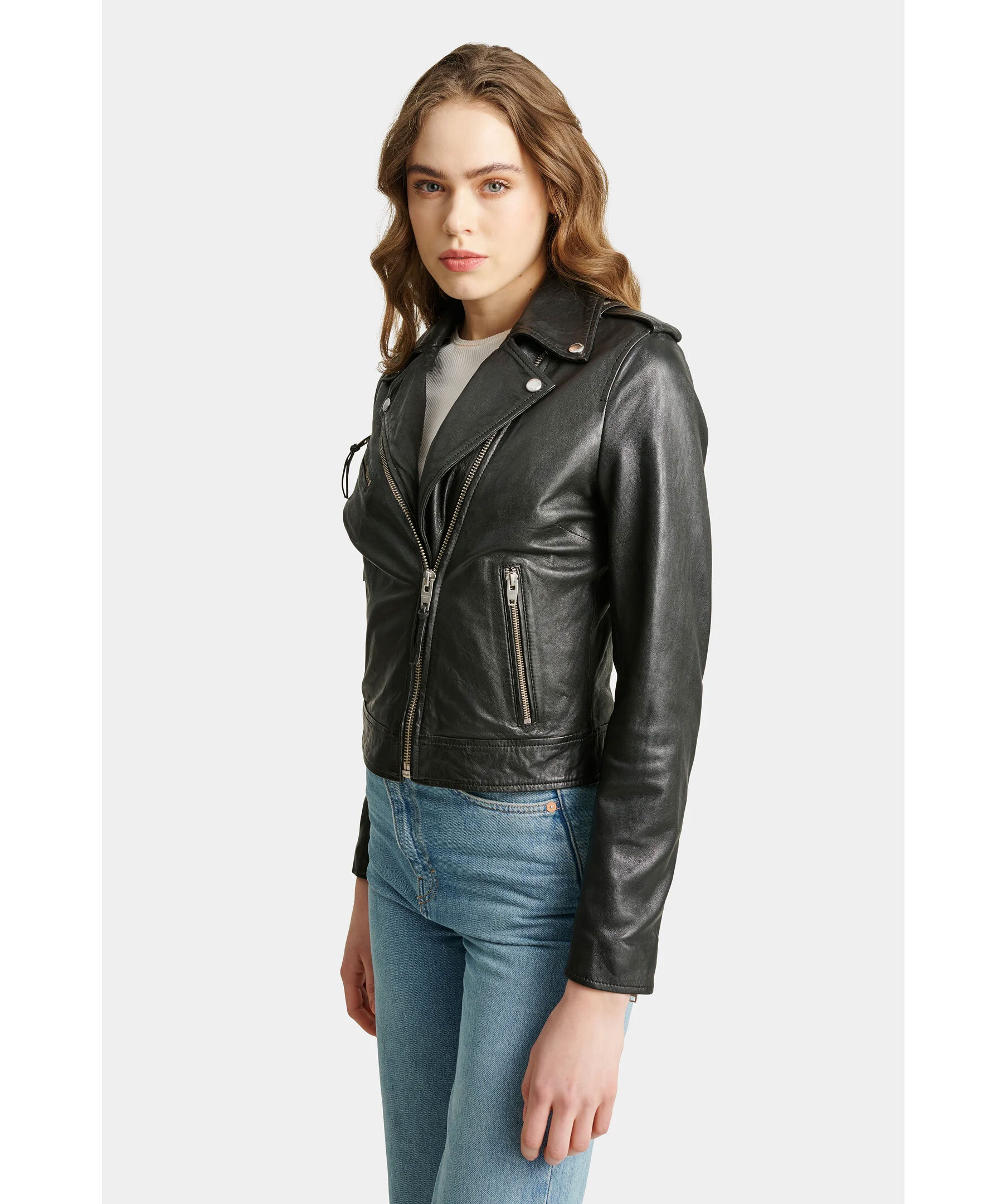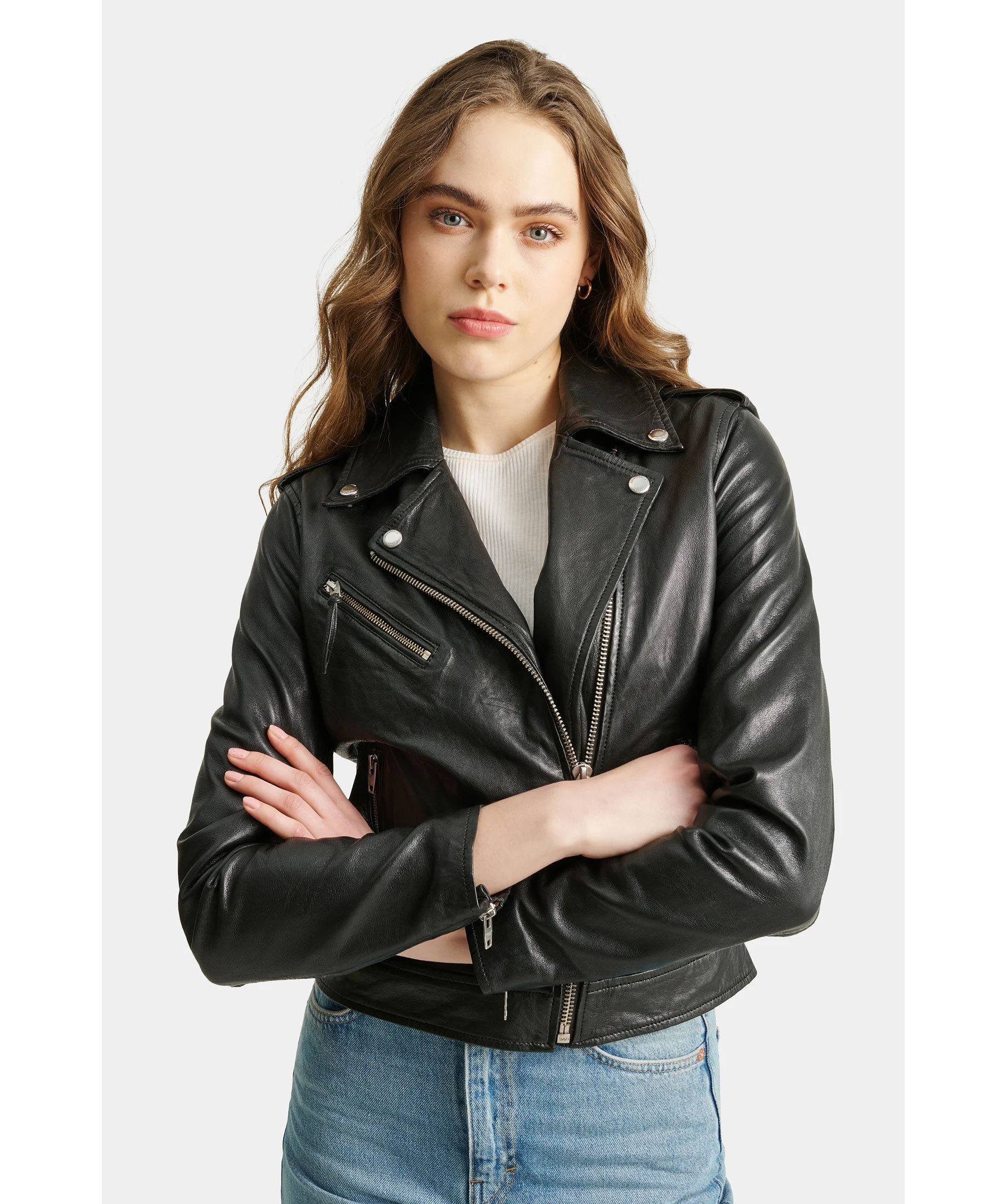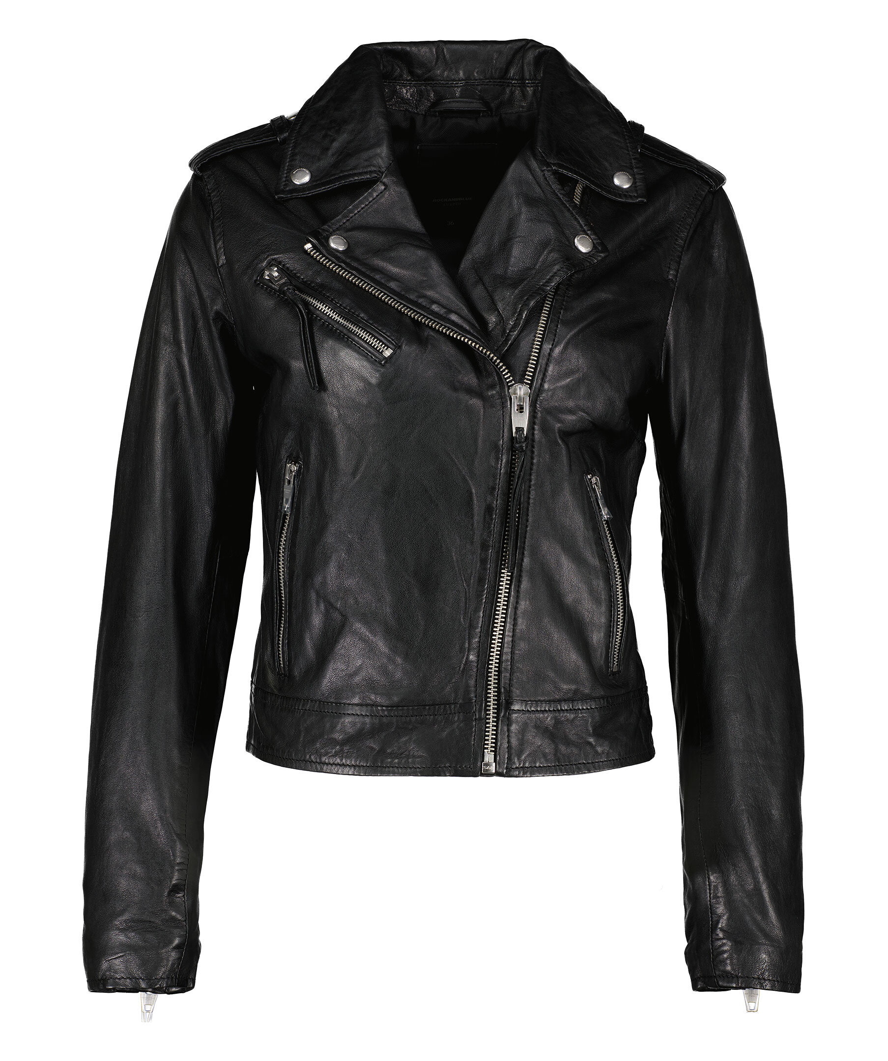 Svart jacka i läder i bikermodell från Rockandblue. Stängs framtill med dragkedja. Två fickor framtill som stängs med dragkedja. Bröstficka på höger sida som stängs med dragkedja. Axelklaffar med nitar. Ärmslut med dragkedja. Krage med nitar.