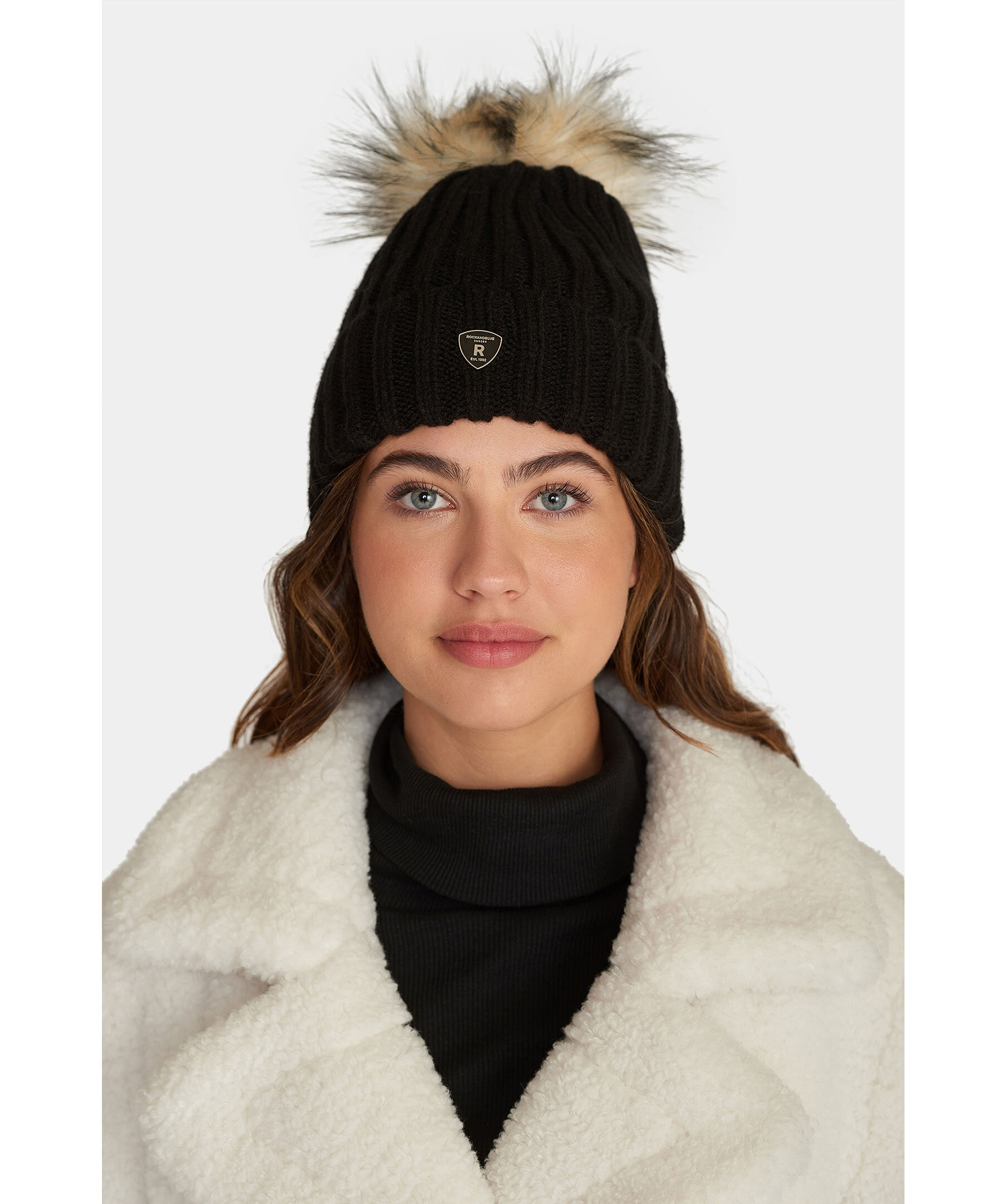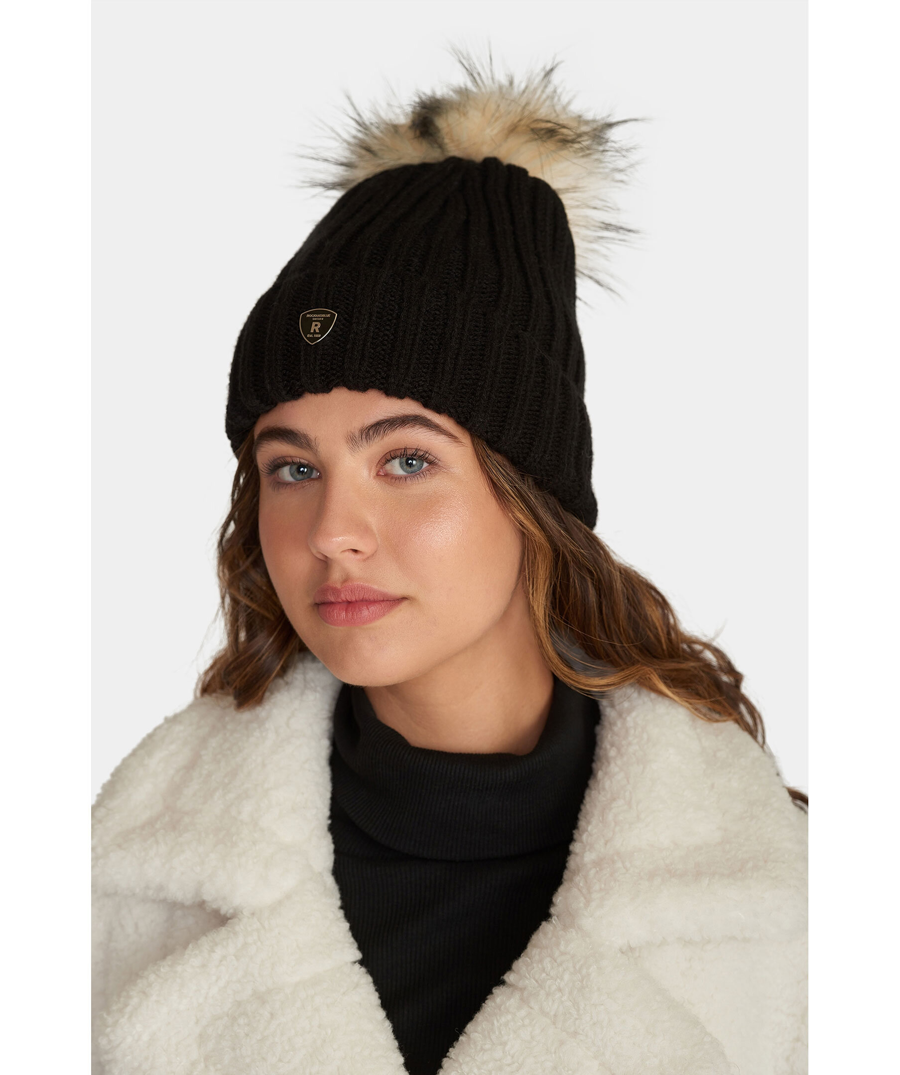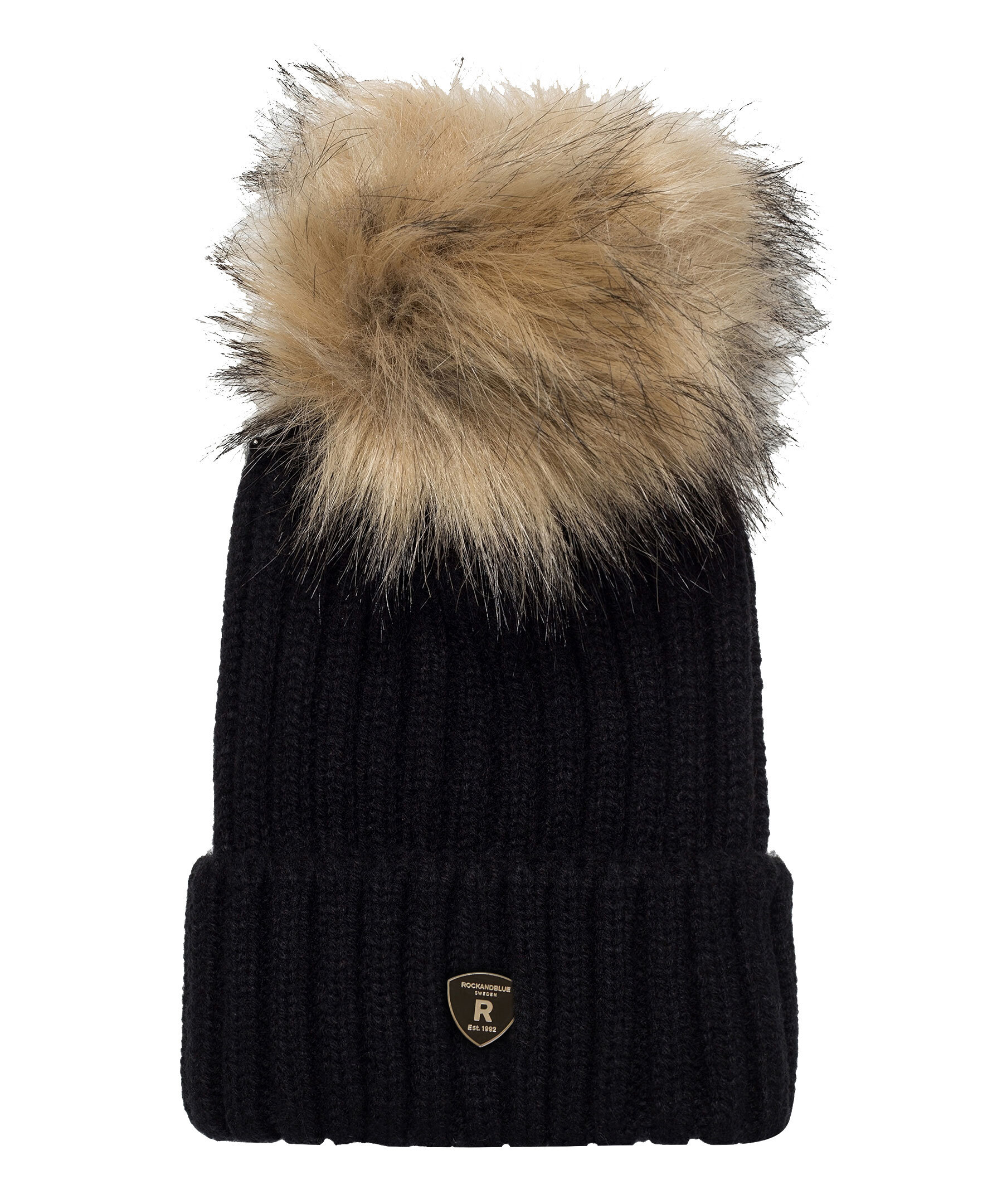 Svart, stickad mössa i ullblandning från Rockandblue med tofs i syntetpäls. Uppvikt kant med logotyp i metall på framsidan.