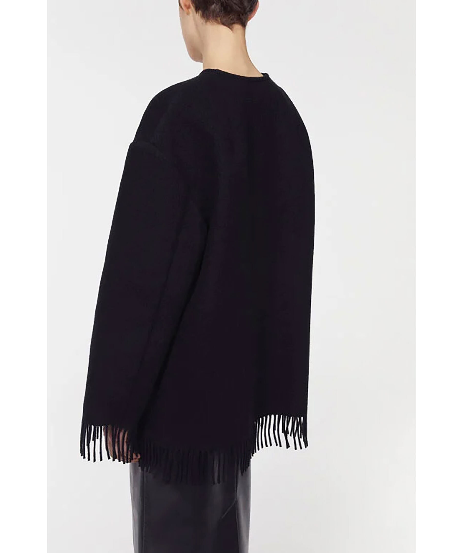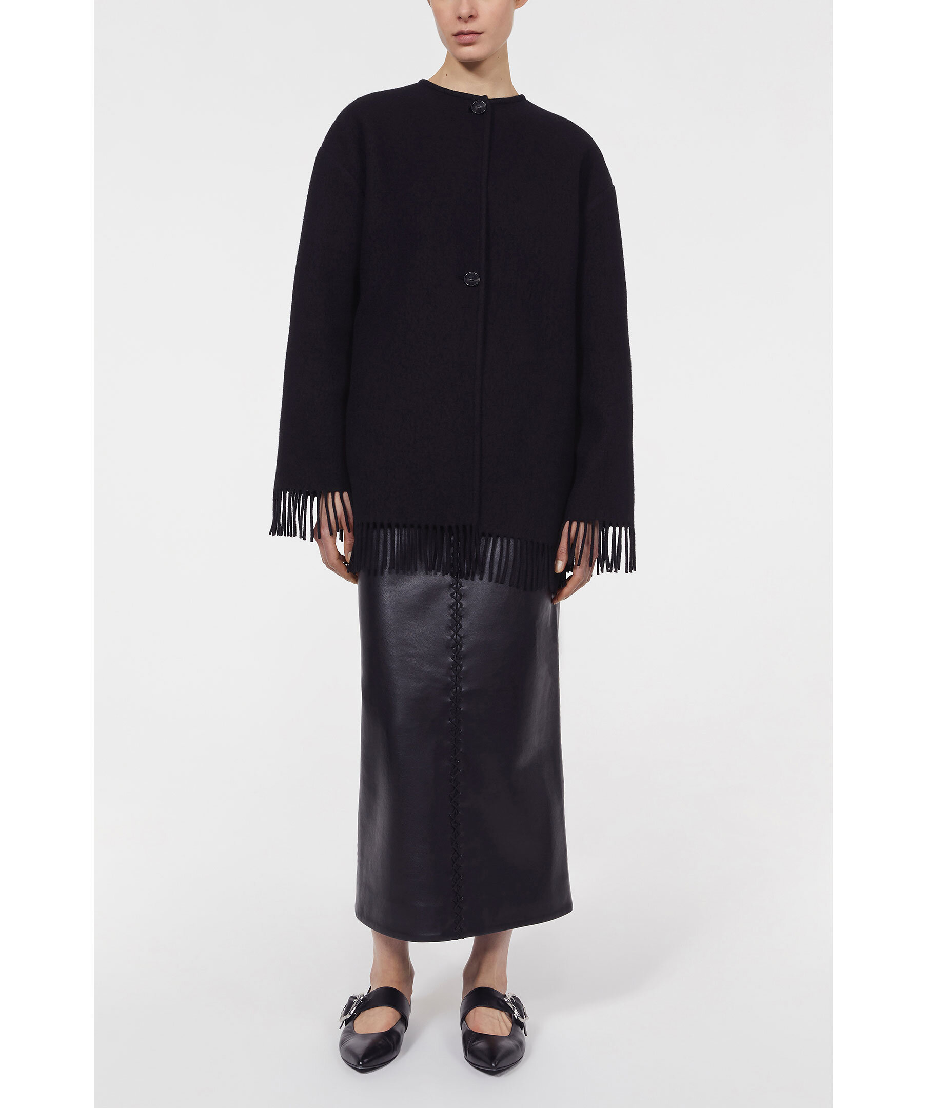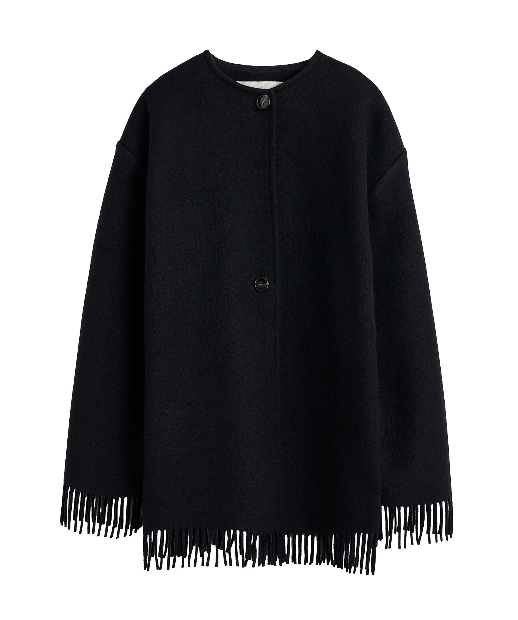 Svart ulljacka från Rodebjer. Jackan är formad till en minimalistisk siluett som knäpps med en duo knappar och har fransar vid ärm- och plaggslut. Jackan har sidofickor. Tillverkad i en ullblandning.