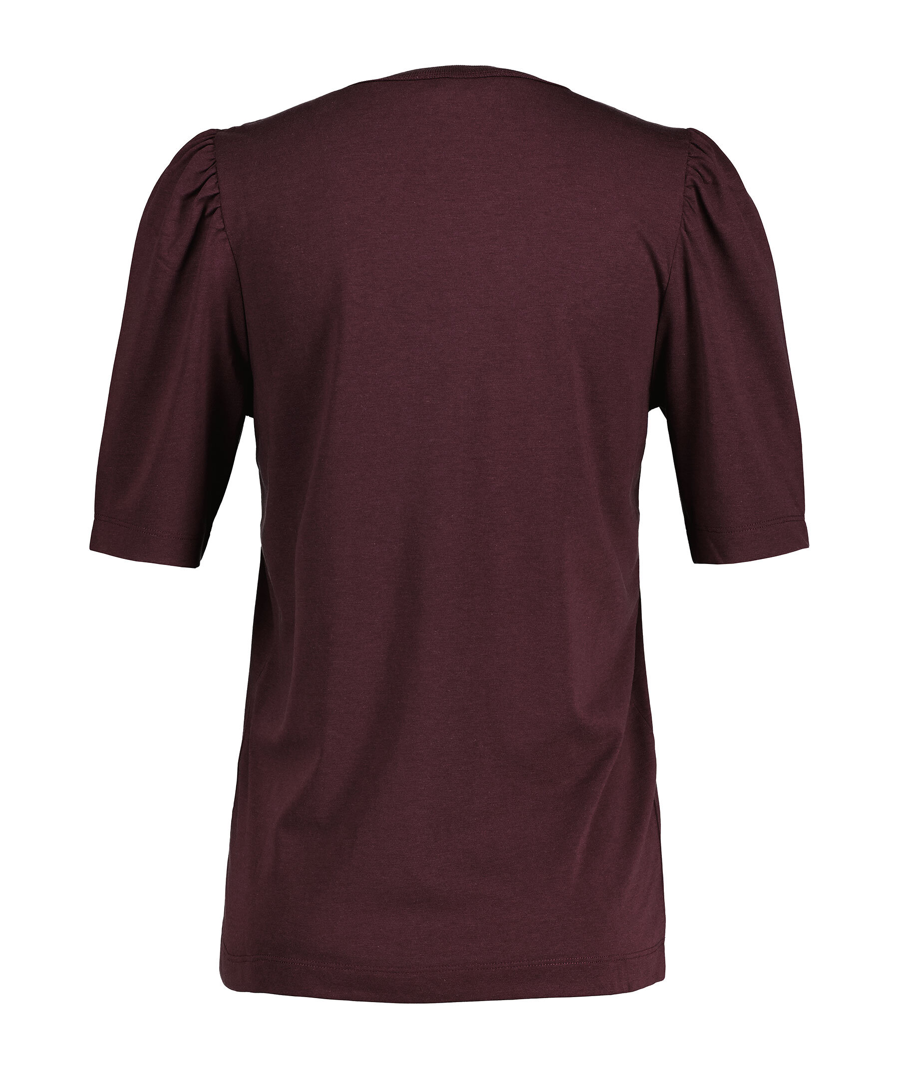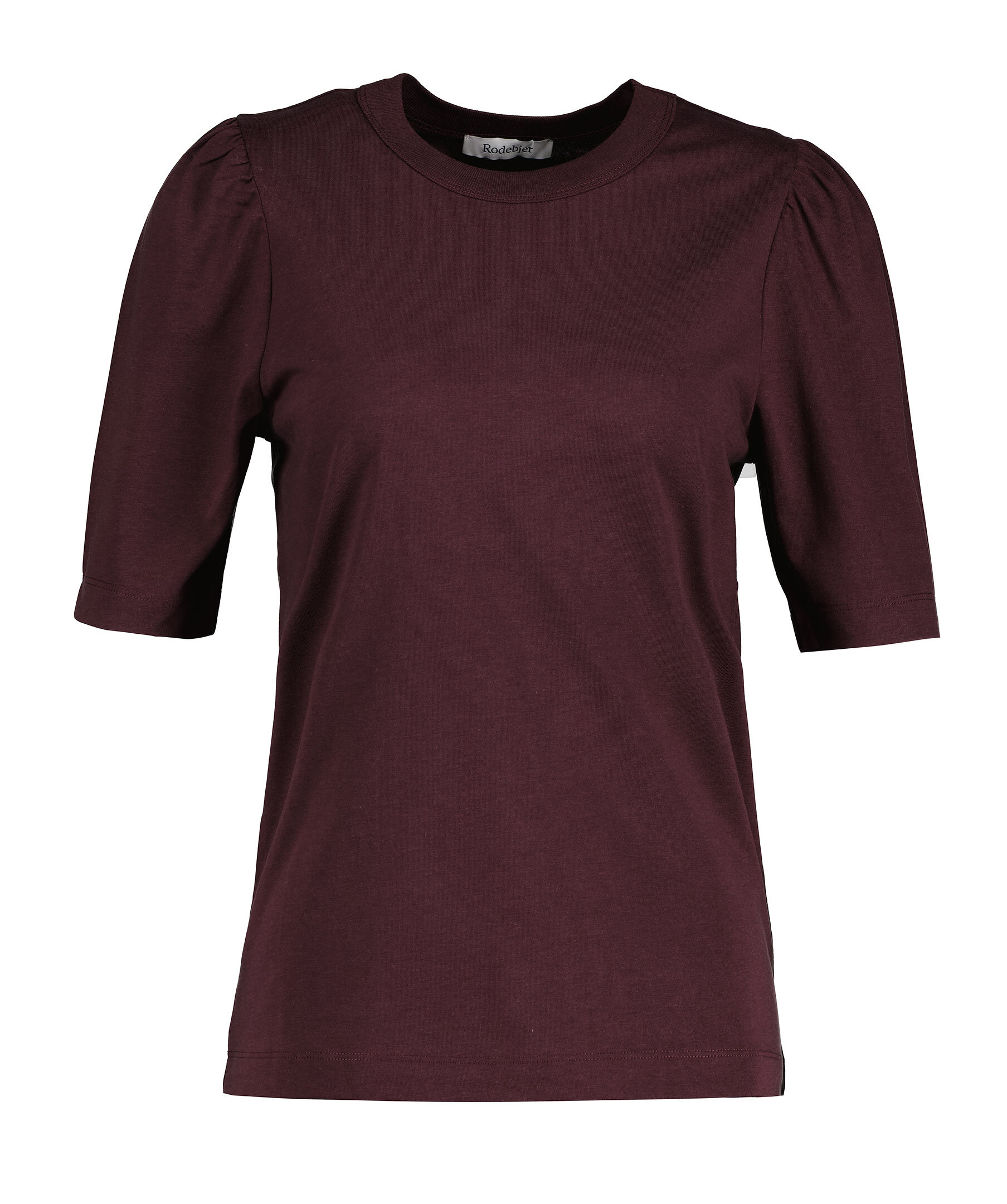 Vinröd T-shirt från Rodebjer med puffärmar, ärmen slutar strax ovanför armbågen. Tillverkad i en lyocell- och bomullsblandning. Rundad halsringning.