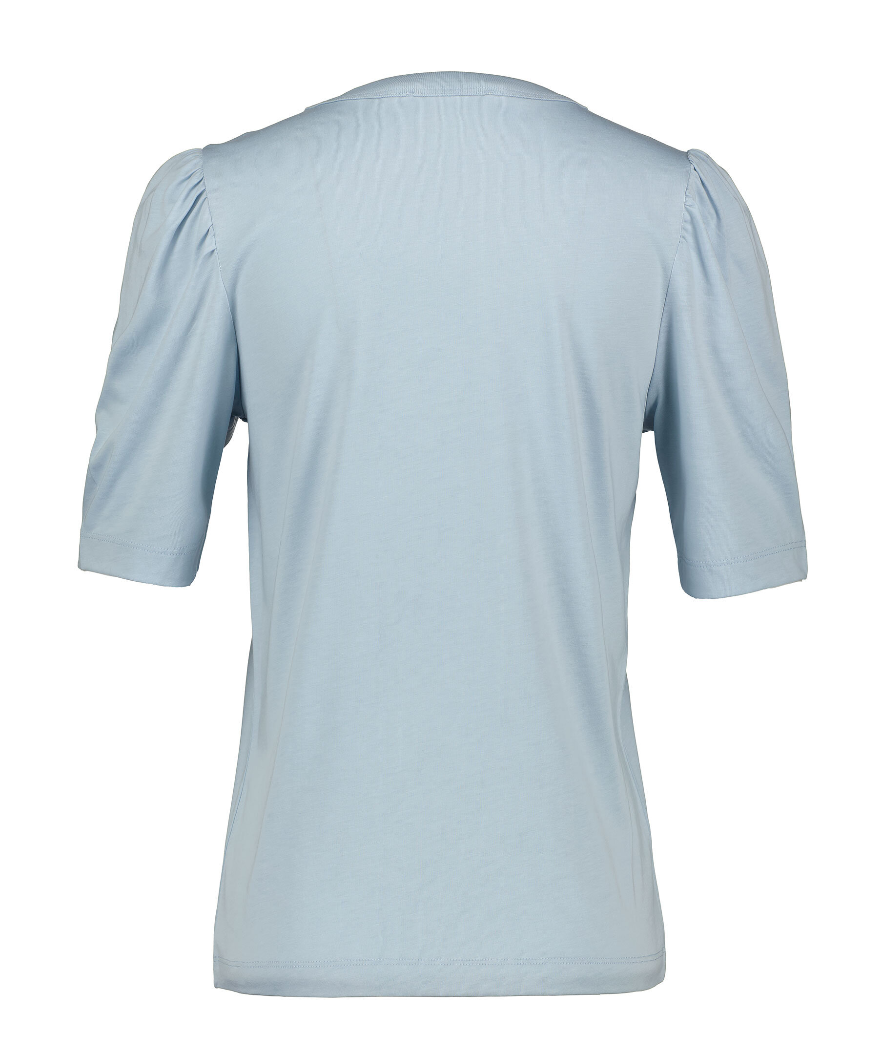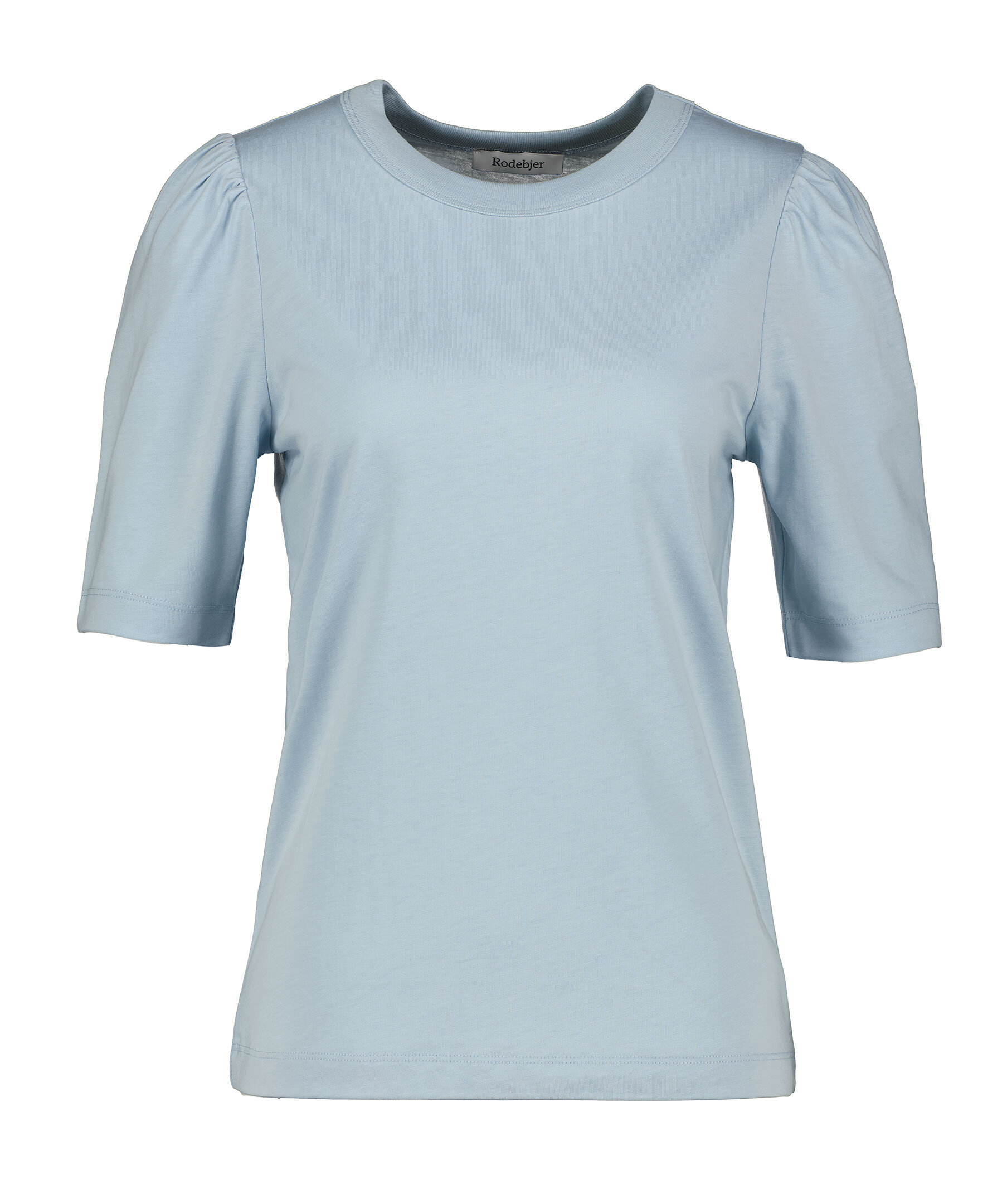 Ljusblå T-shirt från Rodebjer med puffärmar, ärmen slutar strax ovanför armbågen. Tillverkad i en lyocell- och bomullsblandning. Rundad halsringning.