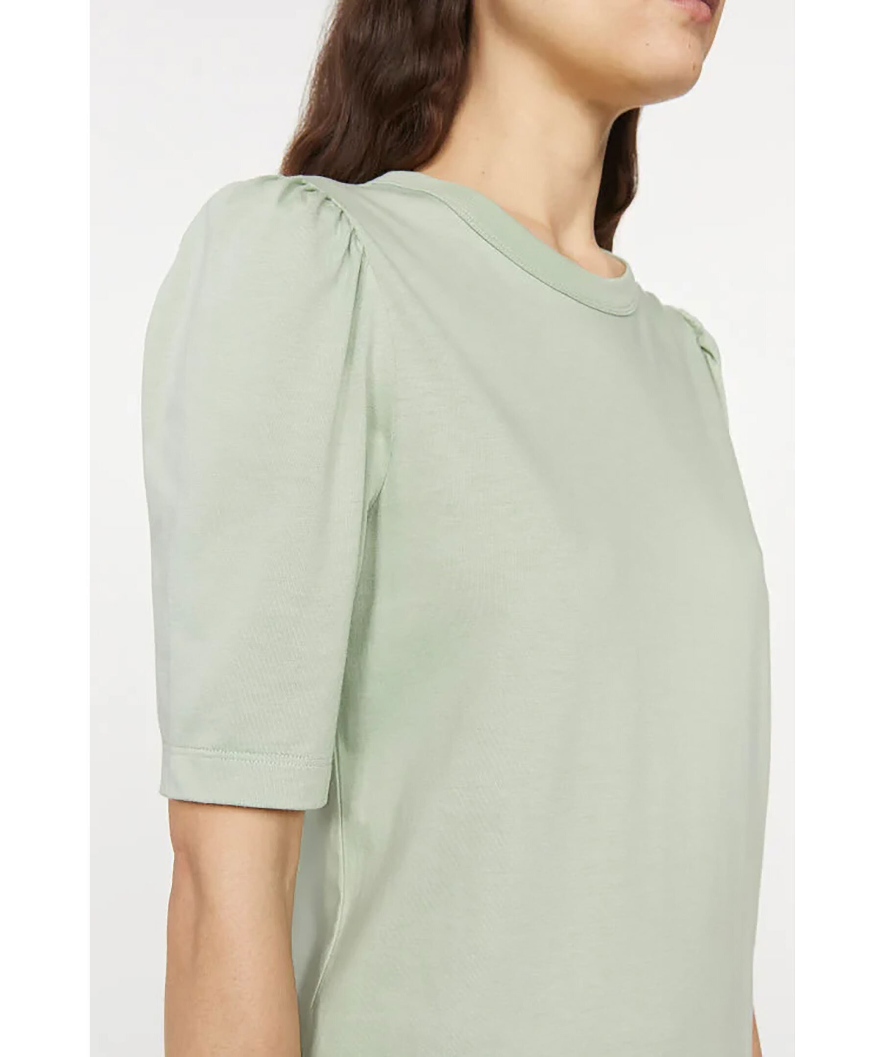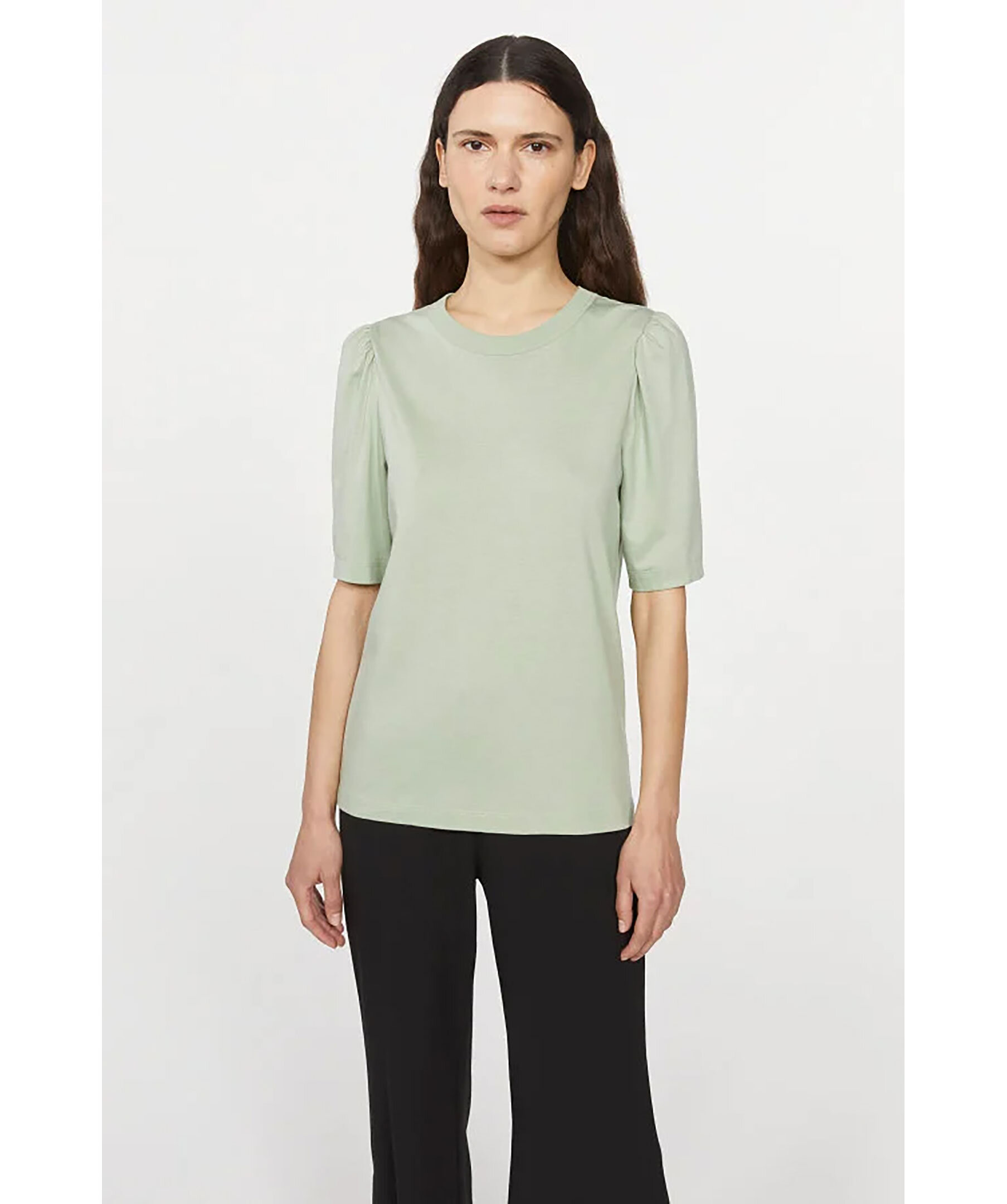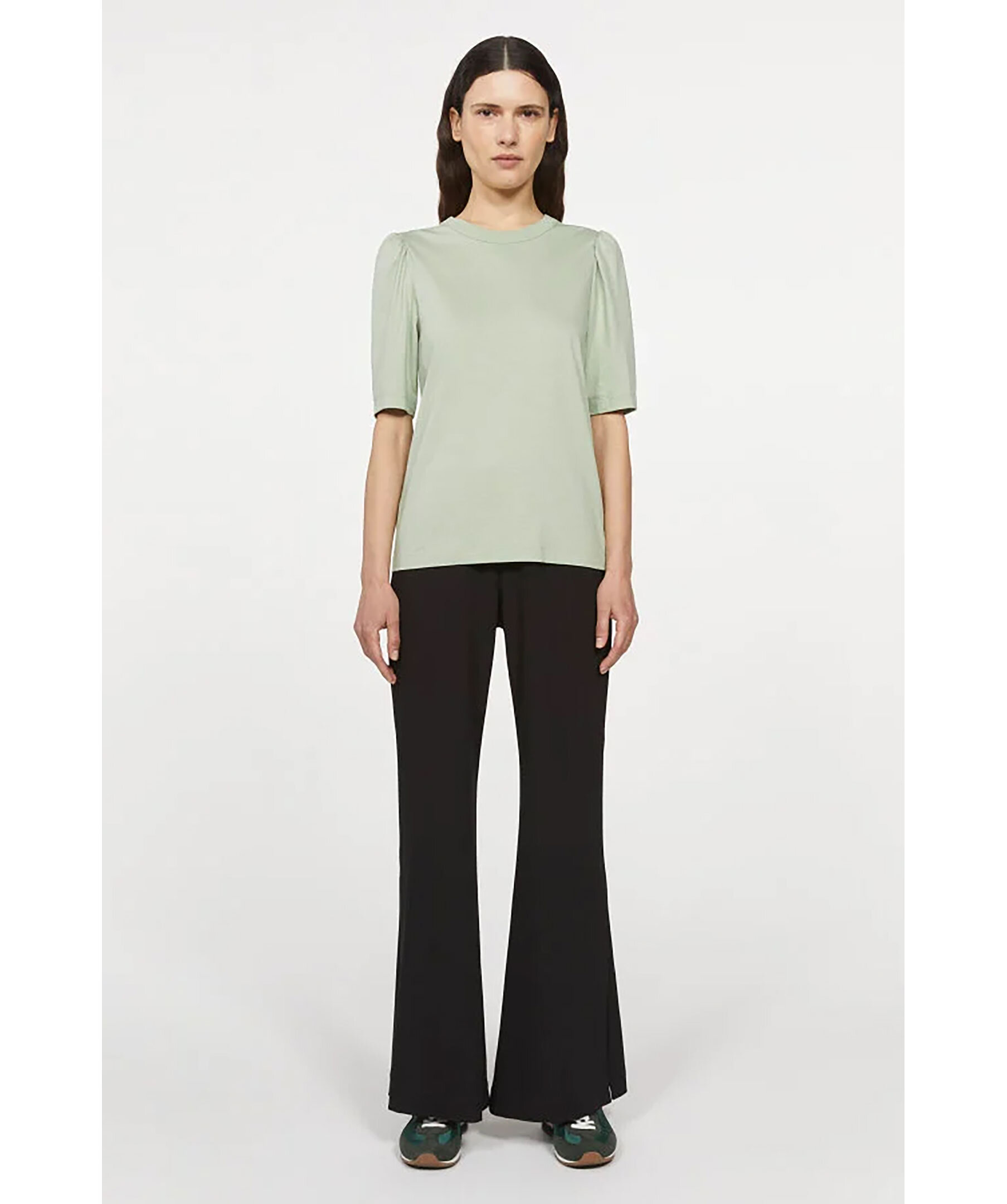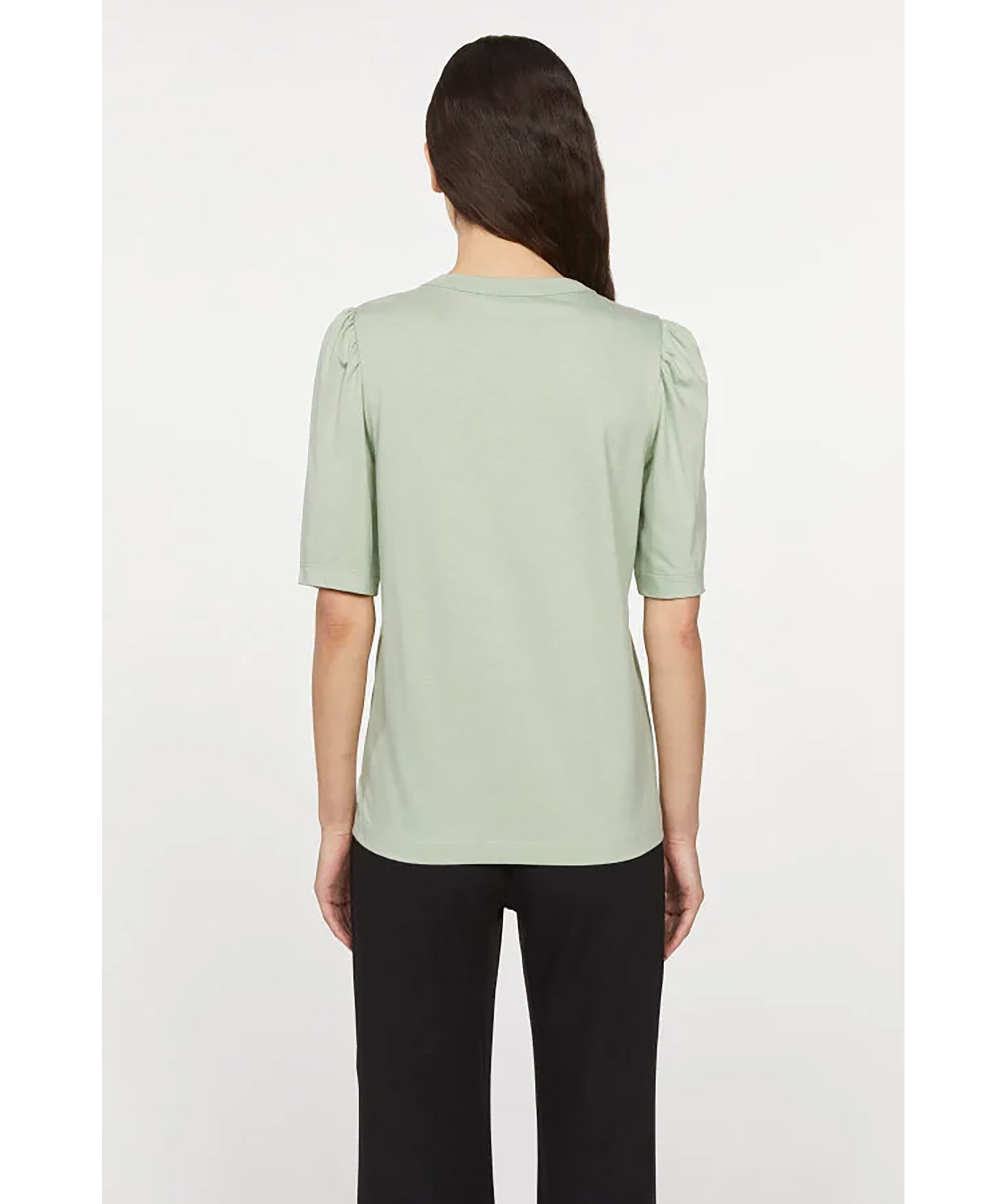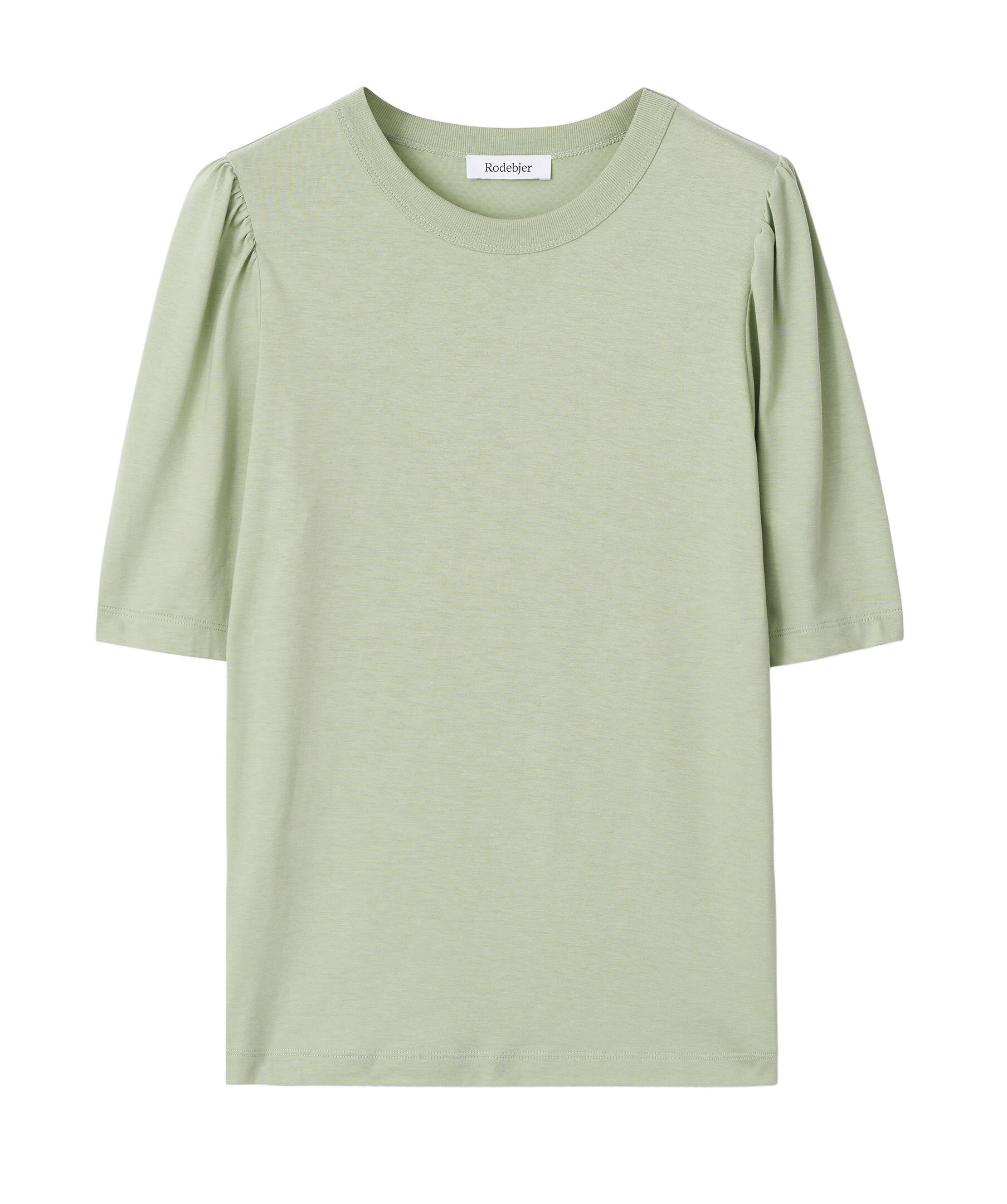 Klassisk jersey t-shirt i en salviagrön färg från Rodebjer. Skuren av mjukt lyocell och bomullsmaterial. T-shirten har något längre ärmar och puffiga axlar.
