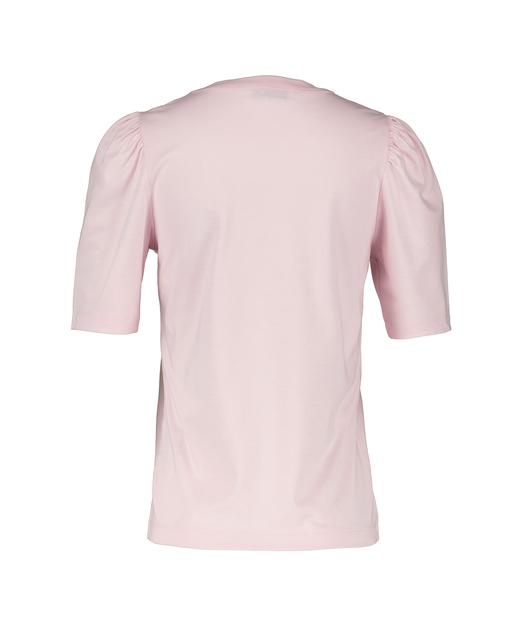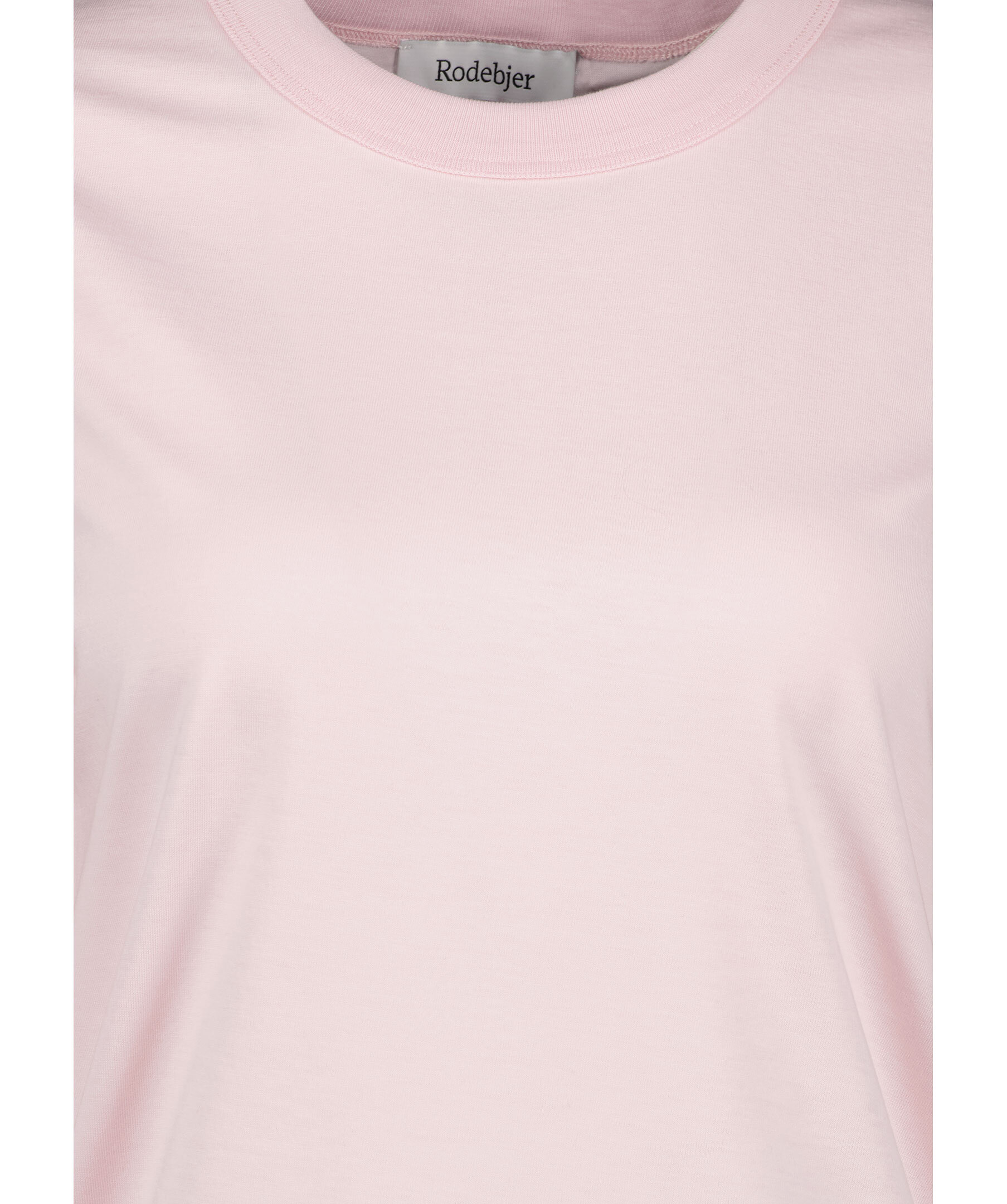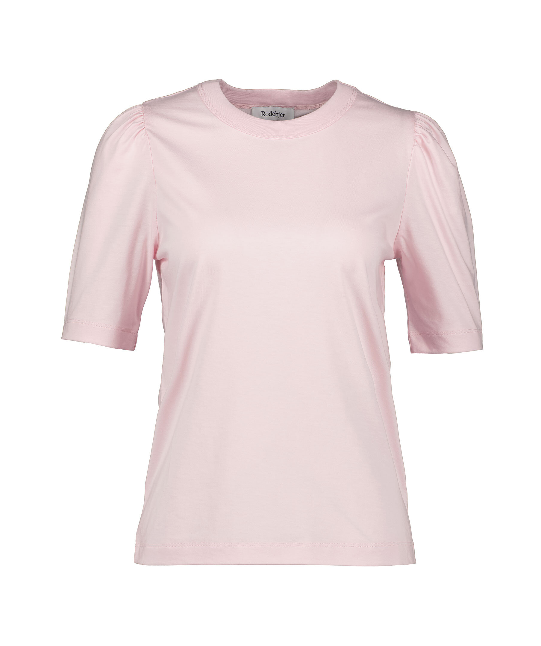 Ljusrosa T-shirt från Rodebjer med puffärmar, ärmen slutar strax ovanför armbågen. Tillverkad i en lyocell- och bomullsblandning. Rundad halsringning.