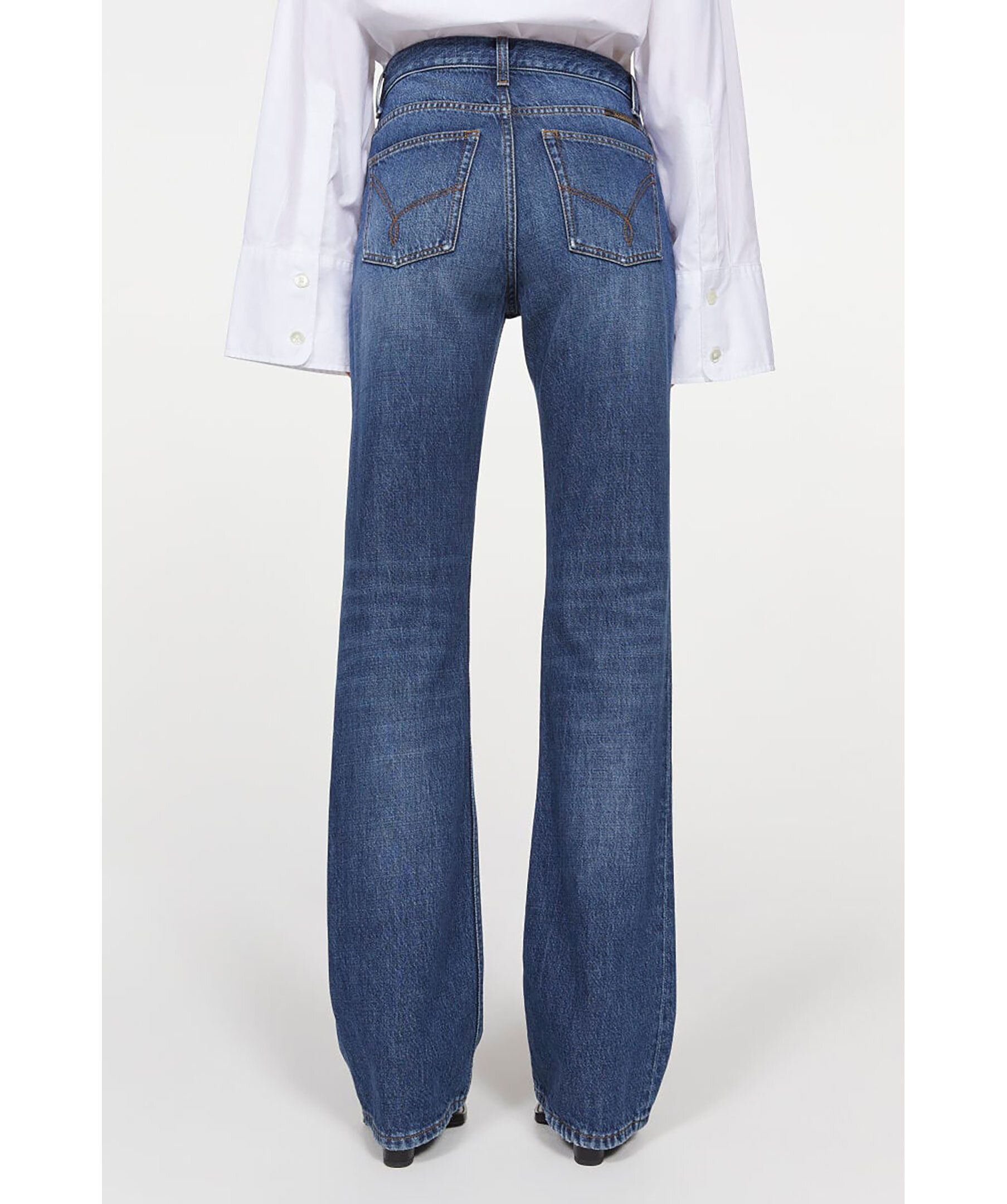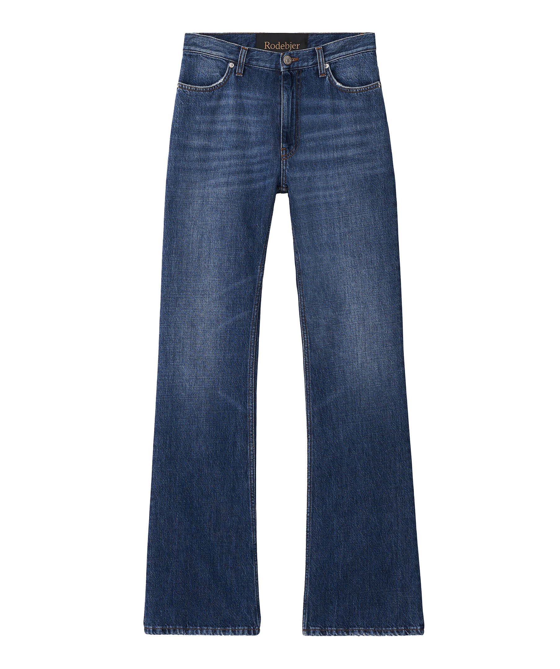 Blåa utsvängda jeans från Rodebjer. Jeansen har en hög midja med bälteshällor, fyra fickor samt är behandlade med en vintage-tvätt för en retro, levande look. Tillverkade i 100 % GOTS-certifierad ekologisk bomull.
