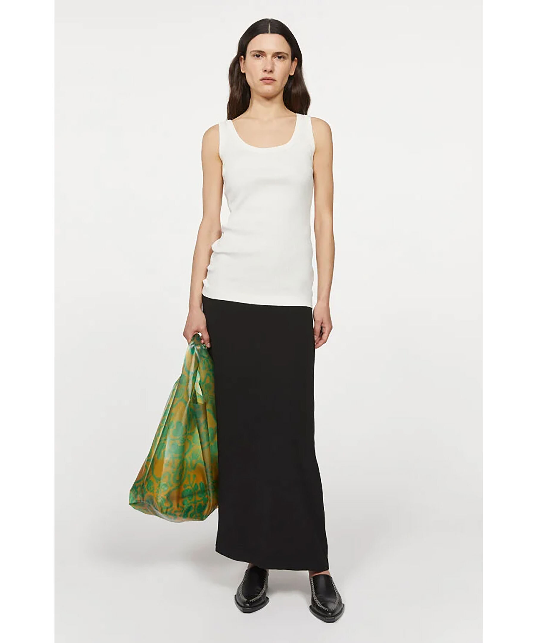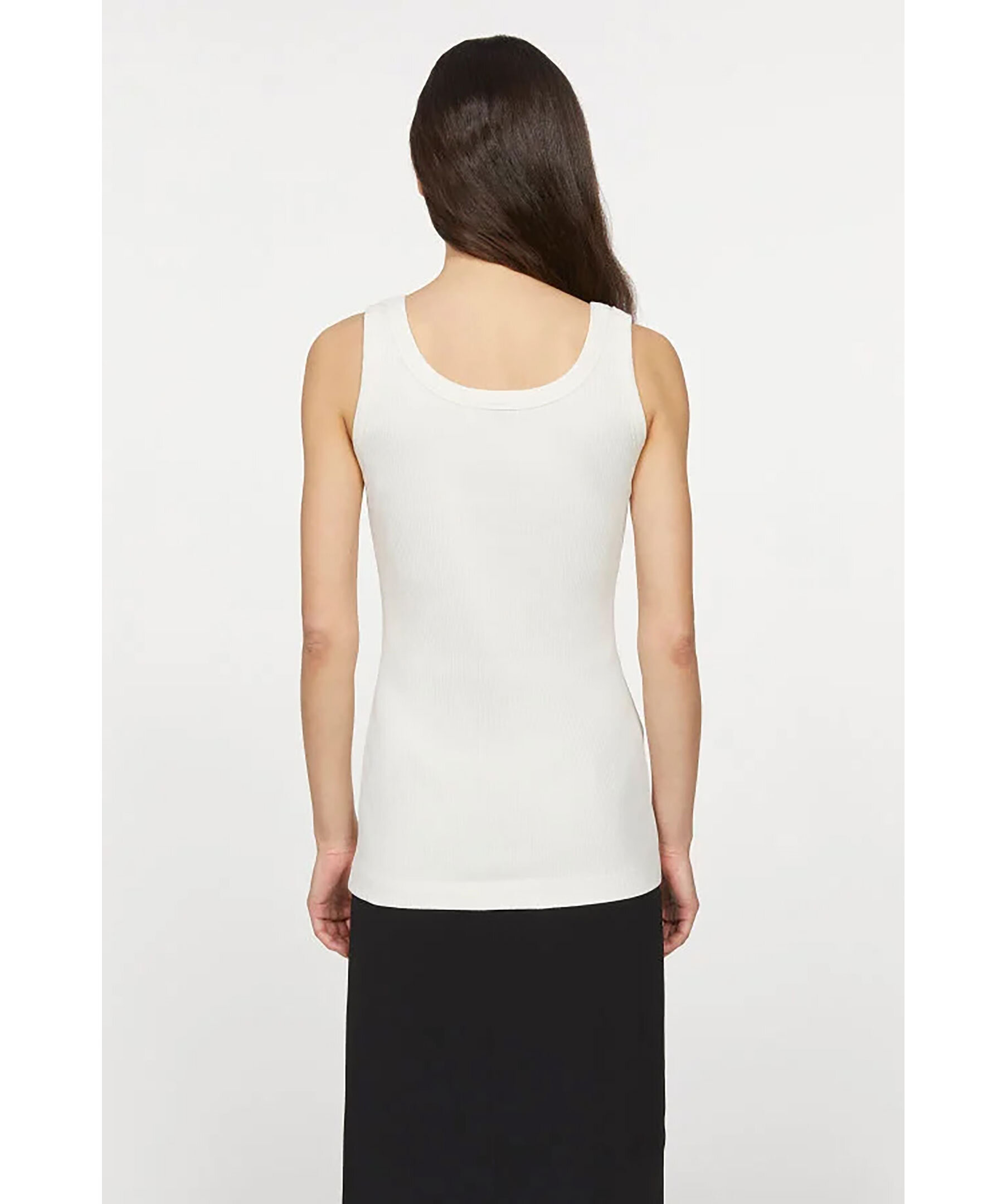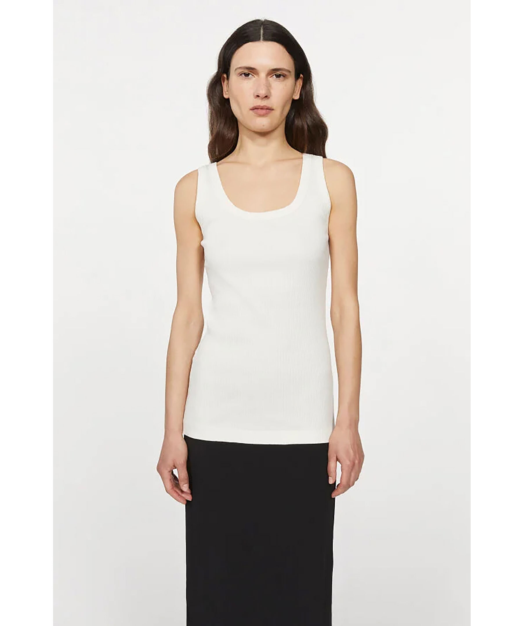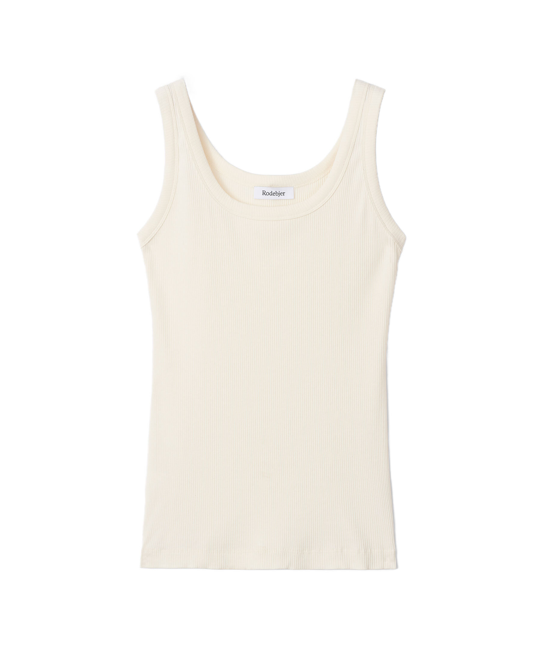 Vitt, sportigt linne i ribbad modell från Rodebjer. Tillverkad av GOTS-certifierad ekologisk bomull. Kombinera din med denim eller skrädderi. Linnet har något bredare axelband.
