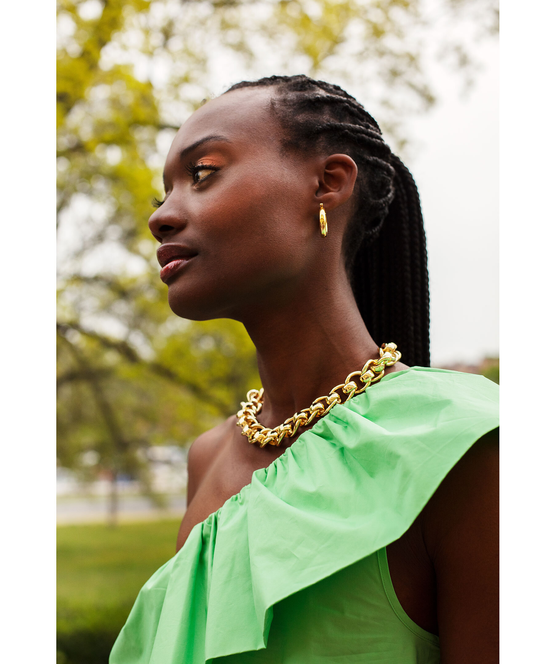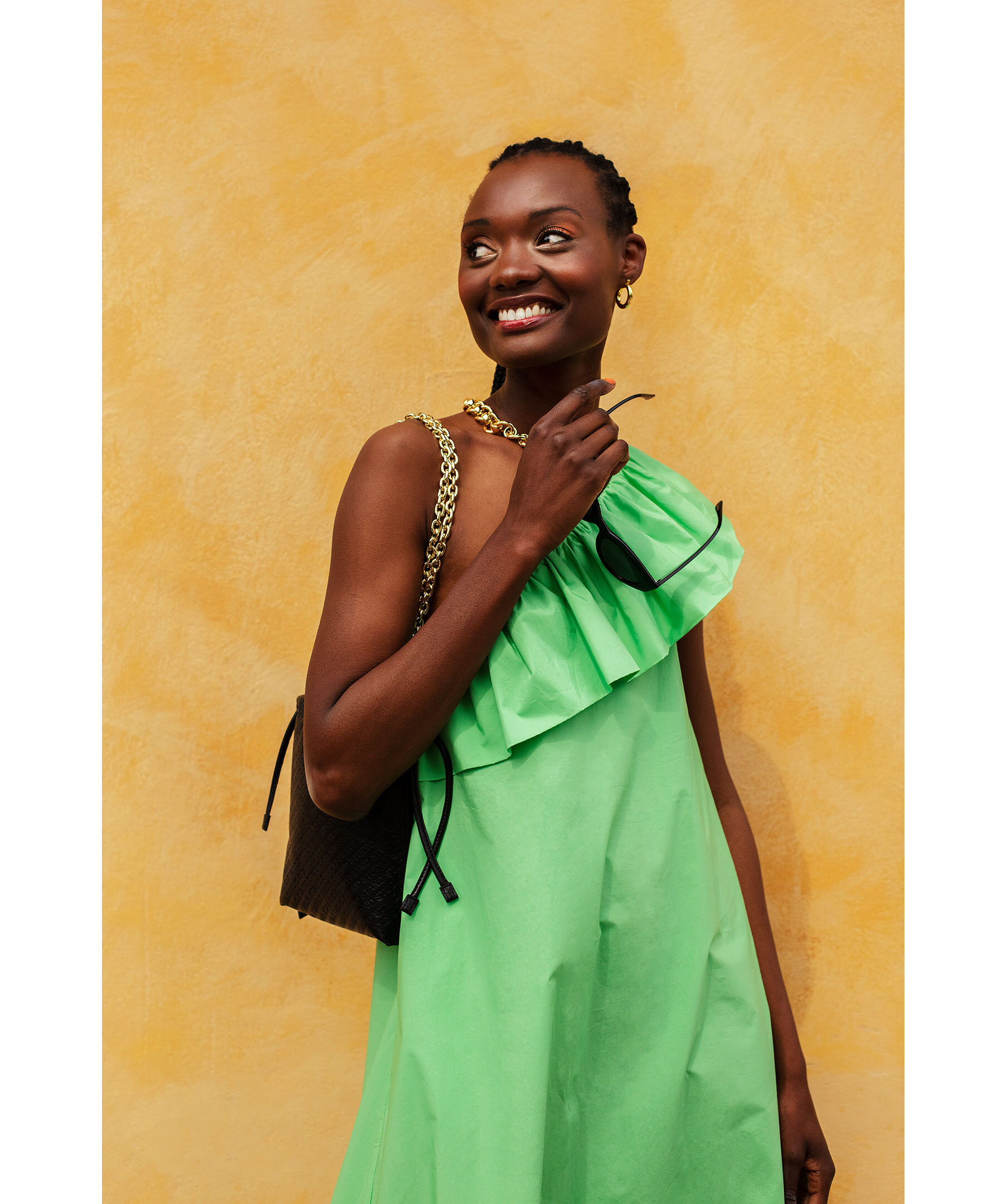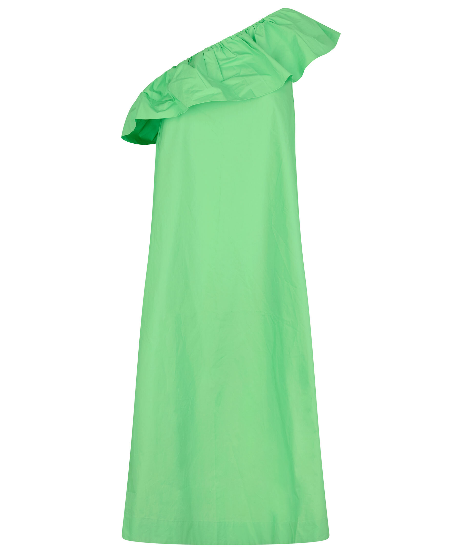 Grön one-shoulder klänning från Second Female. Tillverkad i lätt och smidig ekologisk bomull. Med en axeldesign med asymmetrisk halsringning och volangkant. Dolda fickor i sidsömmarna. Lätt A-siluett som skapar en enkel och feminin siluett. Klänningen slutar mitt på vaden och har en vid siluett.