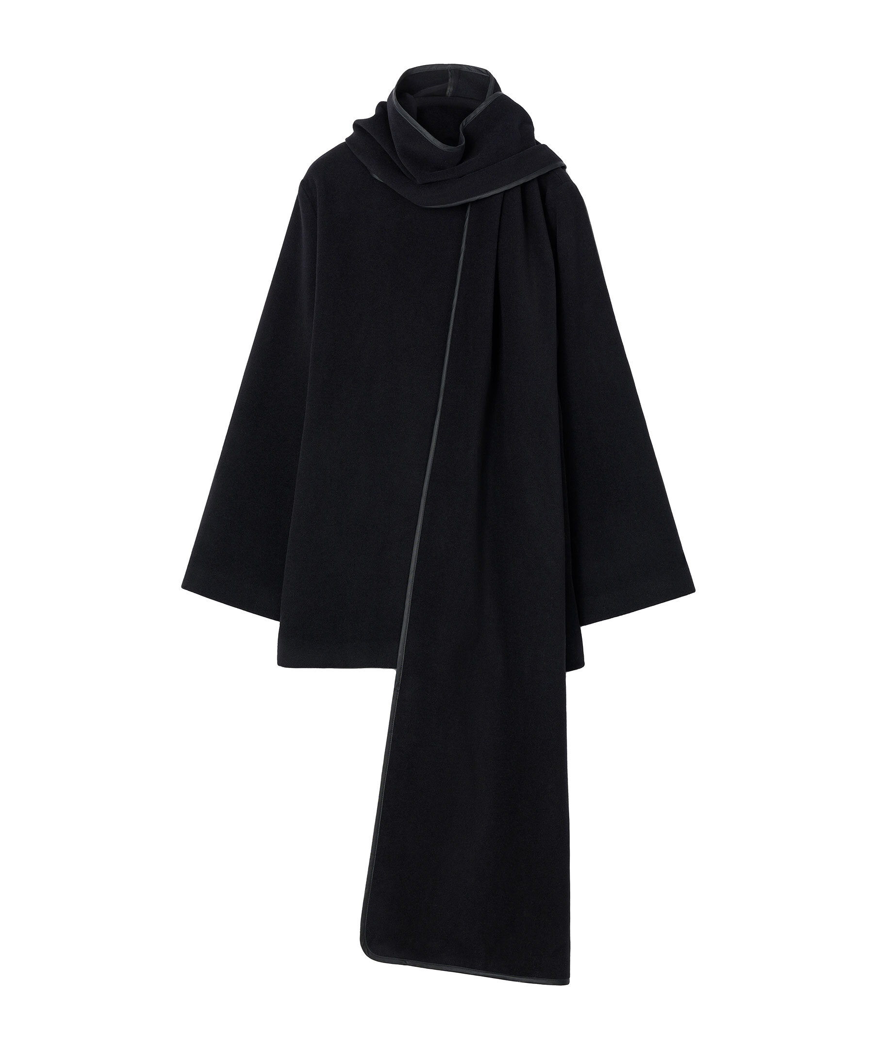 Svart kort kappa i ullblandning från Rodebjer. Kappan har en inbyggd scarf som håller dig extra varm. Avslappnad passform, två framfickor och stängs med två knappar; en vid halsen och vid plaggets mitt. Modellen är 179cm lång och har på sig storlek S.