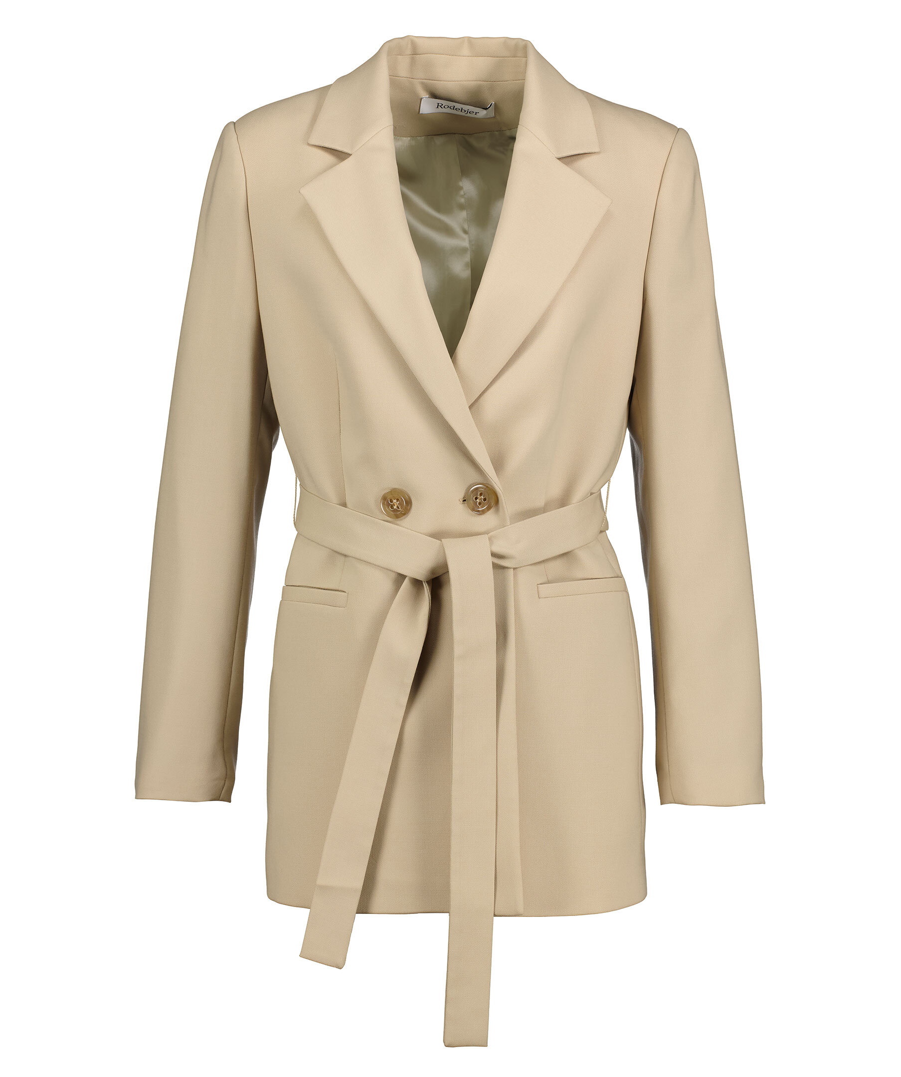 Dubbelknäppt kavaj från Rodebjer i färgen oyester. Avtagbart bälte. Sprund baktill. Två fickor framtill. Designad för avslappnad passform, gå ned en storlek för en mer figurnära passform.