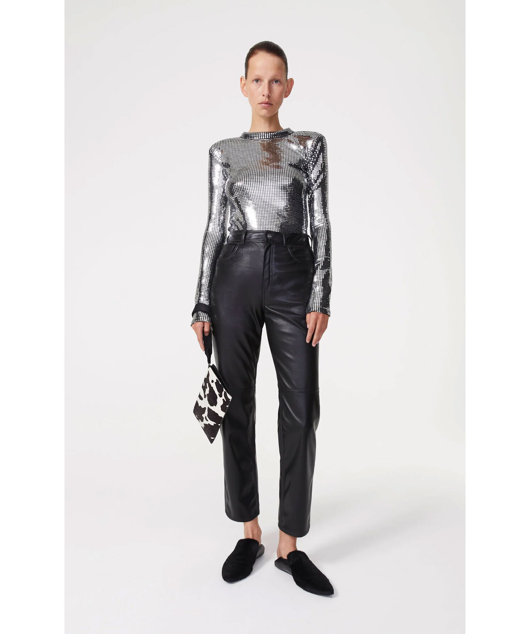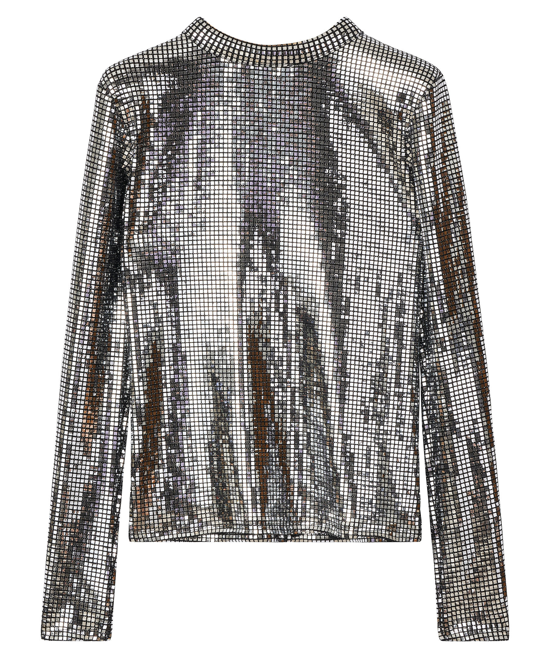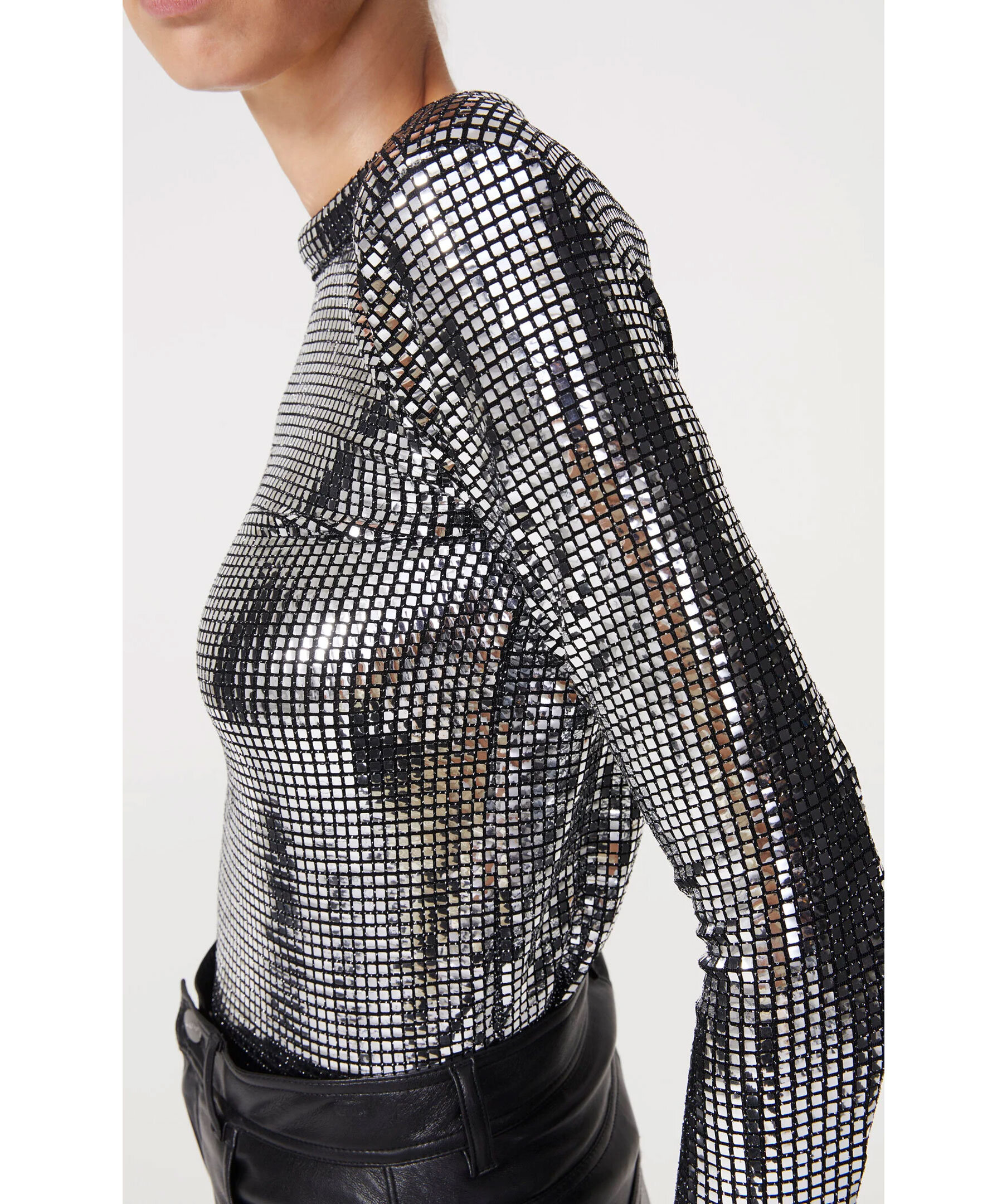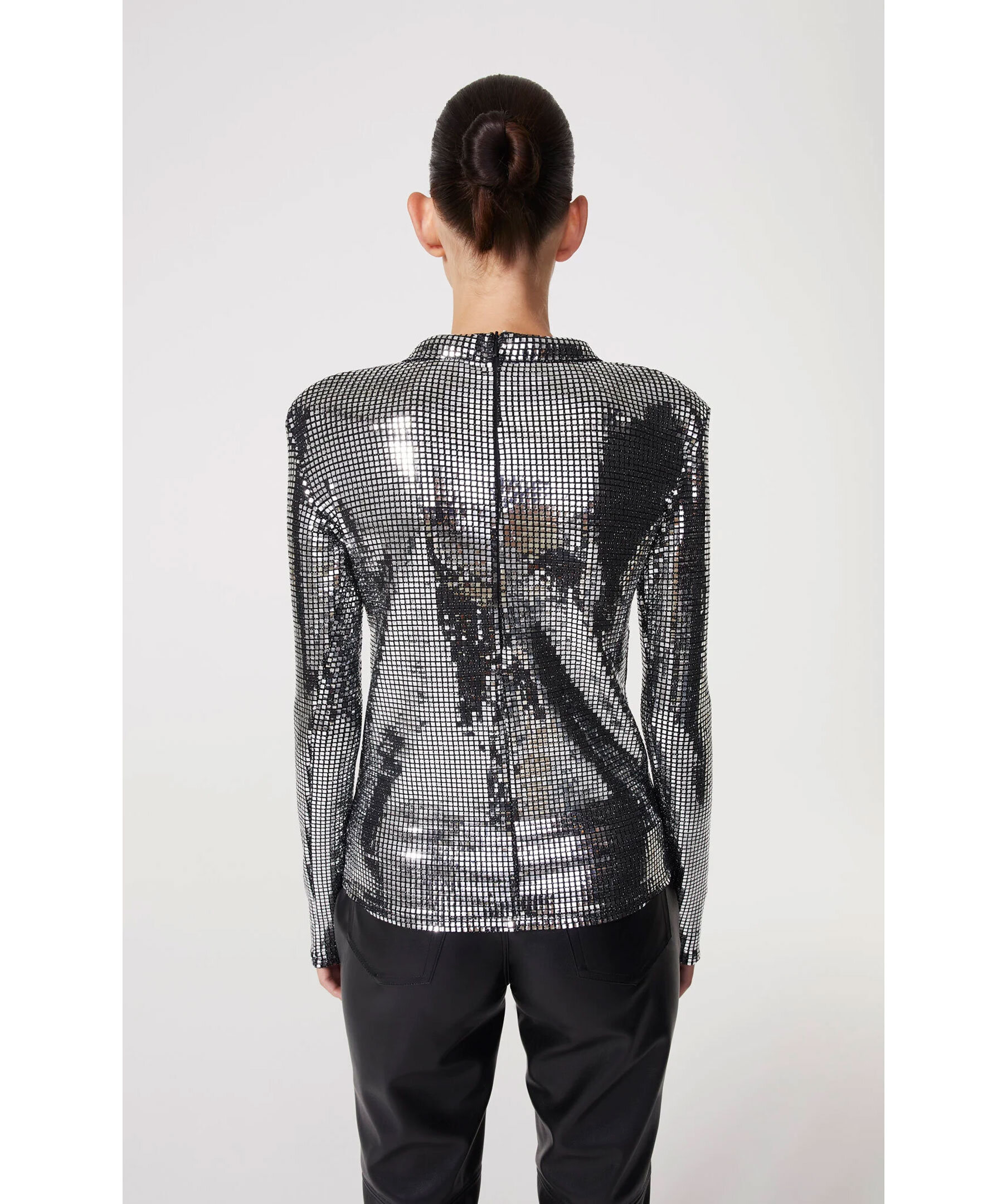 Figursydd paljettröja från Rodebjer. Smala ärmar i normal längd, vadderad krage och axelvaddar för en skarp look. Dragkedja baktill som gör den lätt att dra på. Modellen är 177 cm lång och bär storlek S. Denna topp är liten i storlek, vi rekommenderar att du går upp 1-2 storlekar.