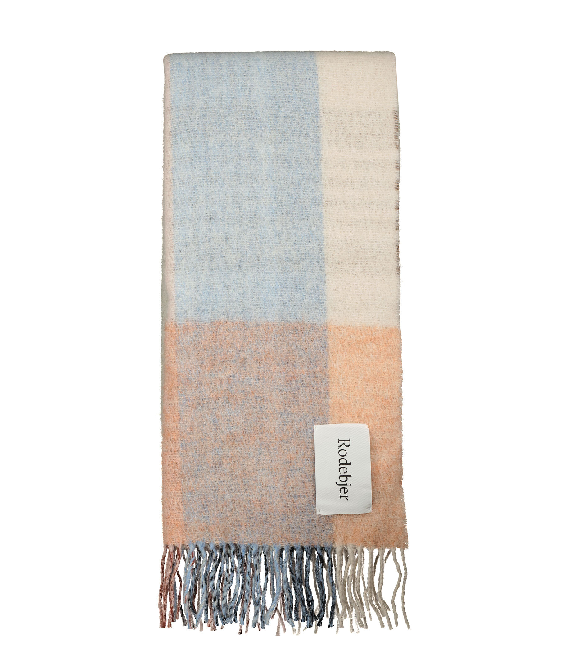 Mys i den pastellfärgade Mate-halsduken från Rodebjer. En ombonad scarf vävd i en mjuk ullblandning och mönstrad med dubbelsidig rutig. Halsduken är avslutad med fransar och en stor Rodebjer-logga.