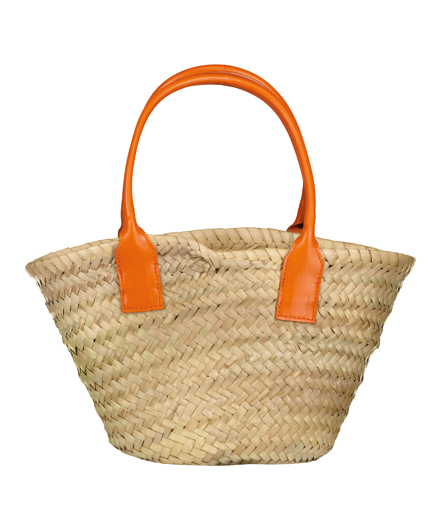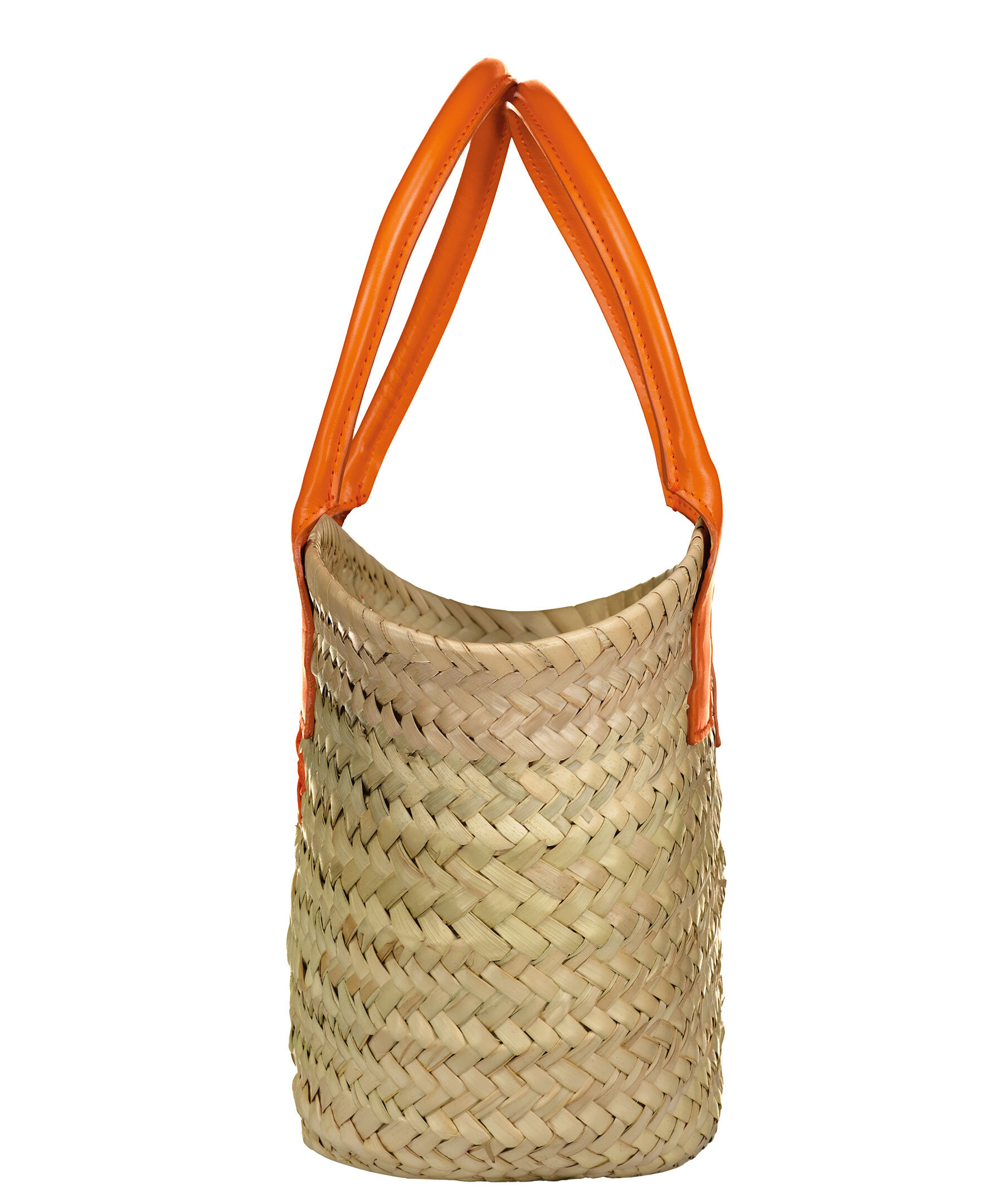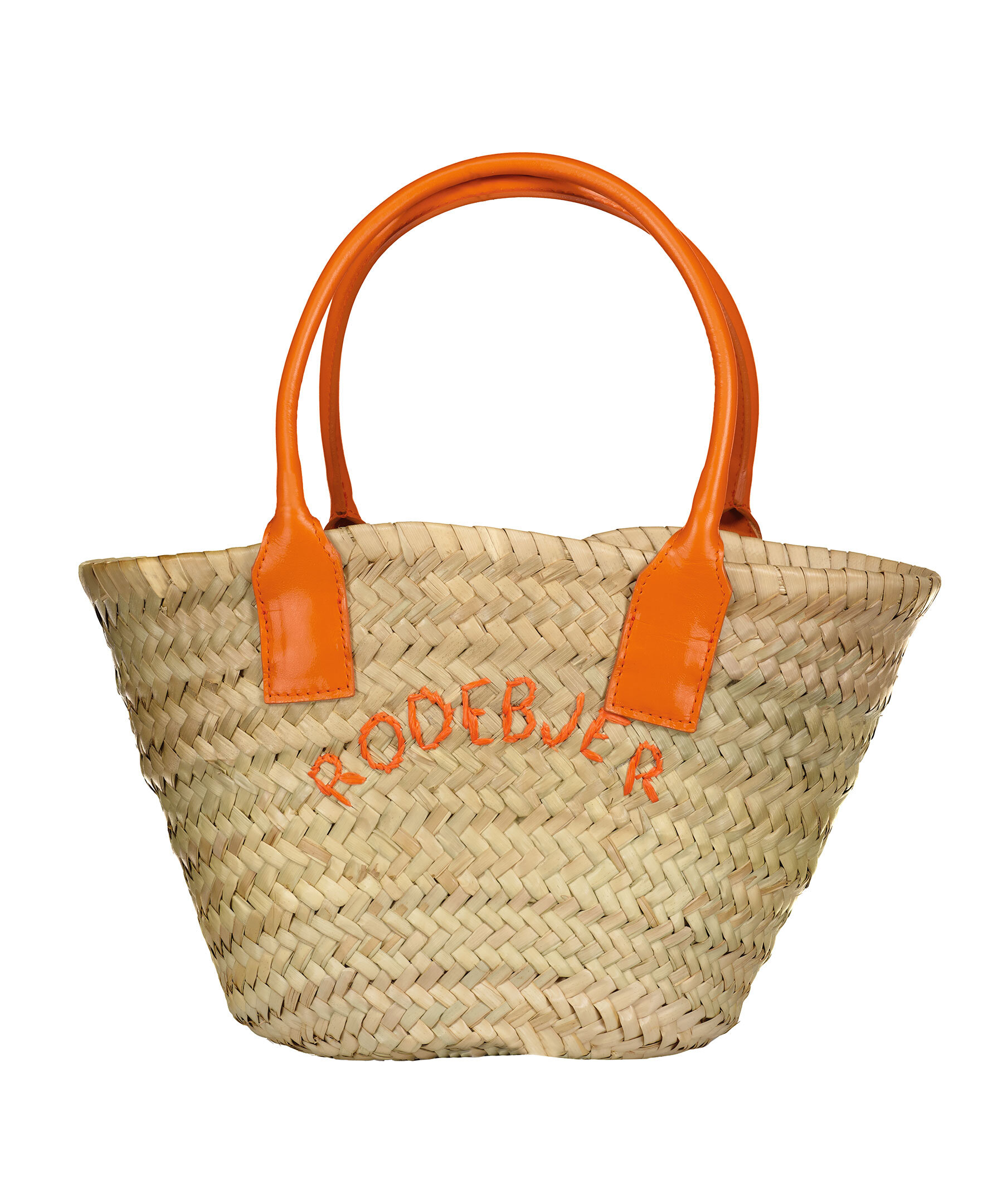 Liten tote bag i strå material från Rodebjer. Läderhandtag i orange, handtagets höjd är 16cm. Broderad logotyp på väskans framsida. Väskans mått: B 33cm H 20cm D 8cm
