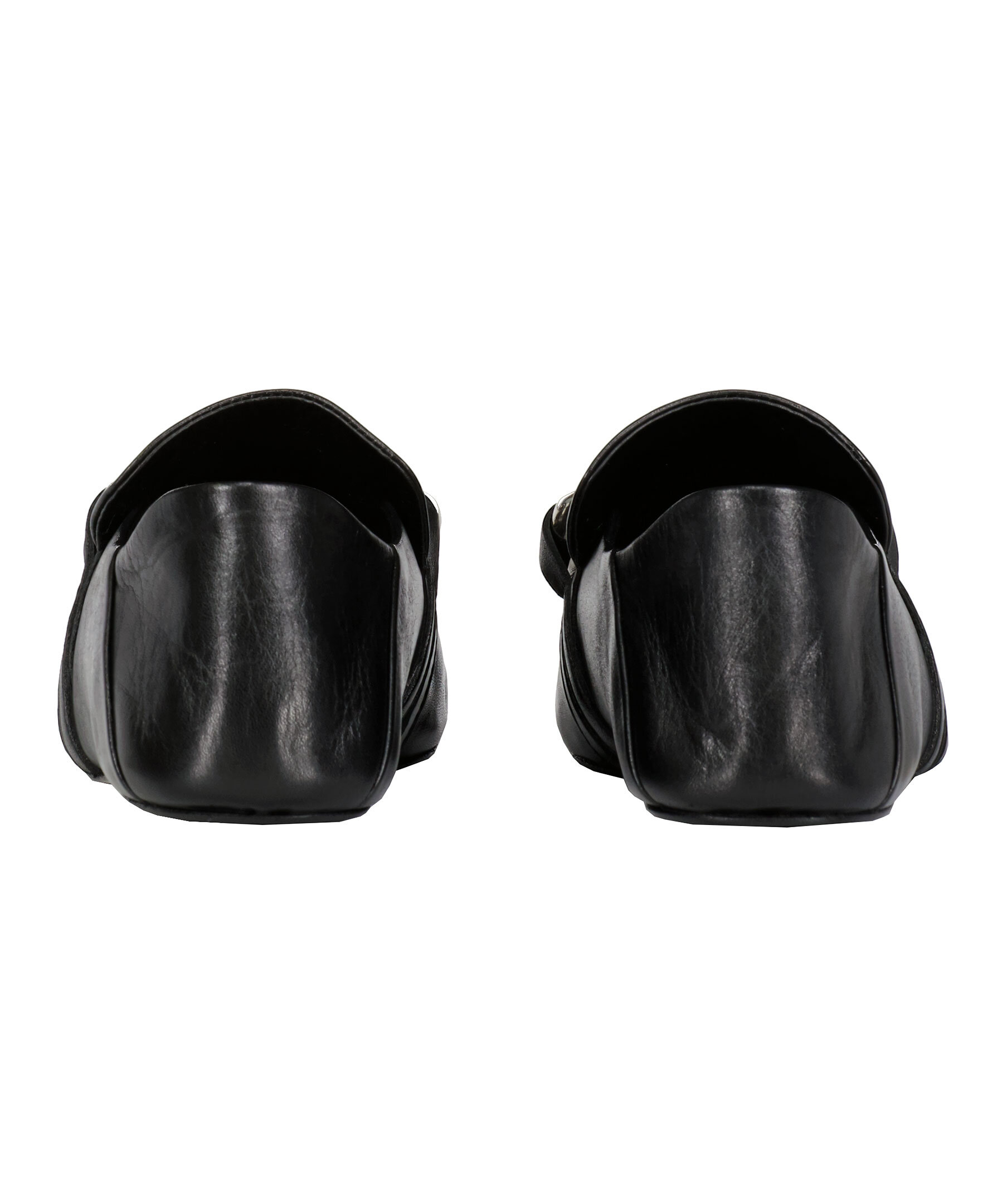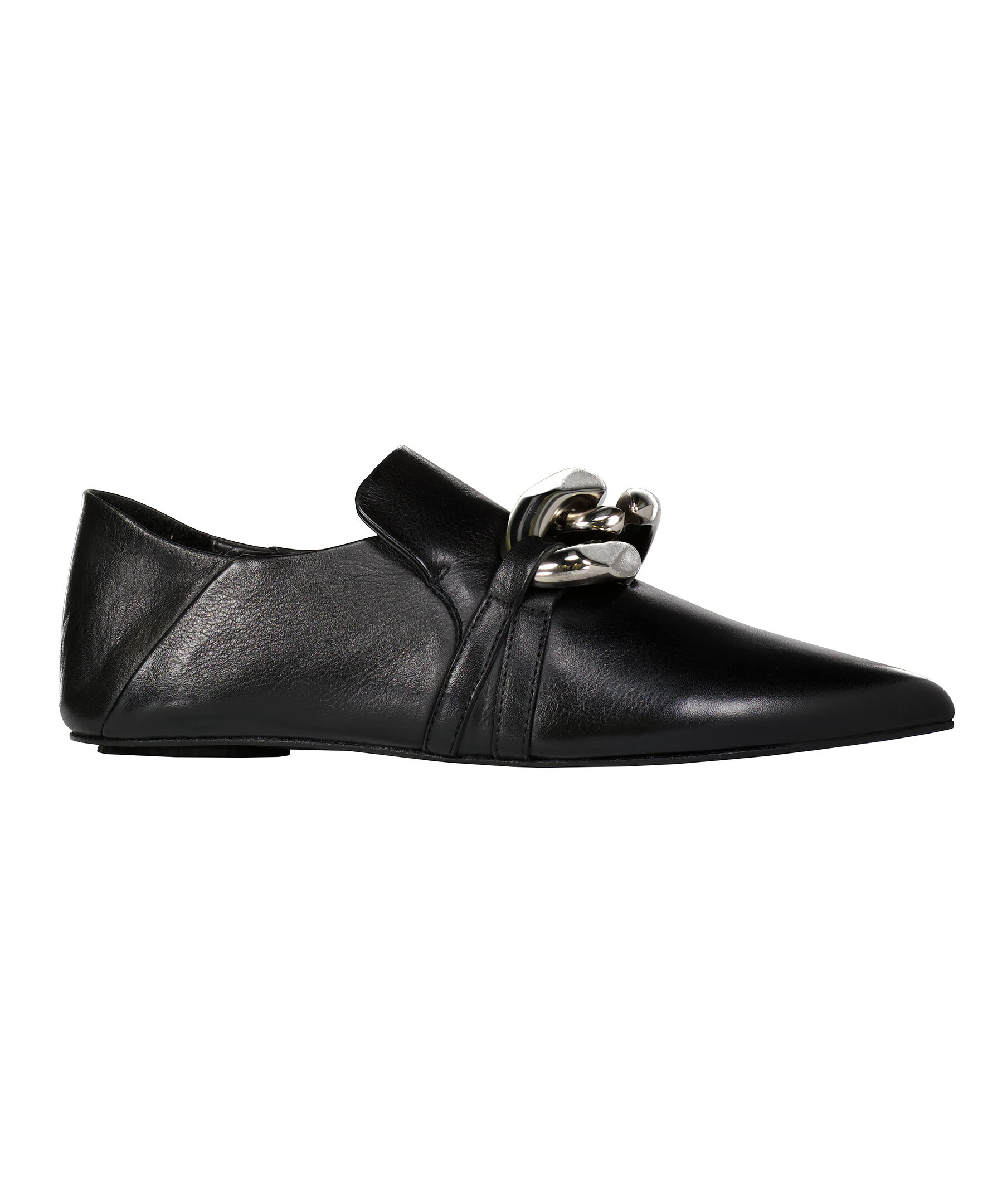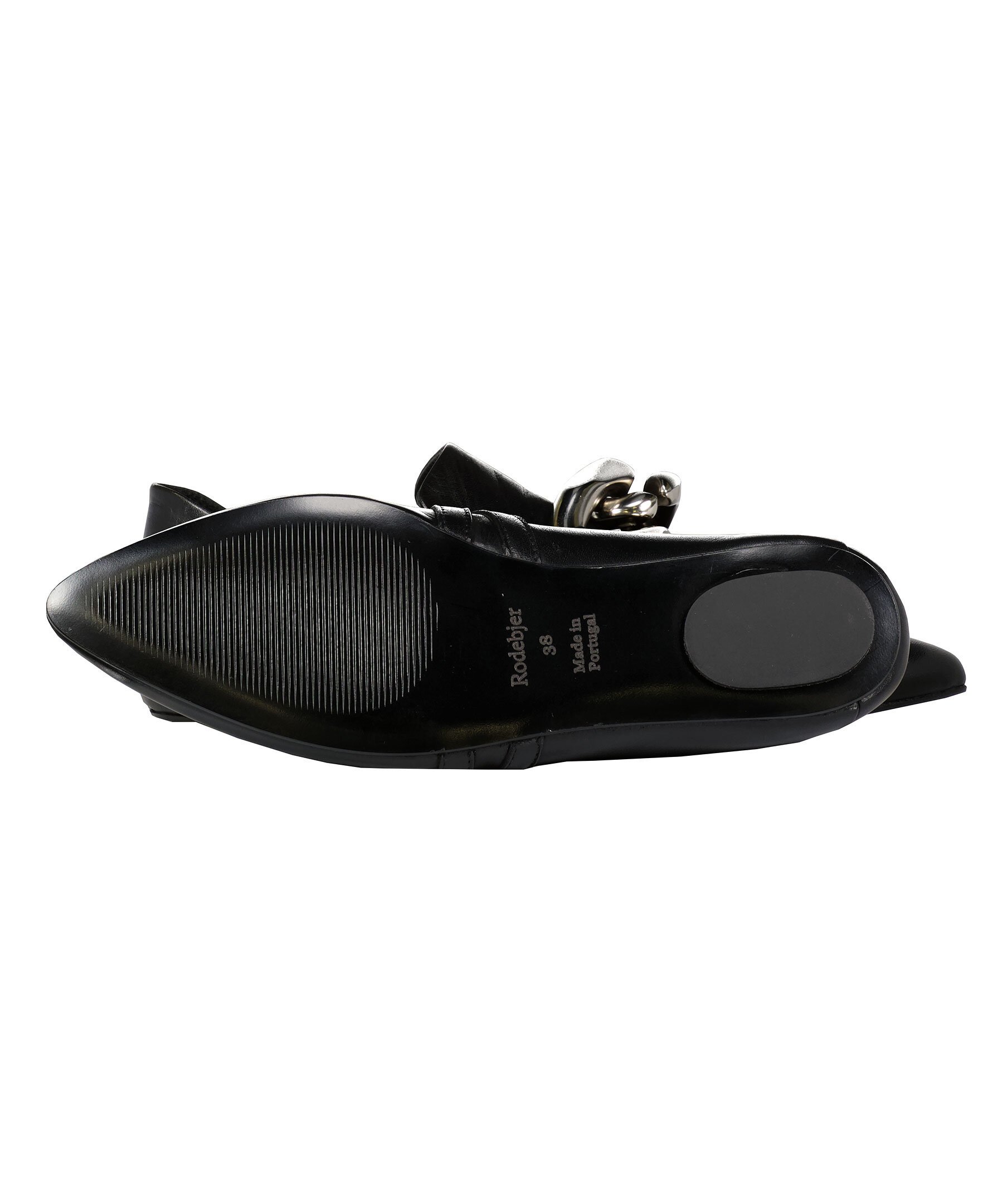 Svarta skor som kan bäras som en platt balettsko eller fälla ner hälen och bära den som en toffel. Dessa skor är designade med en lätt vadderad innerfotbädd med en platt lädersula med en präglad Rodebjer-logotyp. Dekorerad med en tjock grå-silvrig kedjedetalj fram. De är gjorda av 100% koläder.