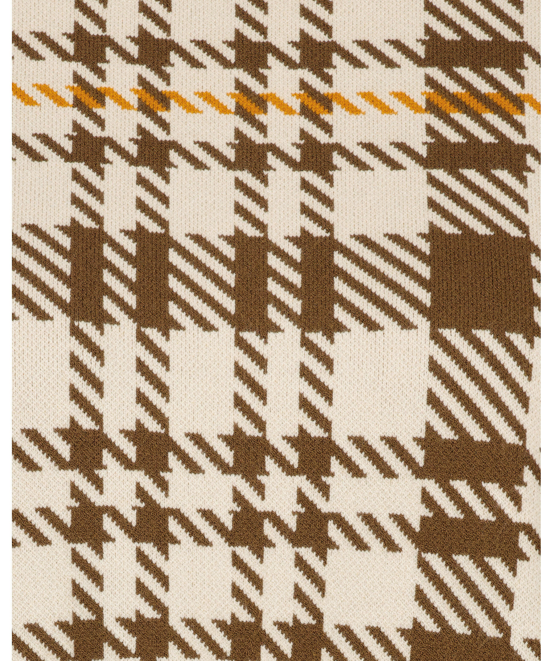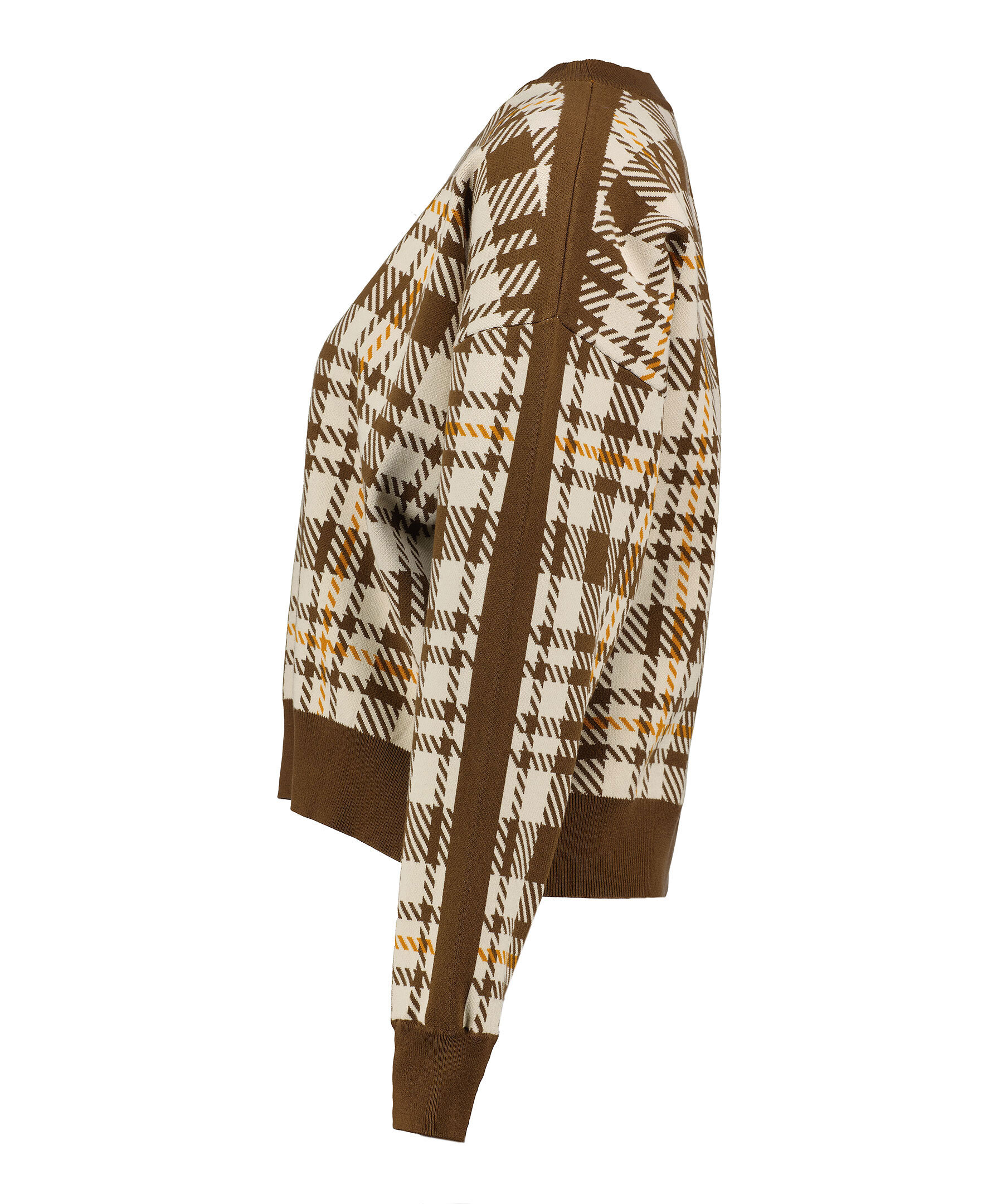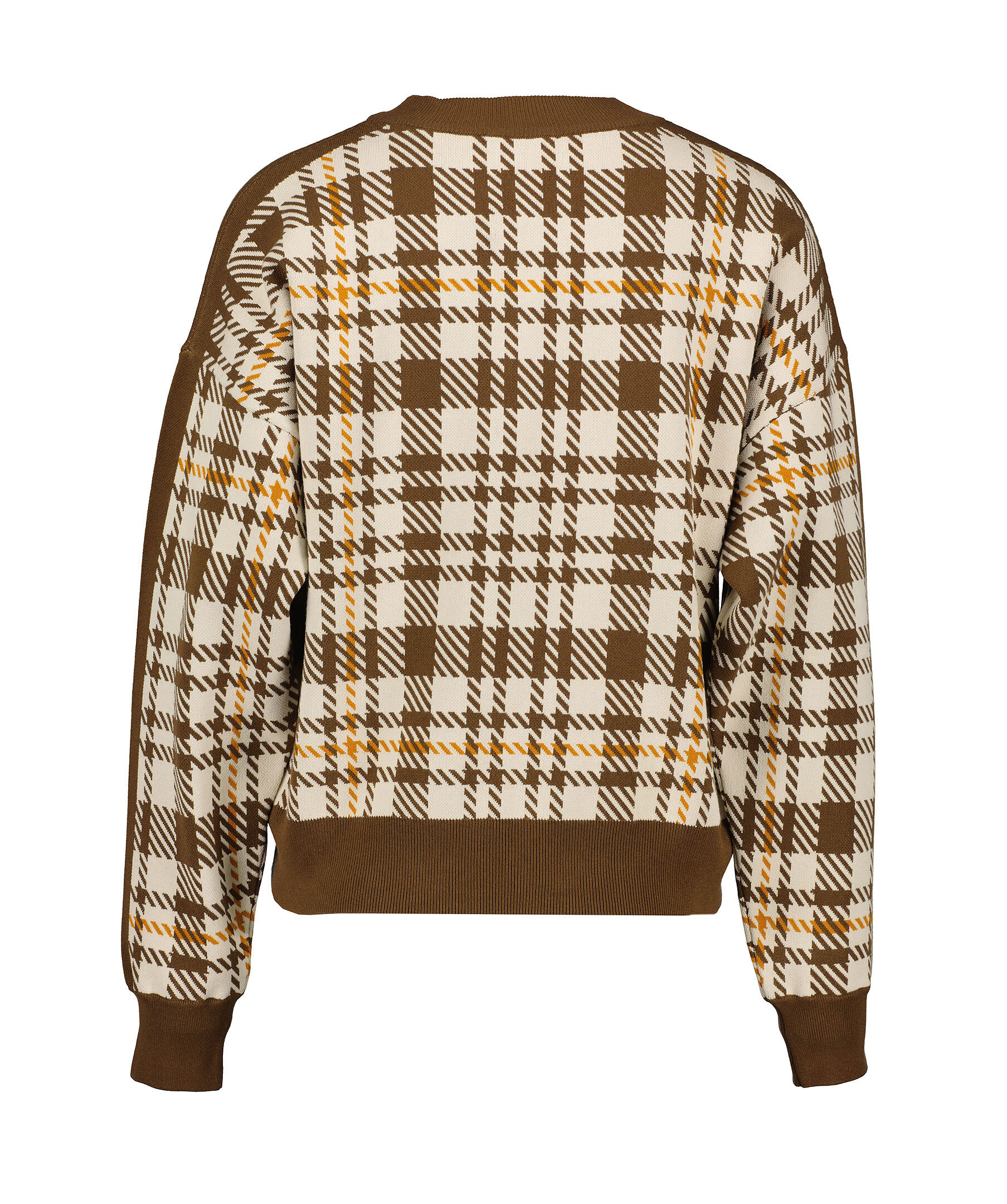 Beige tröja med brunt och orange rutmönster från Rodebjer. Tröjan har rundad, ribbstickad halsringning. Mudd vid ärm- och tröjslut.