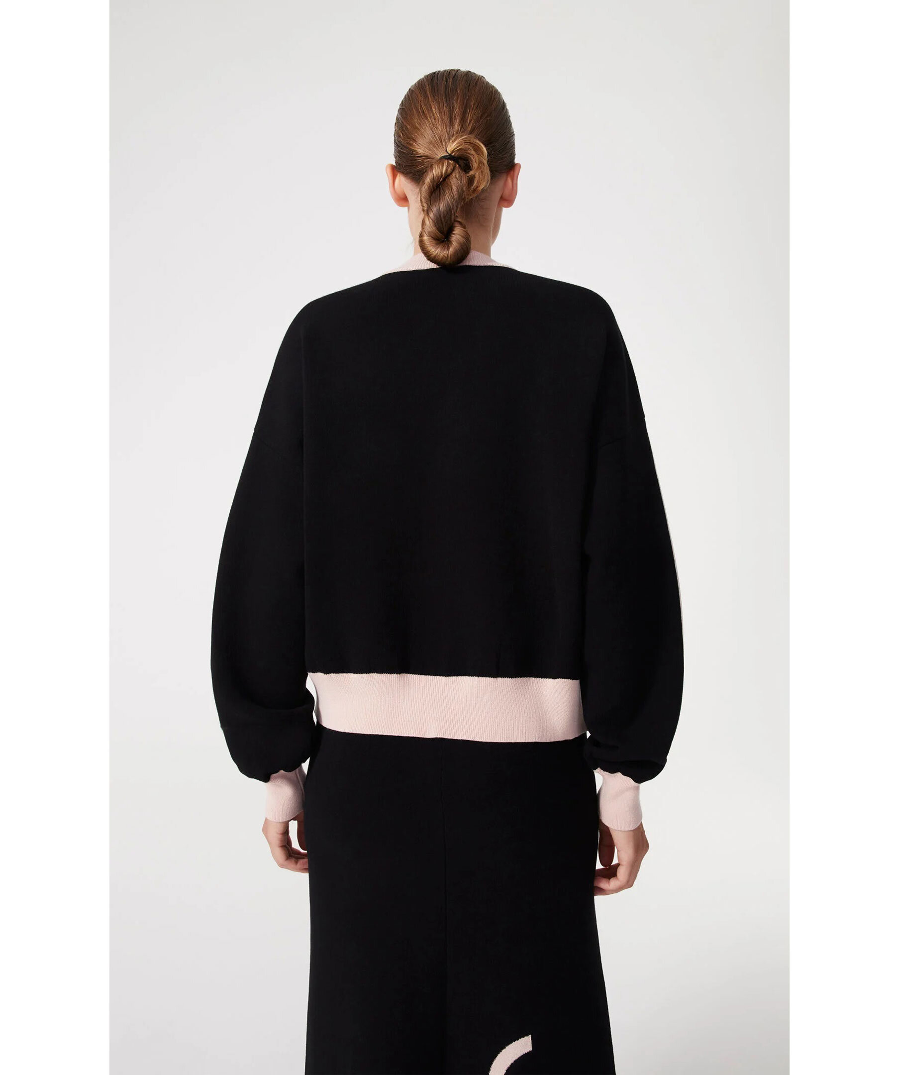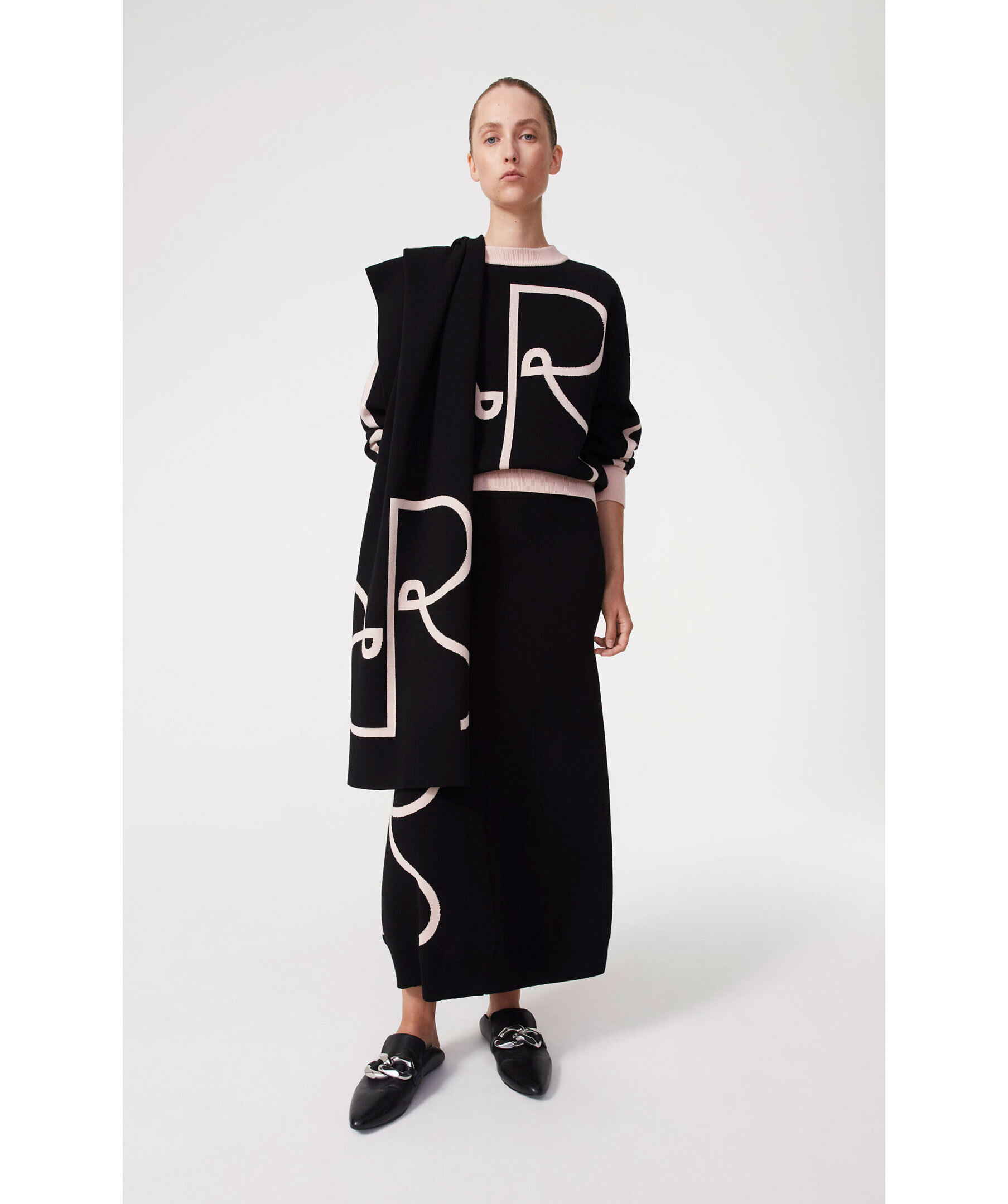 Svart, finstickad tröja med avslappnad passform från Rodebjer. Tappade axlar, långärmad och slutar i höftlängd. Kontrasterande Rodebjer Monogram framtill och kontrasterande ränder på ytterärmarna. Det är en sportig men ändå klassisk stickning med sina nedfällda axlar och ribbad mock-hals. Tillverkad av ett högkvalitativt LENZING viskosblandningsgarn, vilket innebär att viskosfibrerna säkerställs av en strikt implementerad tillverkningsprocess med låg miljöpåverkan. Blir det perfekta setet tillsammans med Orma-kjolen och Sala-scarfen! Liten i storleken, är du mellan storlekarna ta den större storleken.