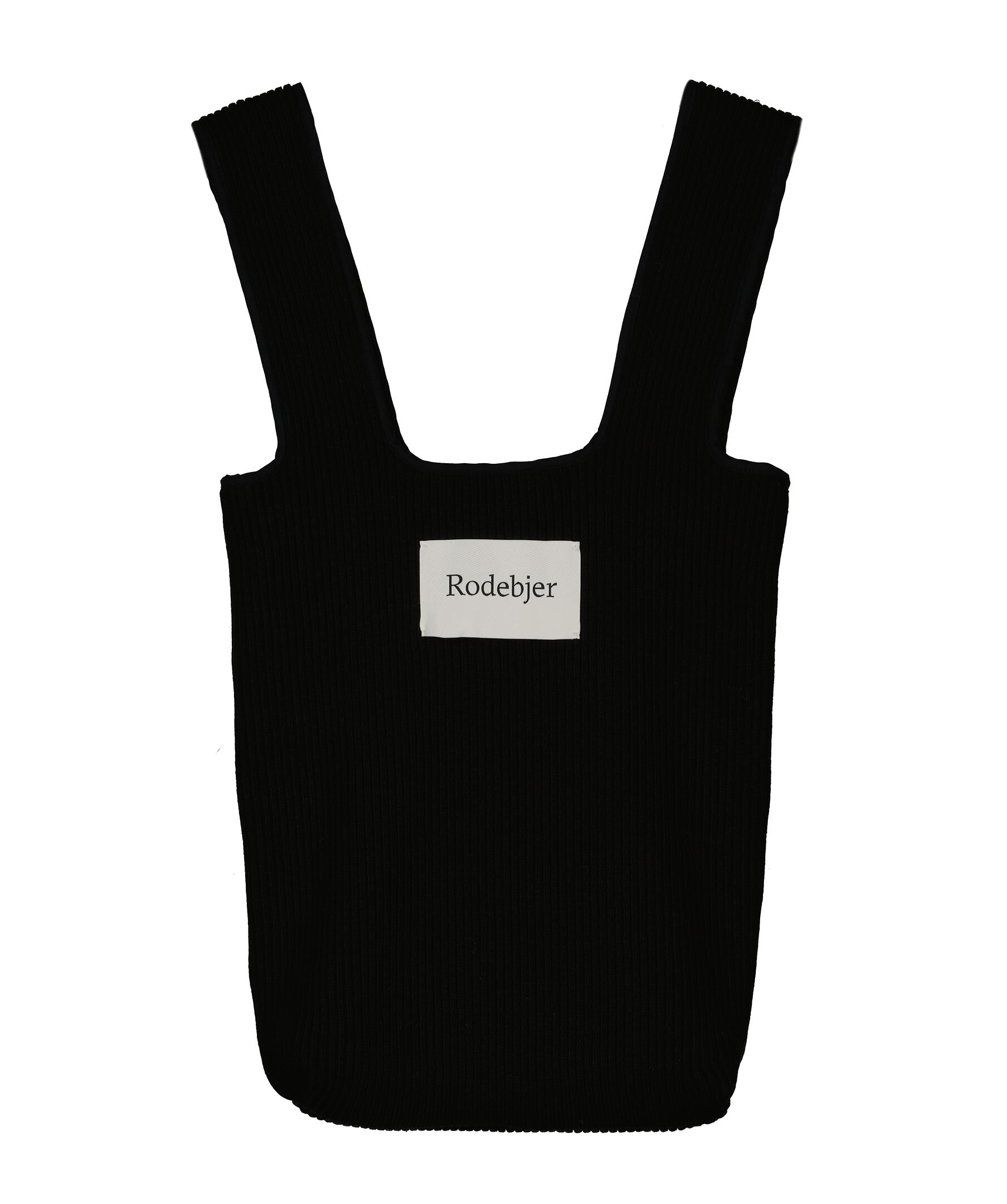Svart, ribbstickad vardagsväska från Rodebjer. Den är gjord i ett kraftigt bomulltyg från en fransk tygfabrik och är dekorerad med Rodebjer-logga på en vit patch placerad på utsidan. Väskan har två handtag och fungerar för både kontorsdagar, stadsvandringar eller middagskvällar.