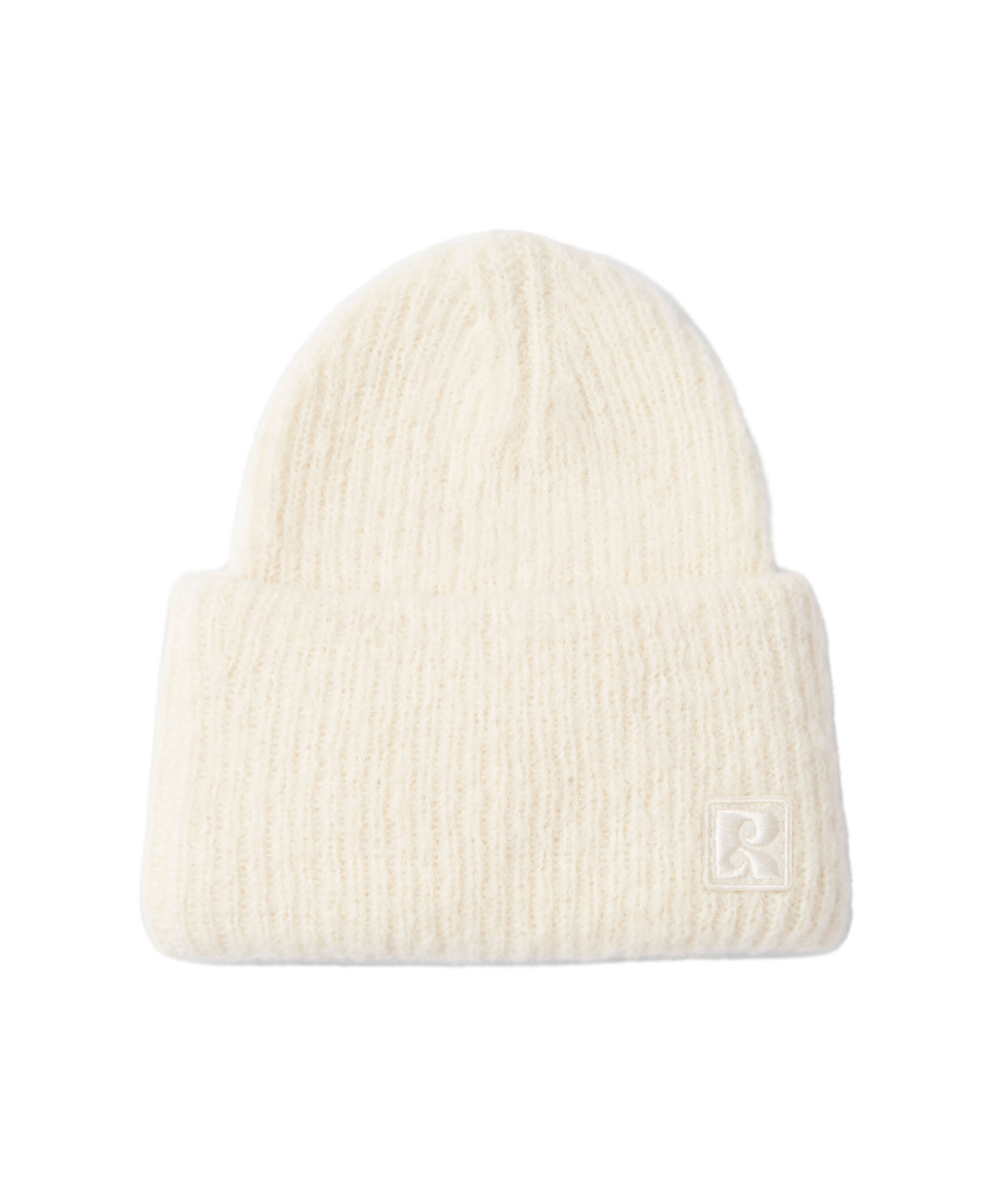 Benvit mössa från Rodebjer. Ribbstickad av en underbart mjuk alpackablandning. Rodebjers nya märkesplåster är applicerad på det vikta brättet.