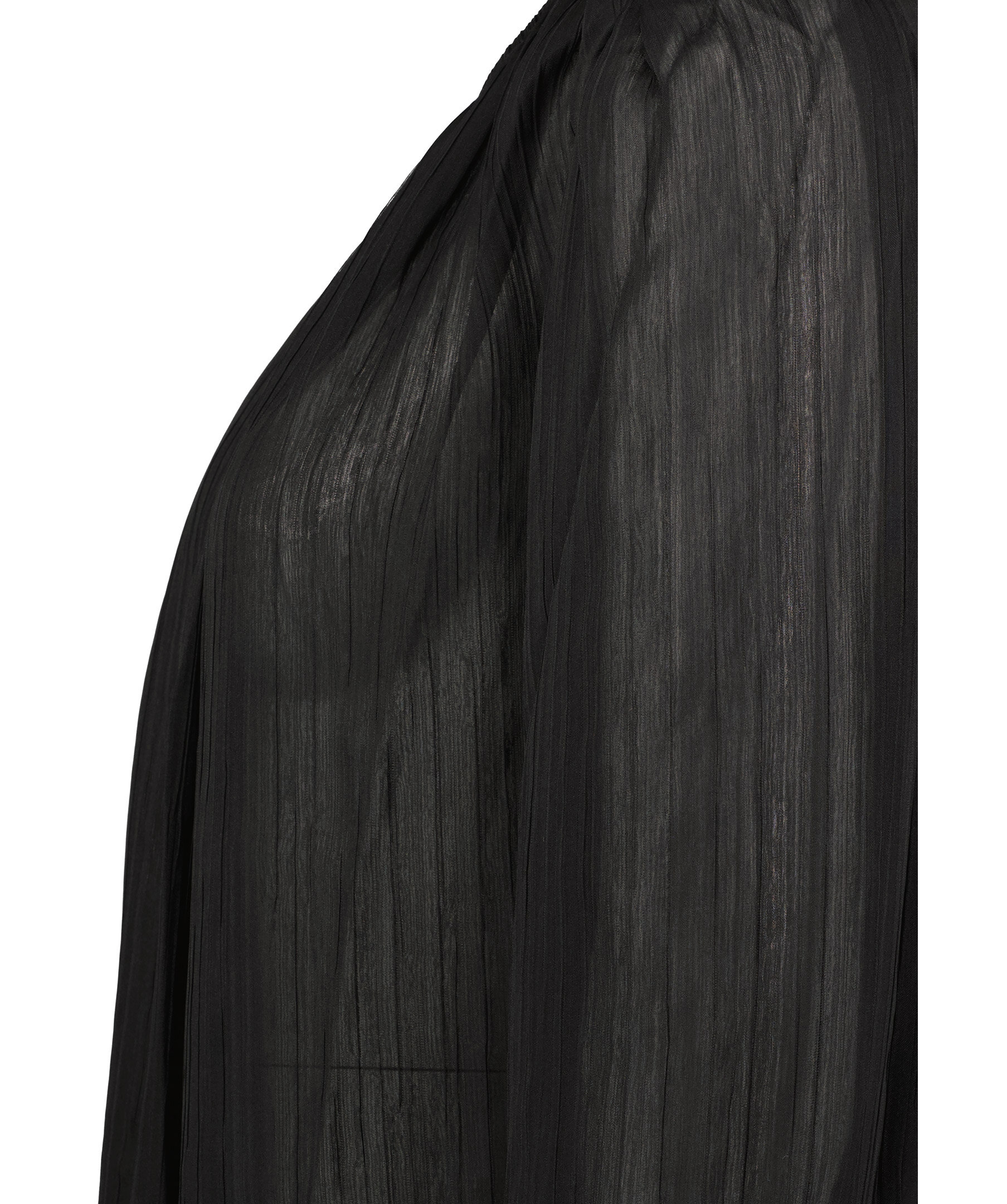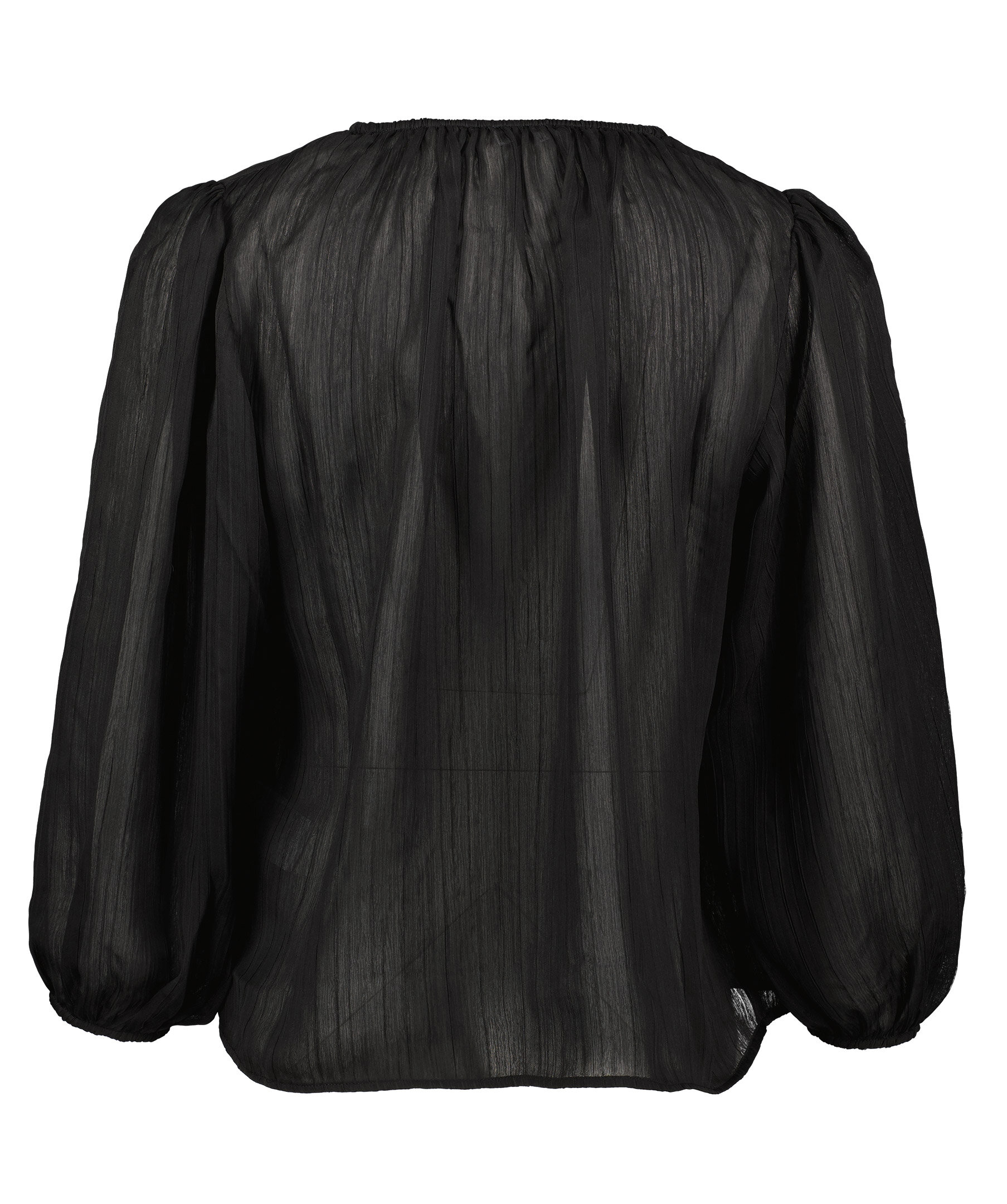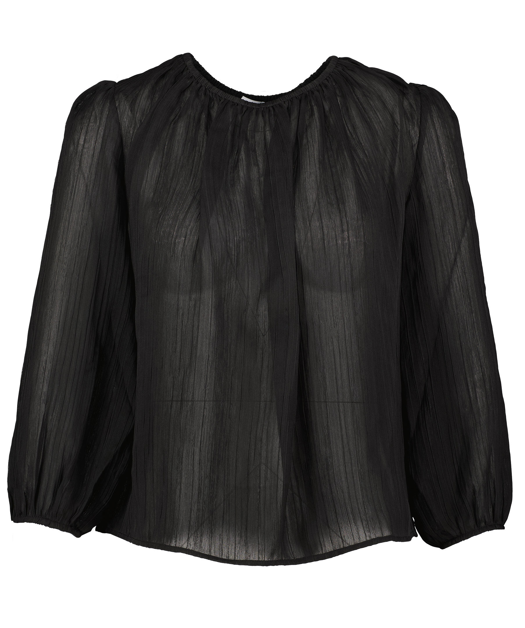 Svart plisserad blus från Rodebjer. Halvtransparent tyg. Diskreta ballongärmar. Elastisk resår i halsringningen. Tillverkad i 100% Återvunnen polyester.