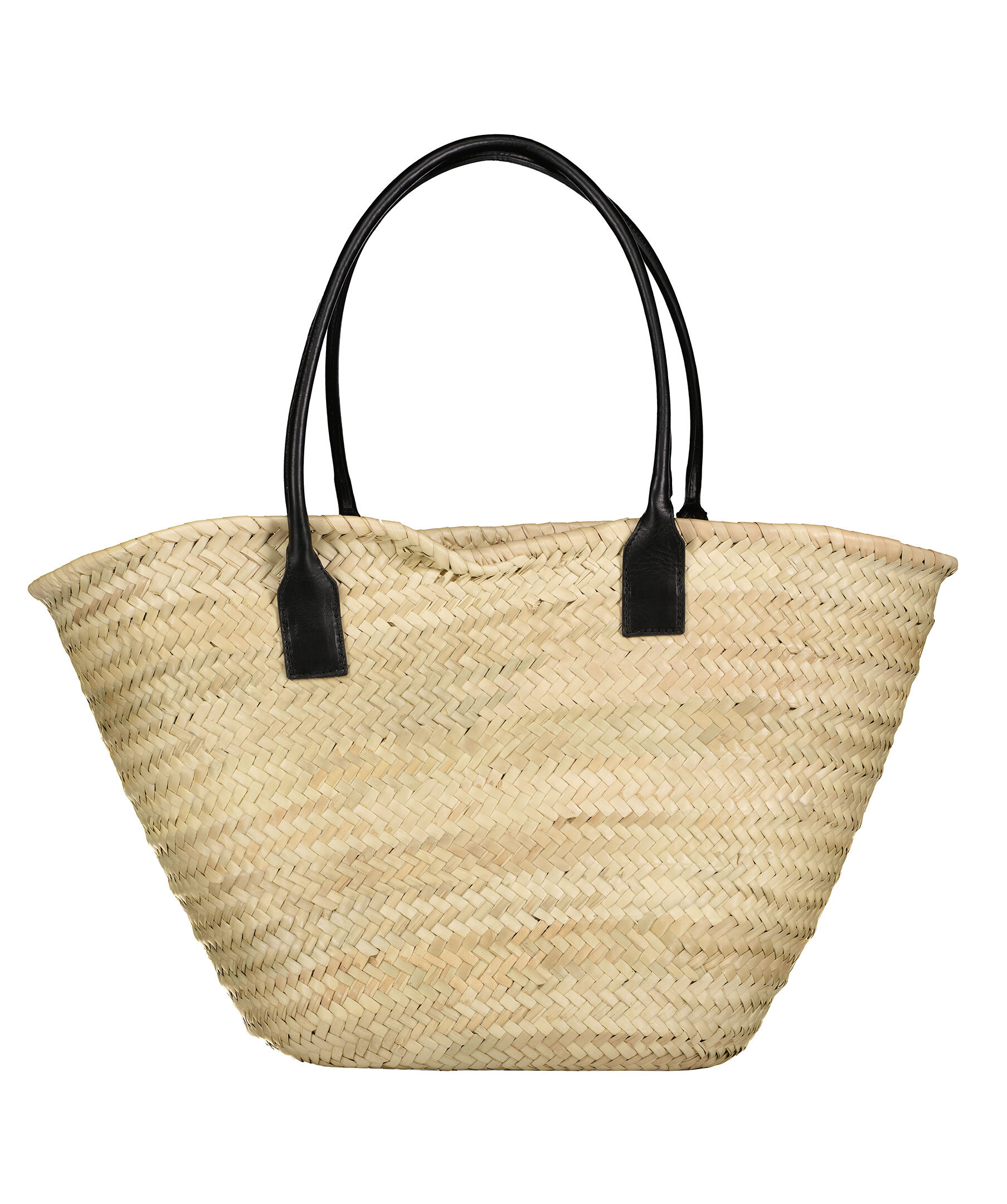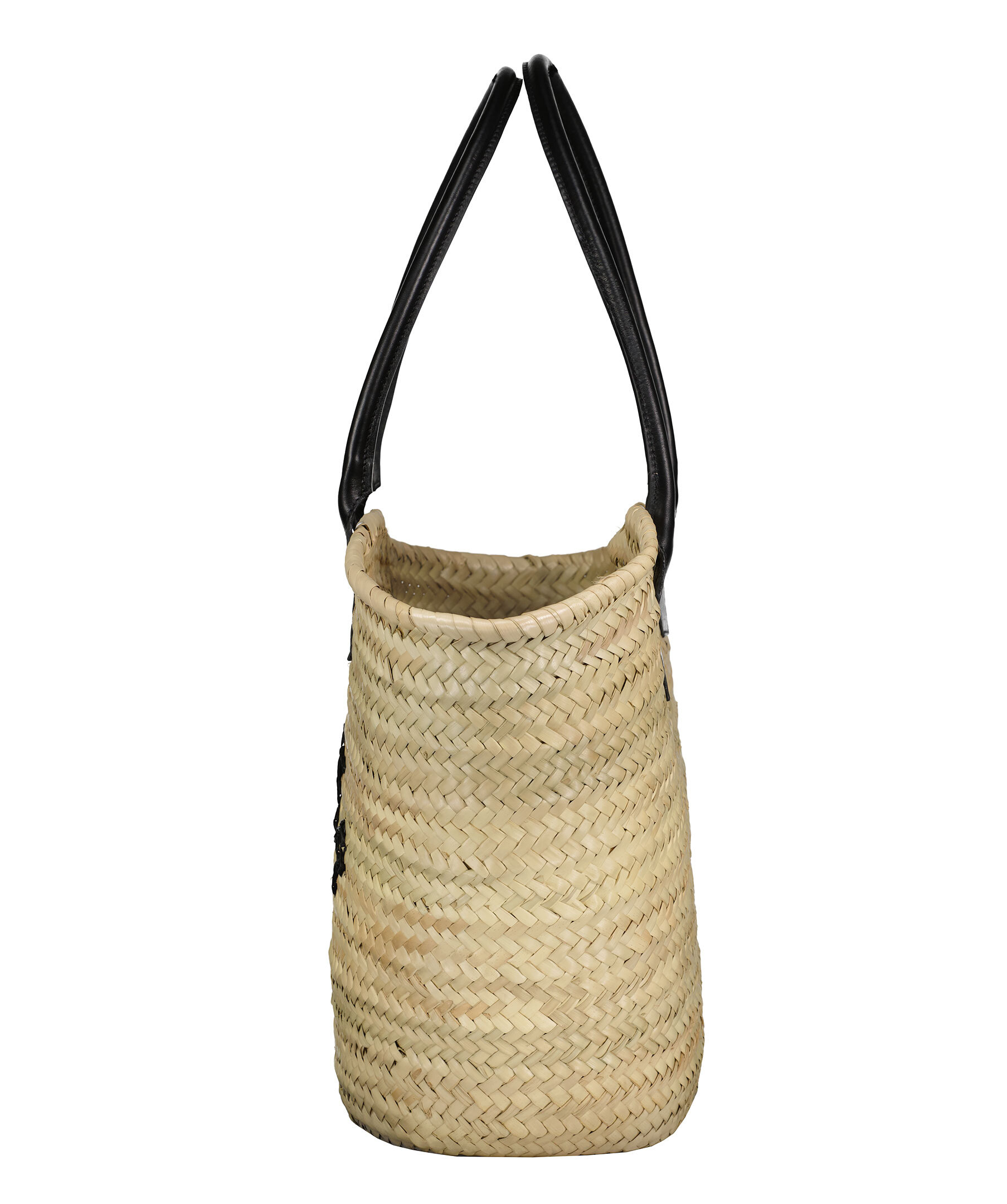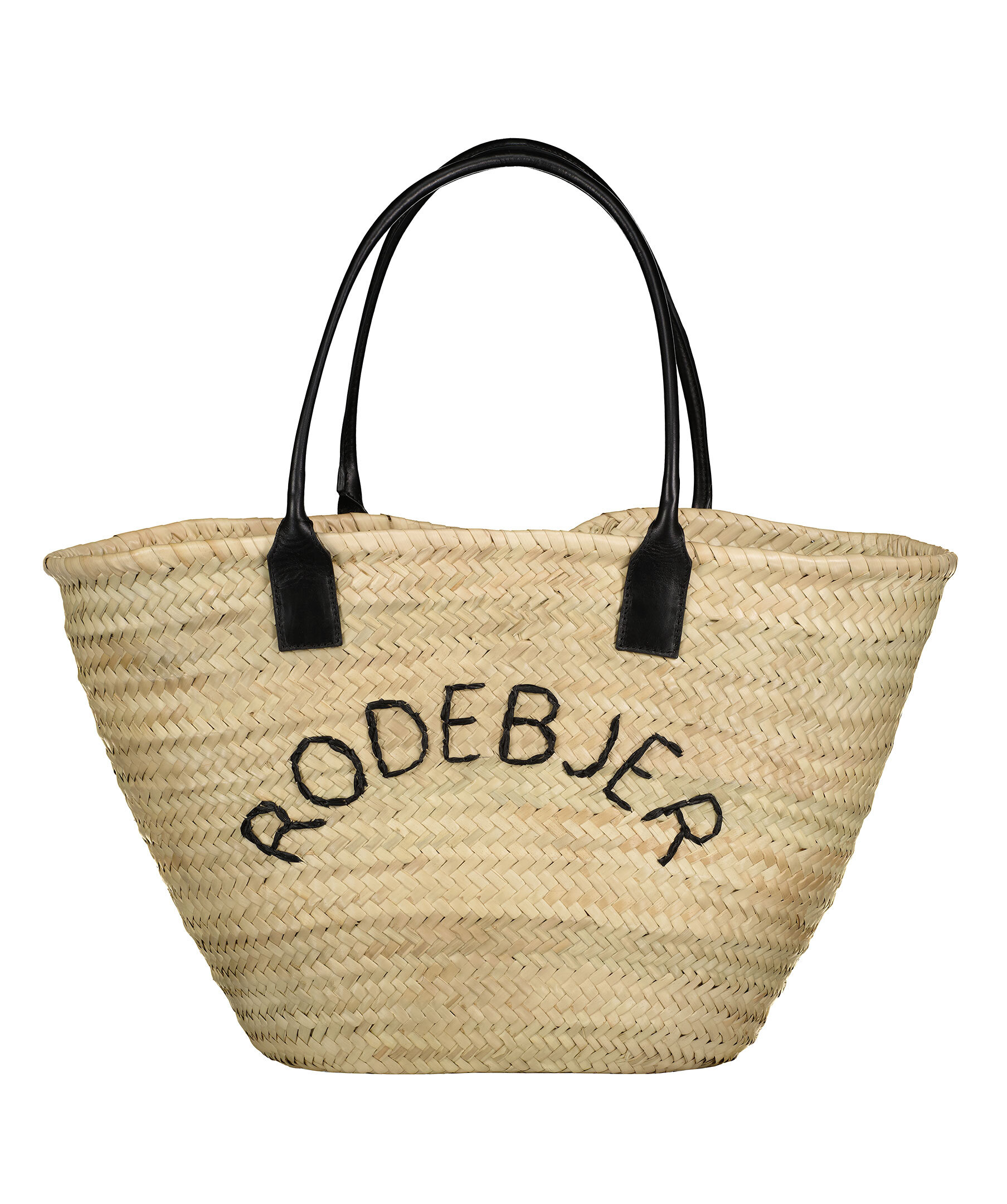 Tote bag i strå material från Rodebjer. Läderhandtag i svart, handtagets höjd är 16cm. Broderad logotyp på väskans framsida. Väskans mått: B 50cm H 33cm D 15cm.