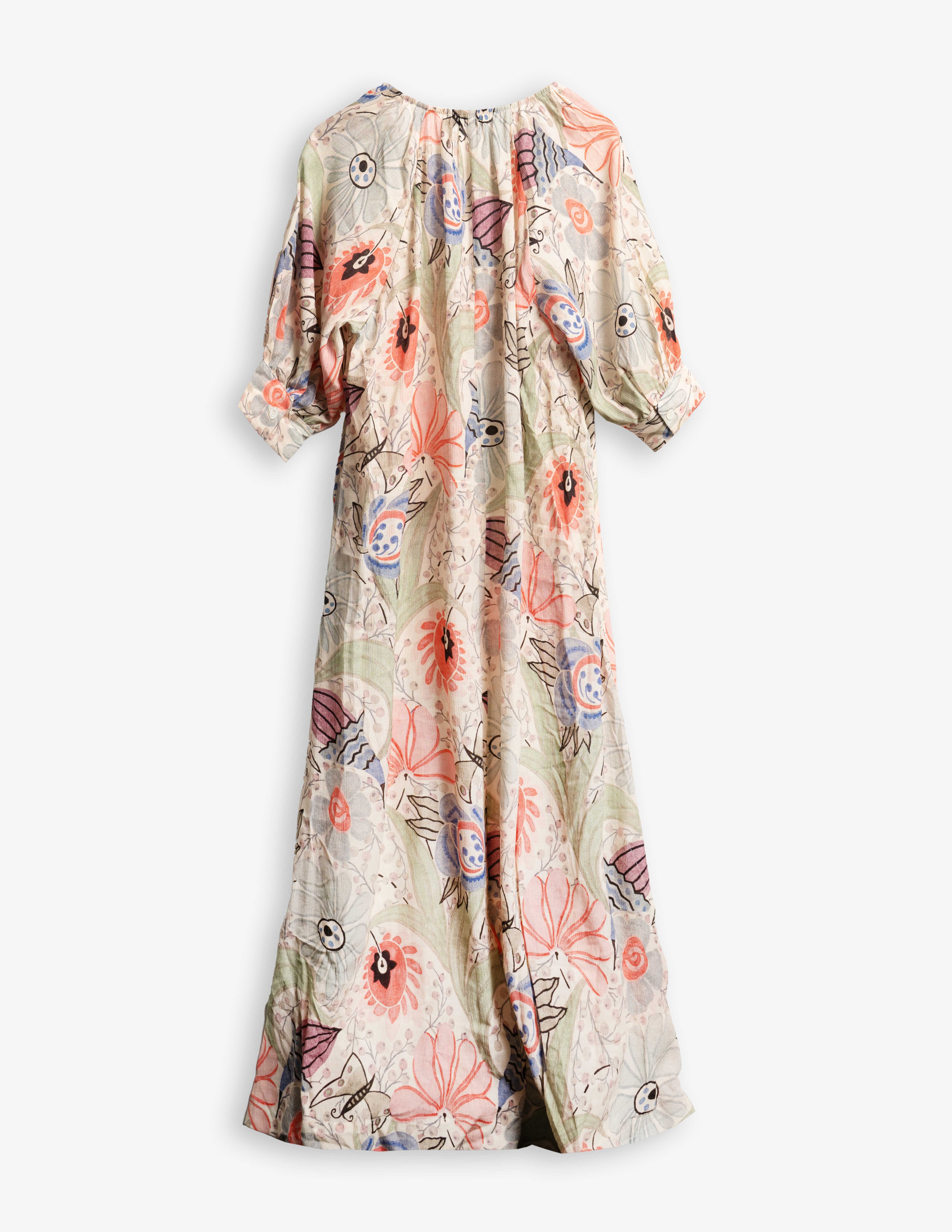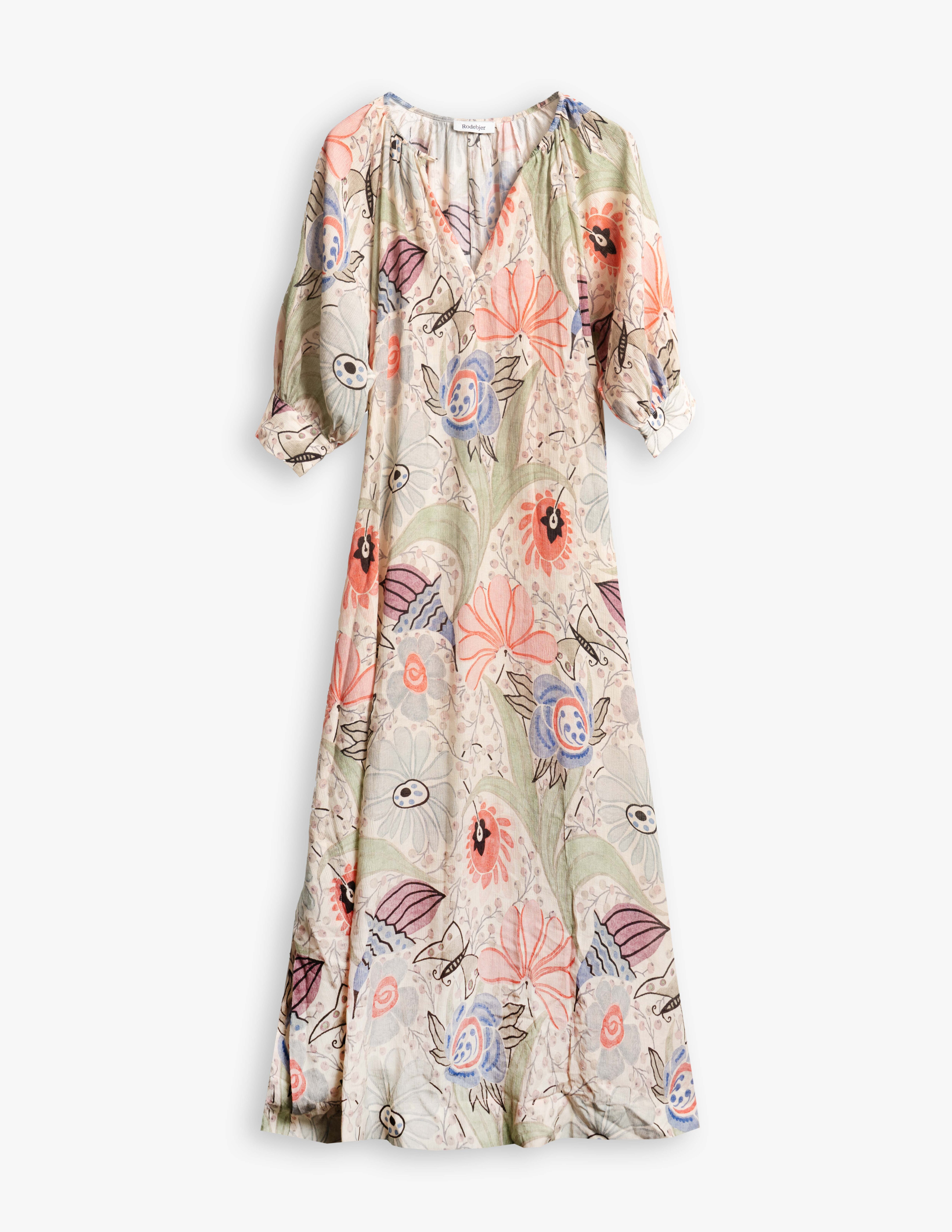 Mönstrad klänning från Rodebjer. Klänningen är ankellång med Rund hals med en knappslutning framtill. En mångsidig klänning som fungerar lika bra till vardag som till fest.