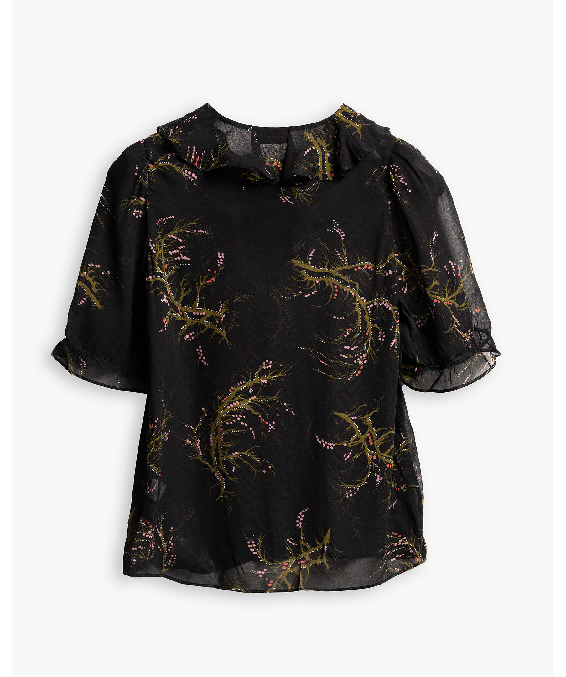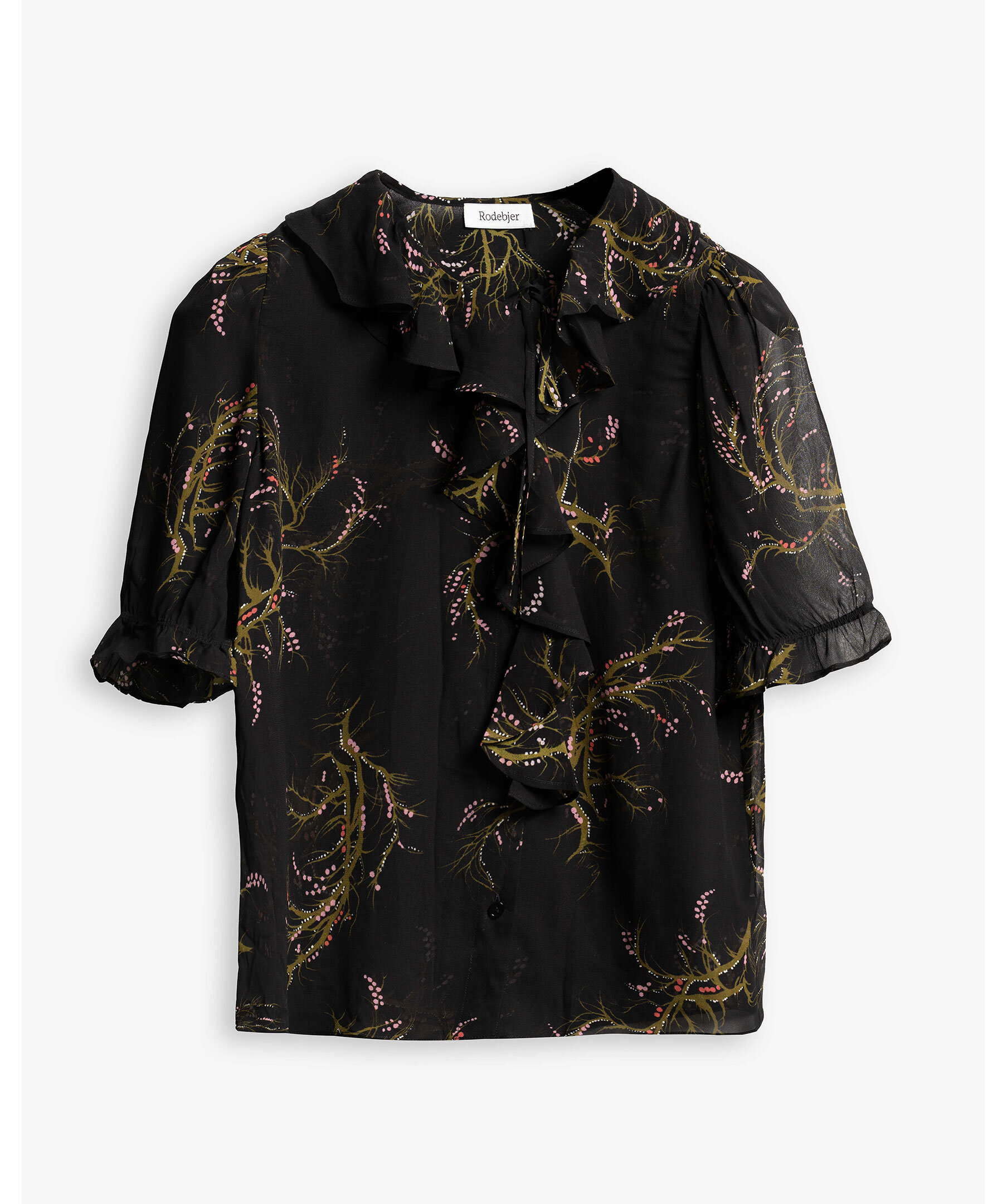 Svart transparent blus från Rodebjer med mönster. Blusen har en kort puffärm, och knäppning framtill med volang.