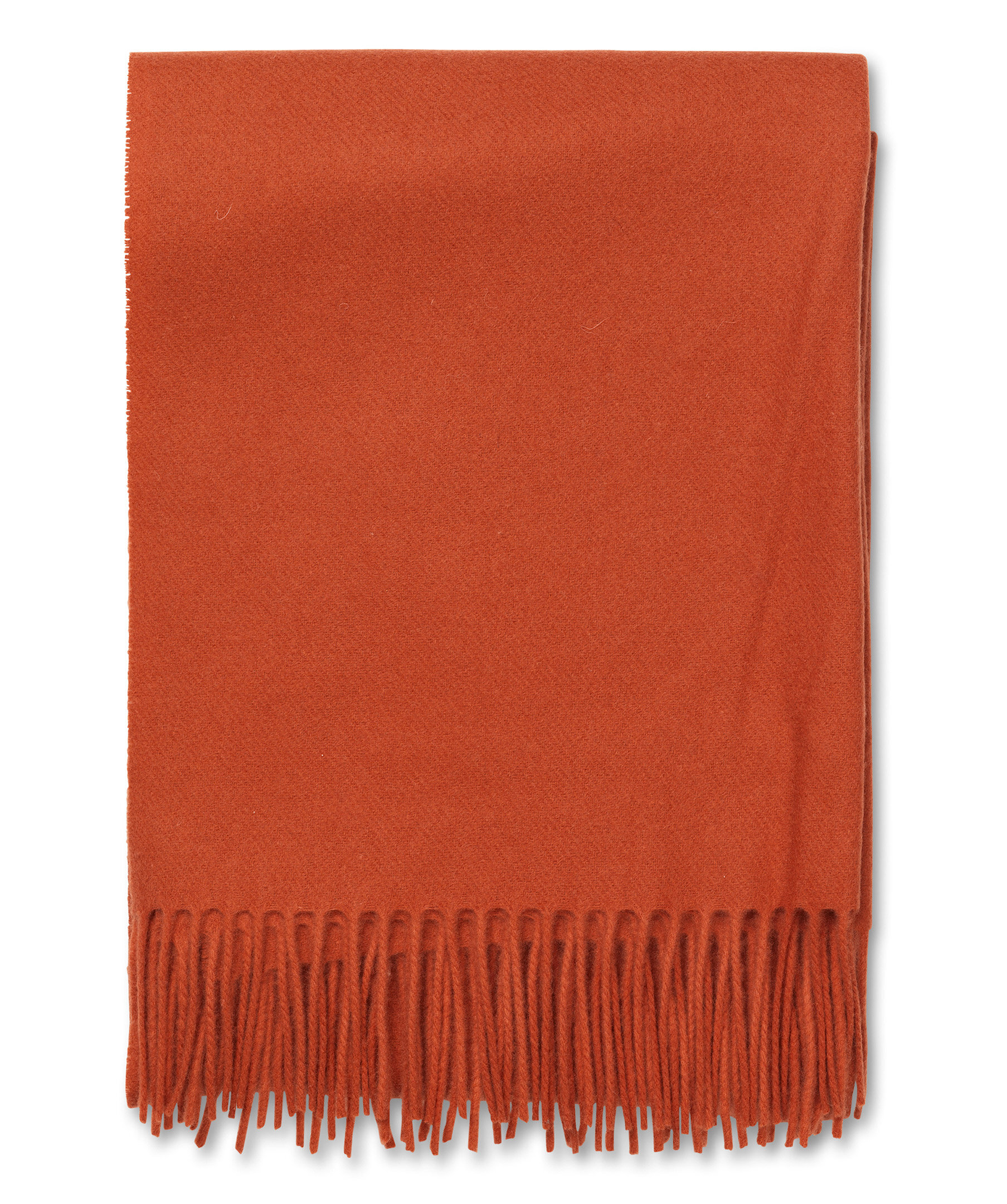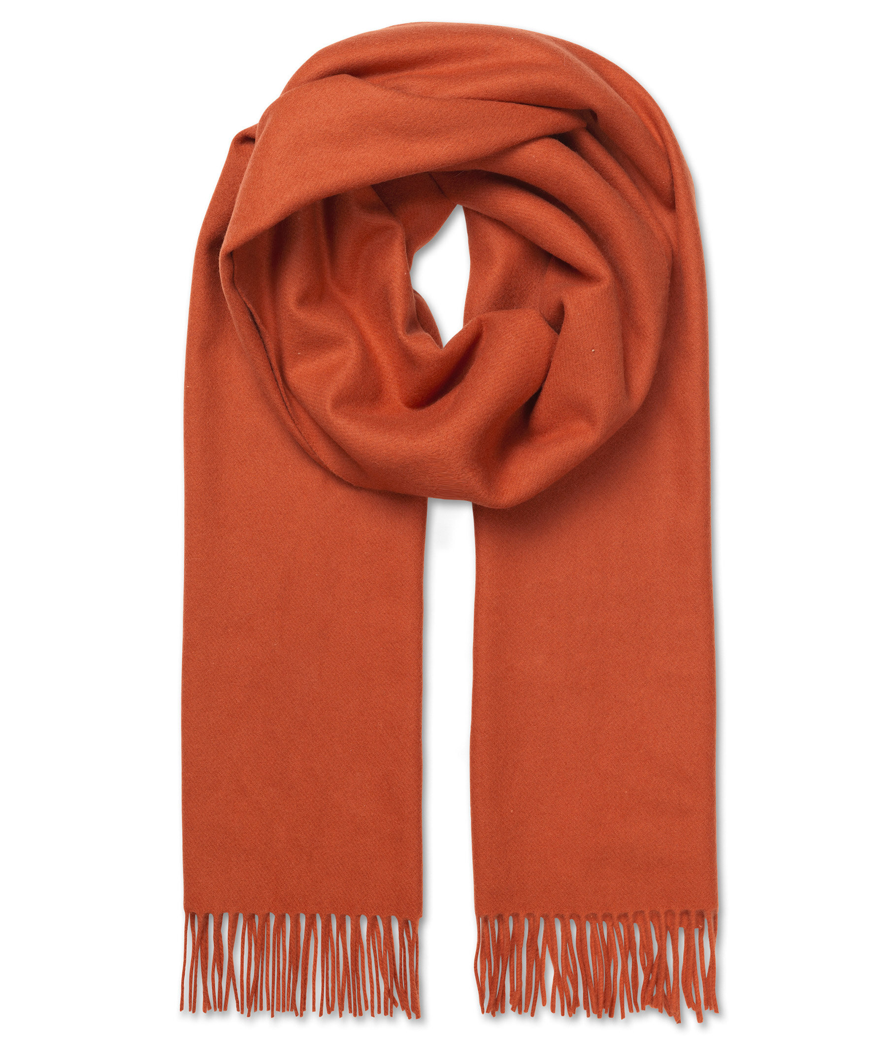 Orange halsduk från Samsoe Samsoe. Fransar i kansterna, tillverkad i en blandning av ull och kashmir. Halsduken är 204 cm lång och 55 cm bred.