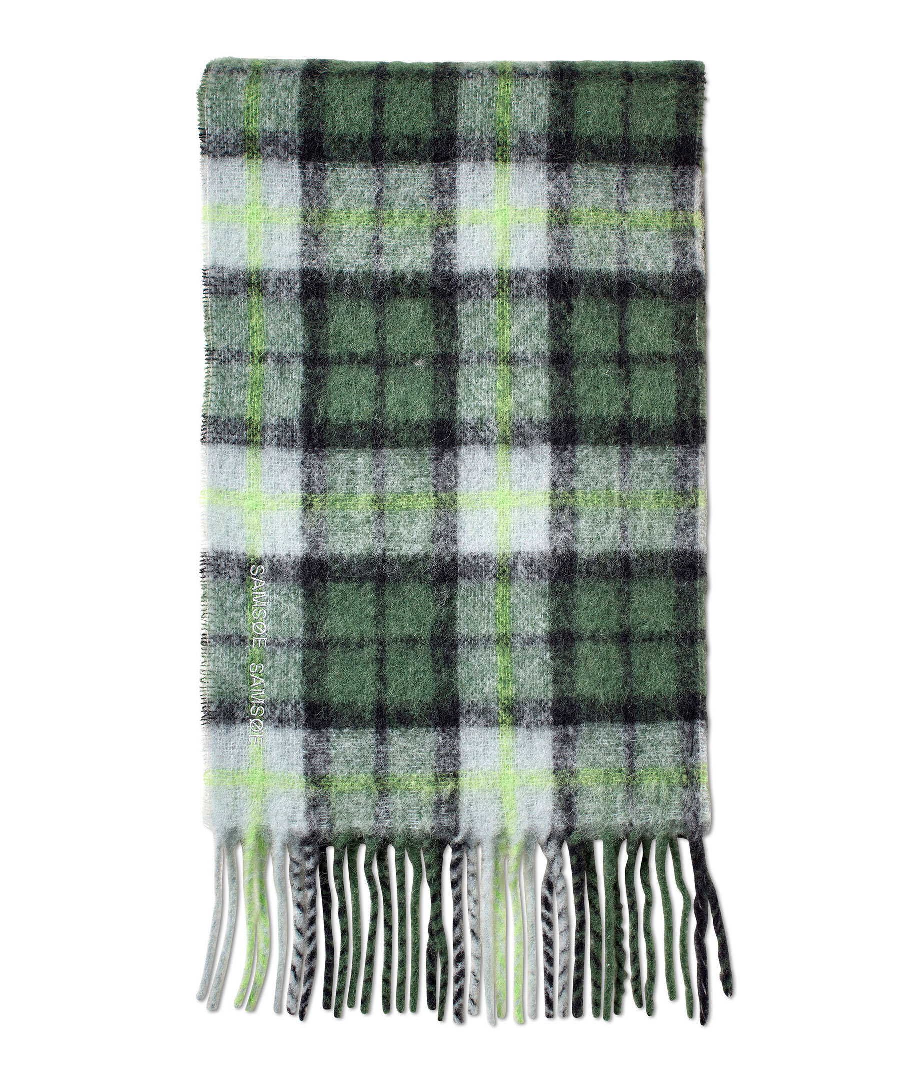 Mönstrad halsduk i gröna och svarta toner från Samsøe Samsøe. Halsduken är avslutad med fransar med en stor logotyp på sidan.