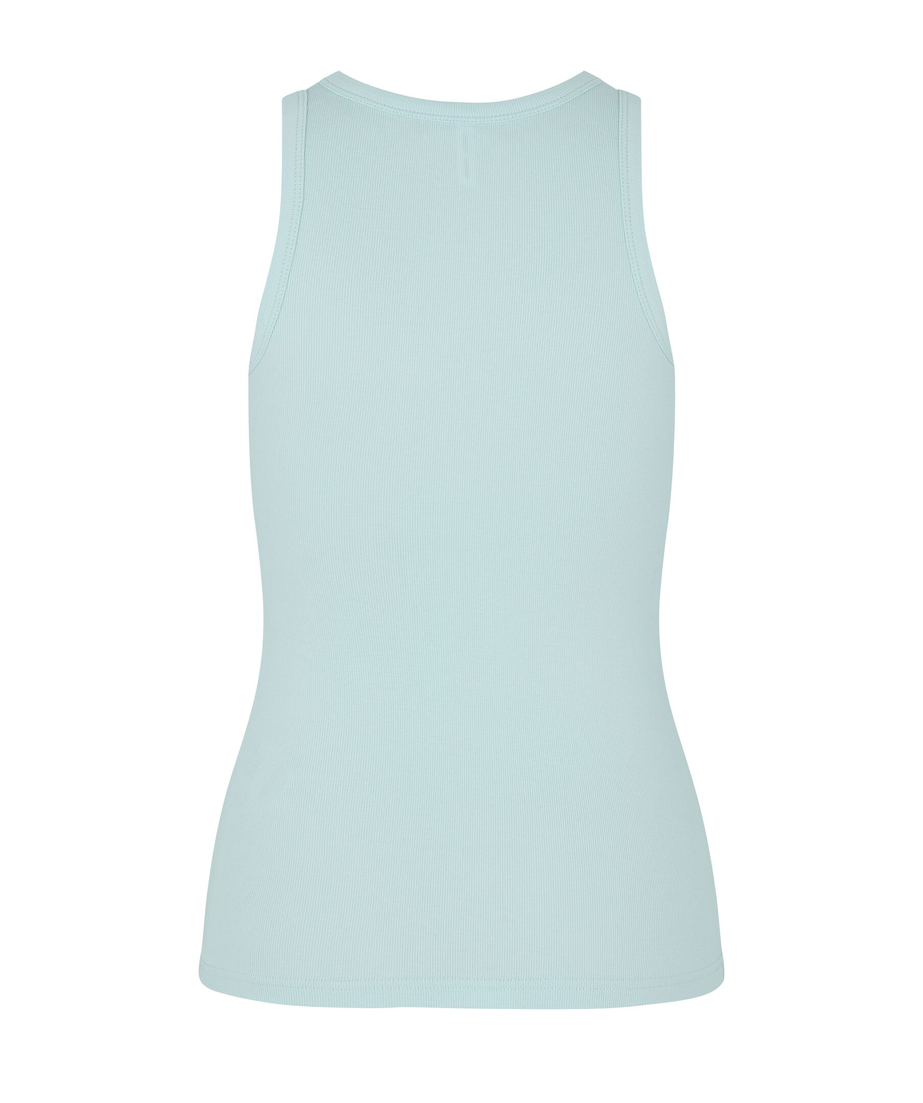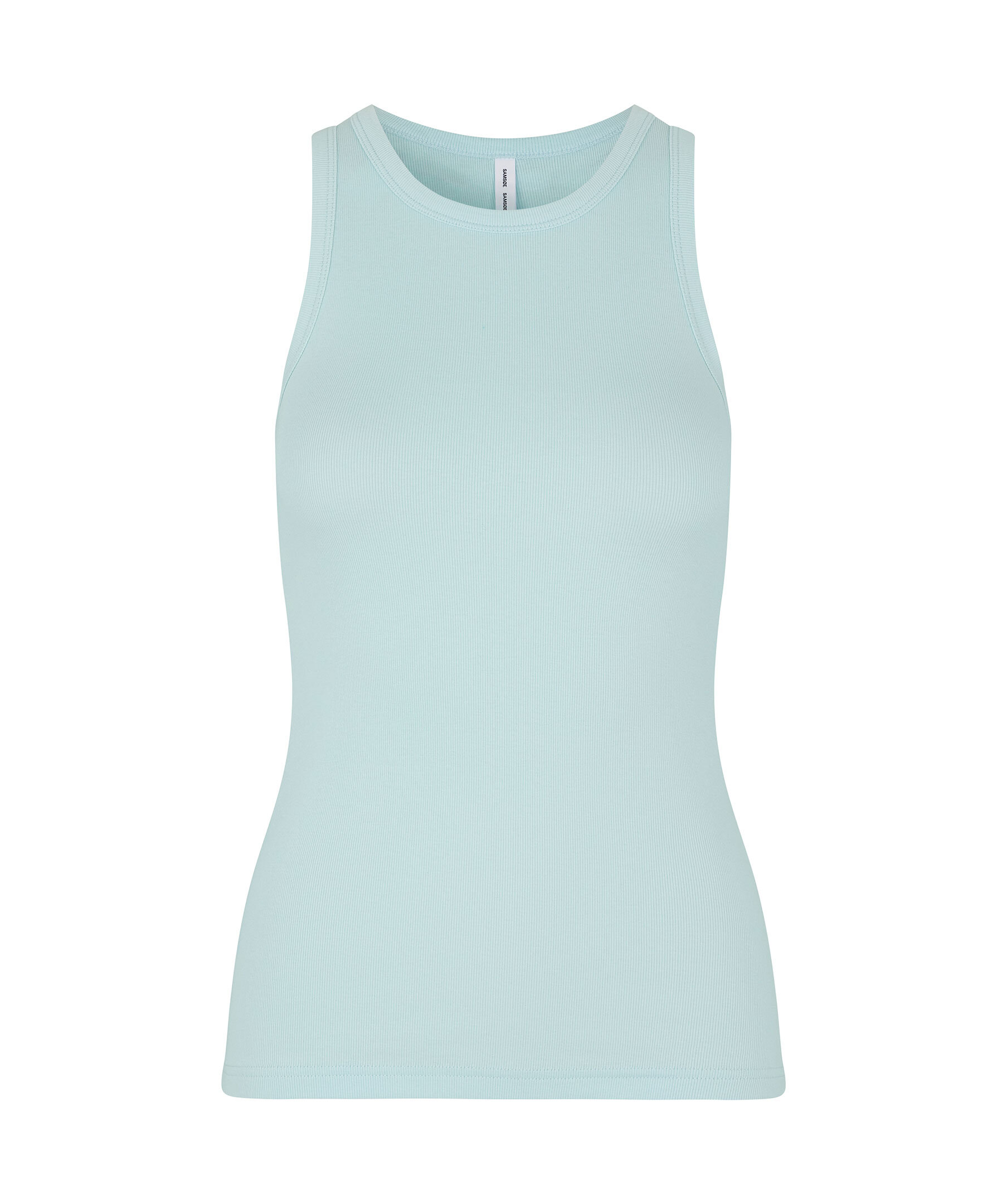 Ljusblått, ribbat linne med smal passform från Samsoe Samsoe. Hög rundad halsringning, bundna kanter och fin ribbad jersey av ekologisk bomull med extra stretch. Längd mitt bak på storlek small är 56 cm.