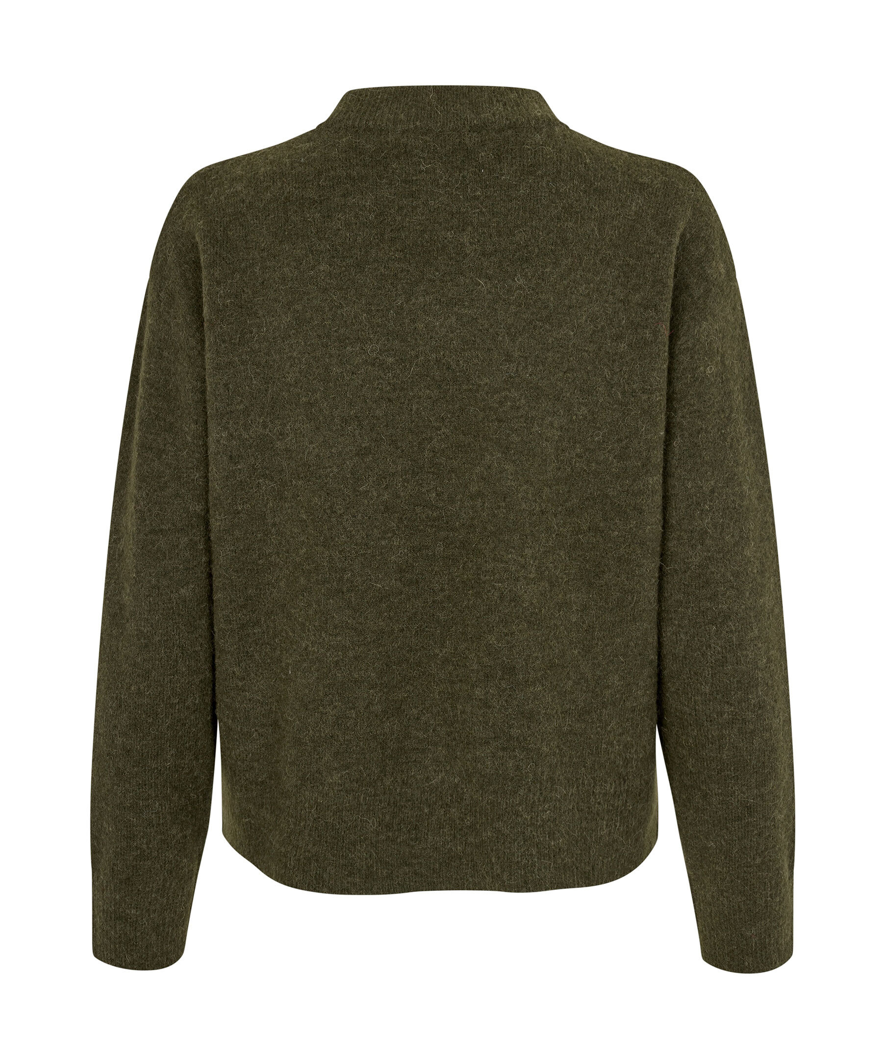 Mörkgrön tröja med normal passform och nedhasade axlar från Samsoe Samsoe. Ribbstickad rund halsringning, ärmslut och nederkant. Huvudmaterialet består av en elastisk blandning med ull och alpackaull. Denna produkt är RWS-certifierad, vilket garanterar att djurvälfärd och krav på markförvaltning uppfylls från gård till färdig produkt.