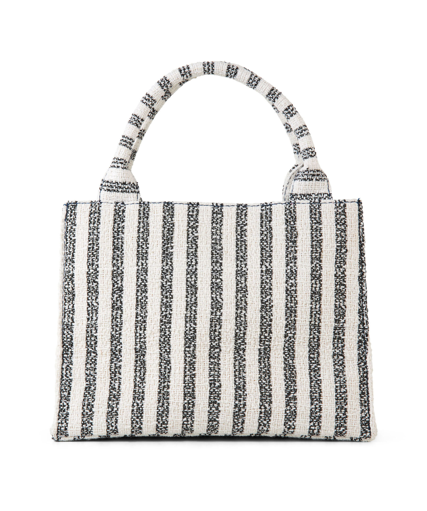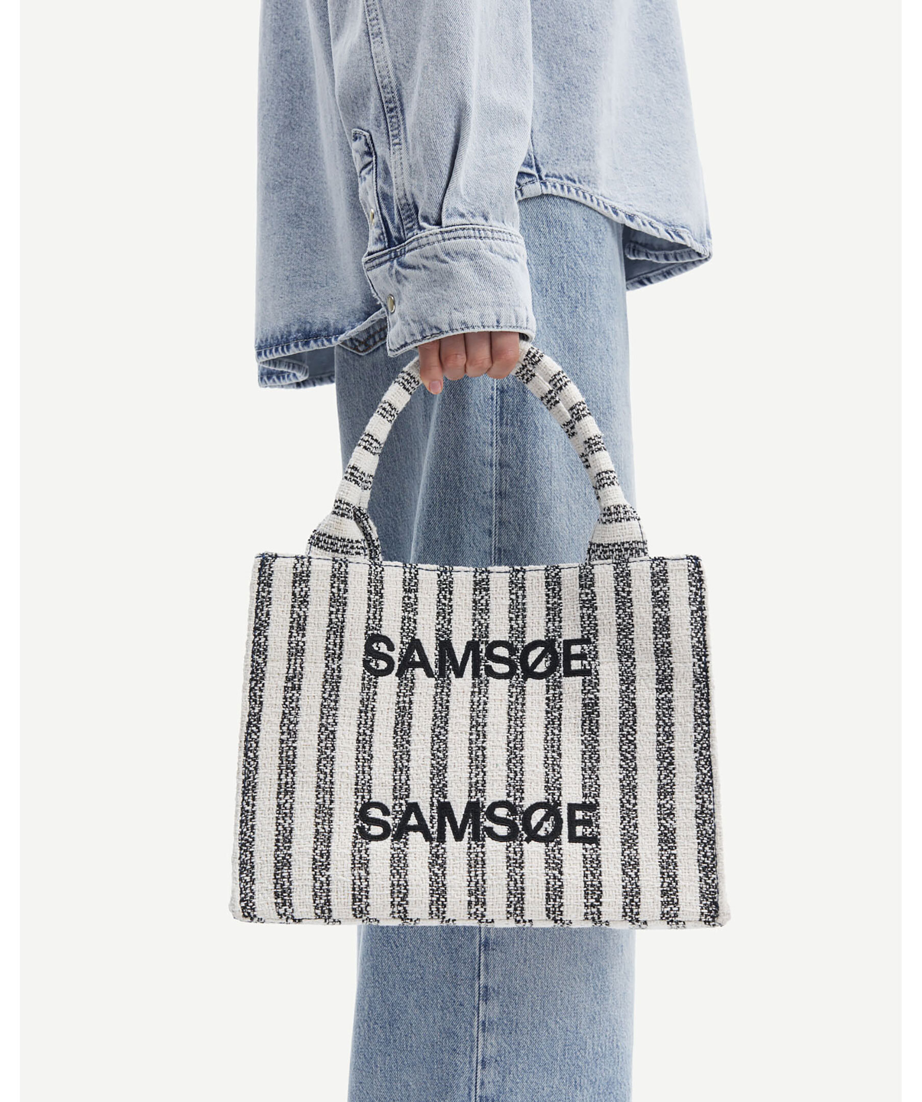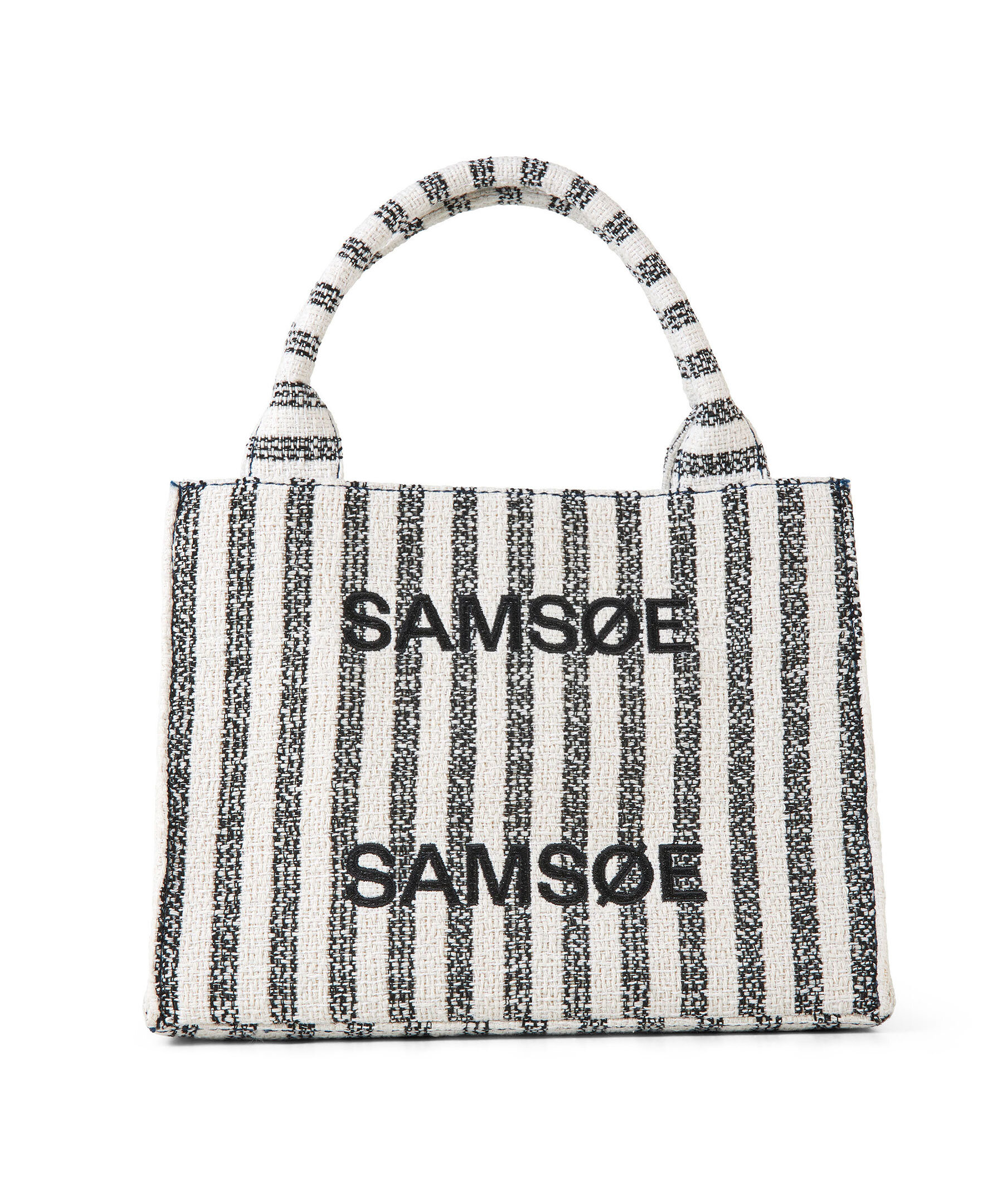 Randig tygväska med Samsøe Samsøe tryckt varumärke på framsidan. Bärhandtag, magnetisk stängning, inner- och ytterfickor, fodrade. Tweedstrukturerad bomull och polyesterblandning med en vävd rand. Mått: B 30cm H 23.5cm D 16cm.