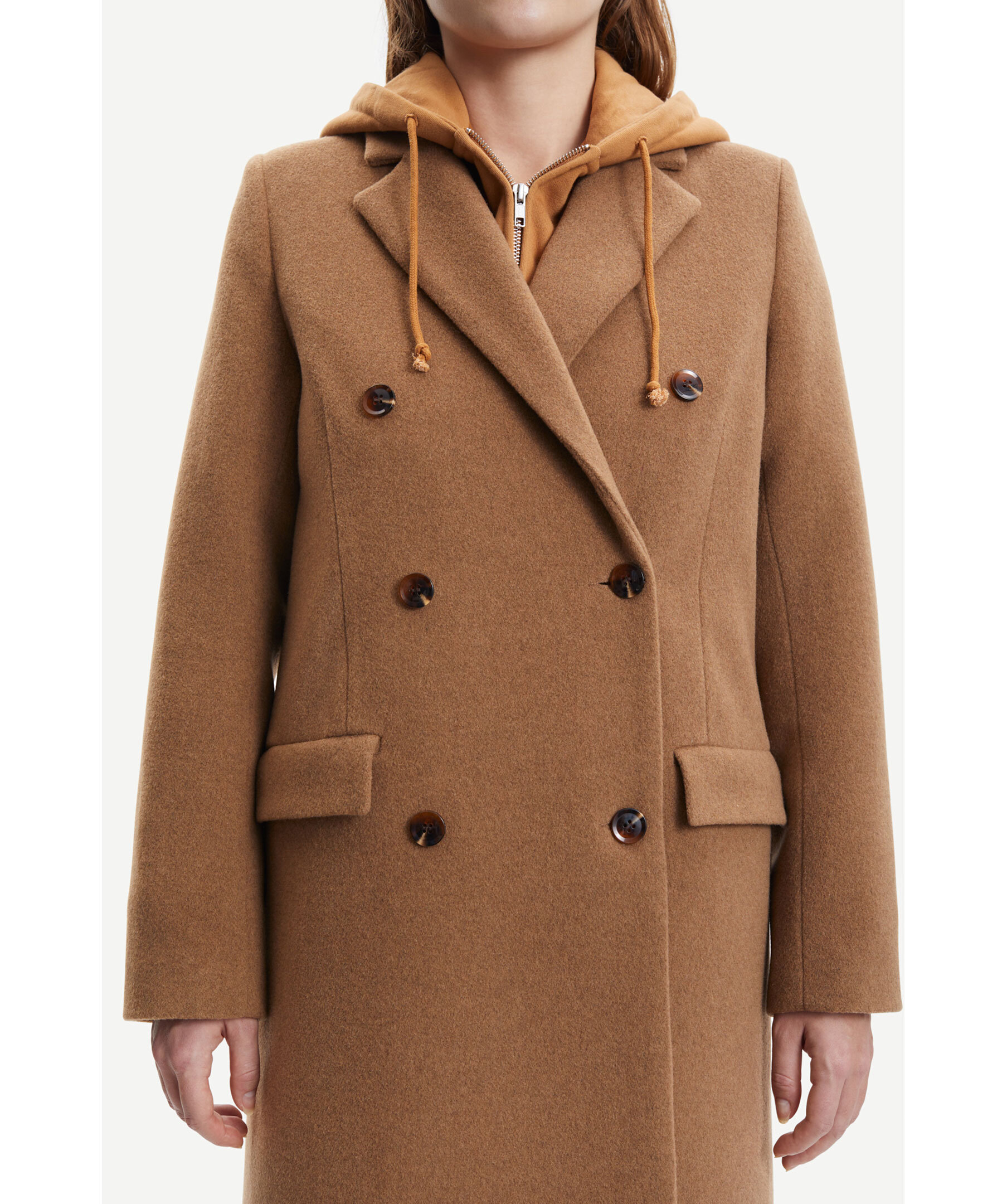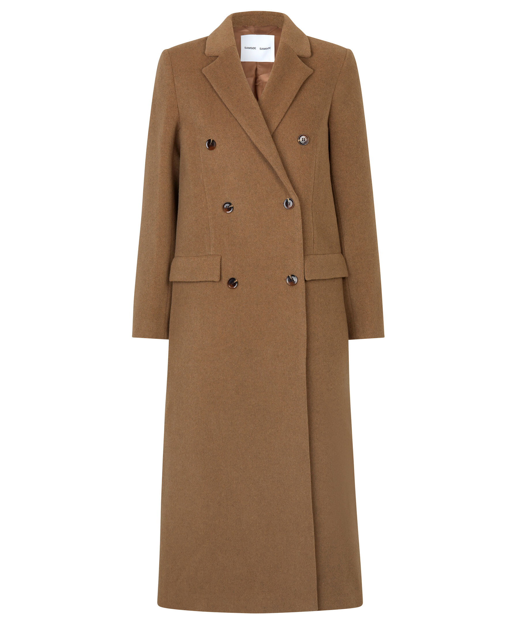 Kamelfärgad, skräddad ullkappa från Samsoe Samsoe. Lång dubbelknäppt kappa med rak skuren kropp. Naggad lapelkrage, flaggade framfickor och lång öppning baktill. Fodrad och tillverkad i ullblandning.